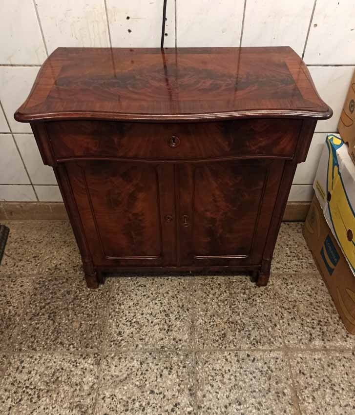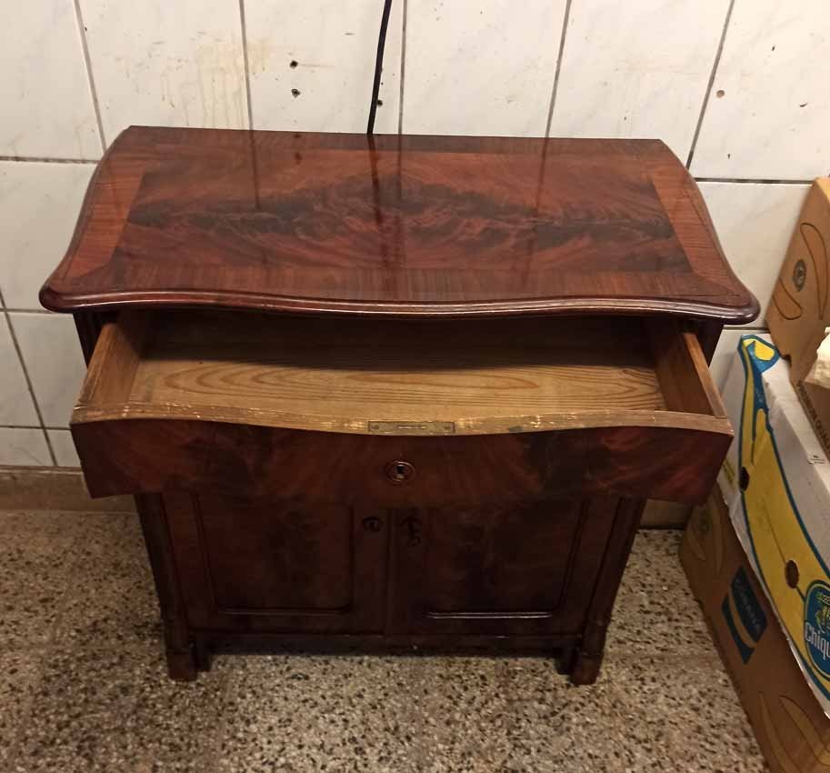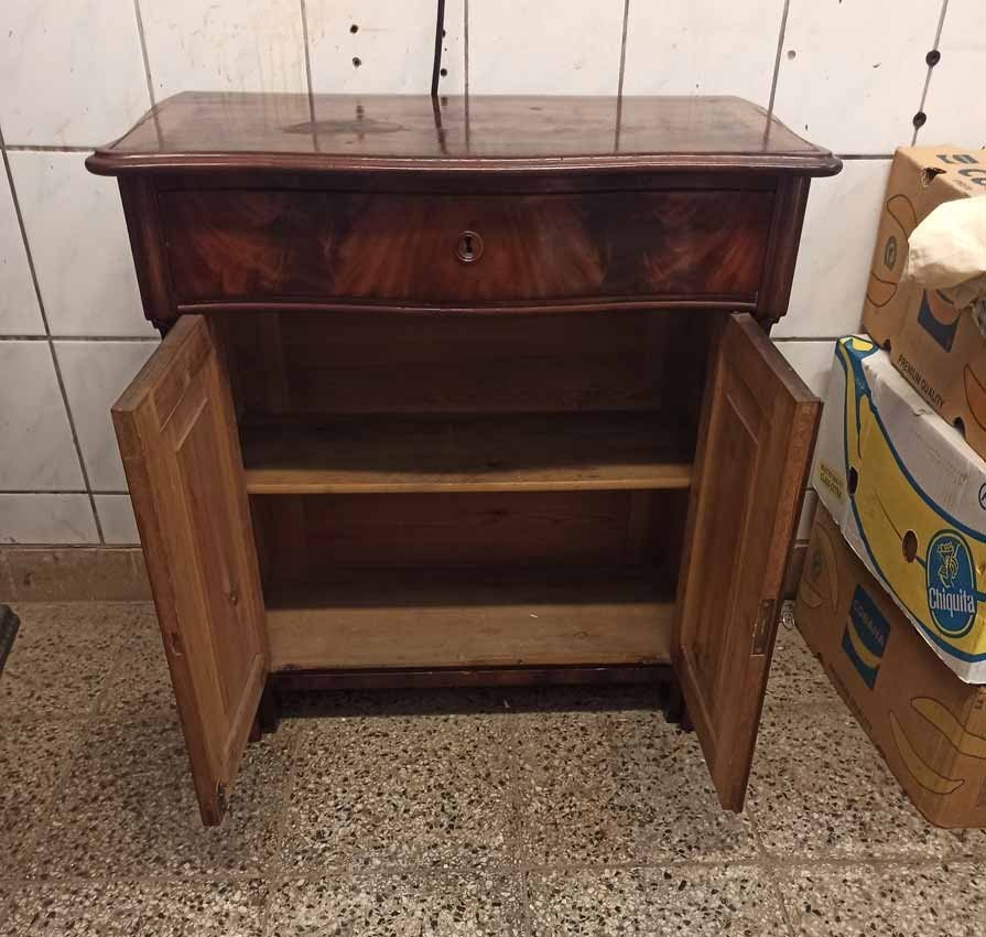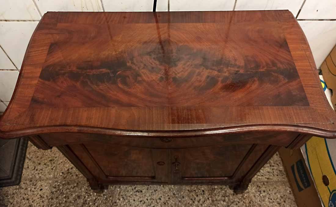 Reserviert!  Kleine Kommode, Schränkchen, zweitürig oben mit Schublade. Mahagoni. Oberteil mit Schublade mit geschwungener Front. Möbel unrestauriert mit Nutzungs- und Gebrauchsspuren aber sofort nutzbar. Zierliches Möbel H. 79 cm,B. 74 cm, T. 37 cm.