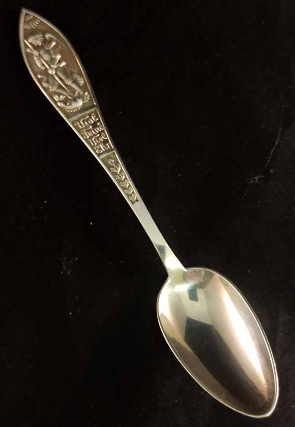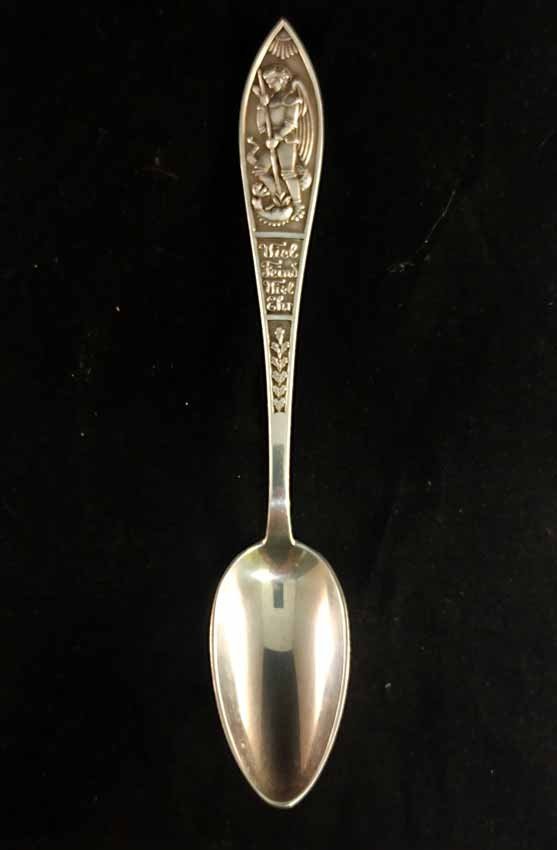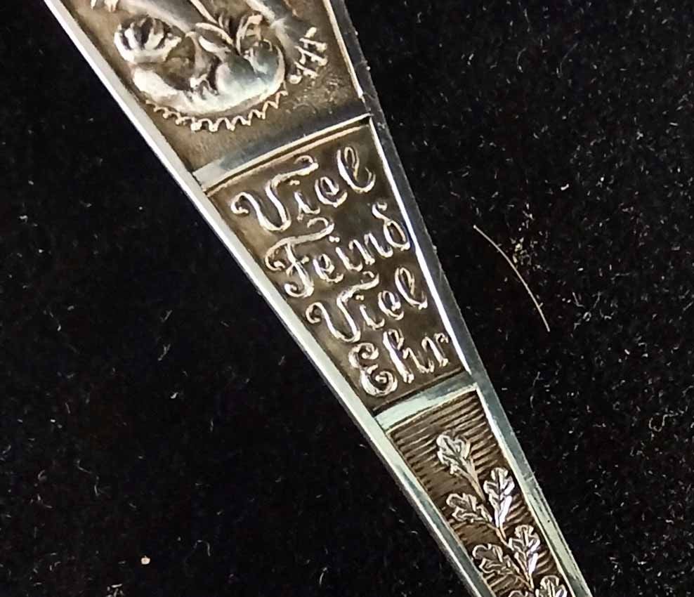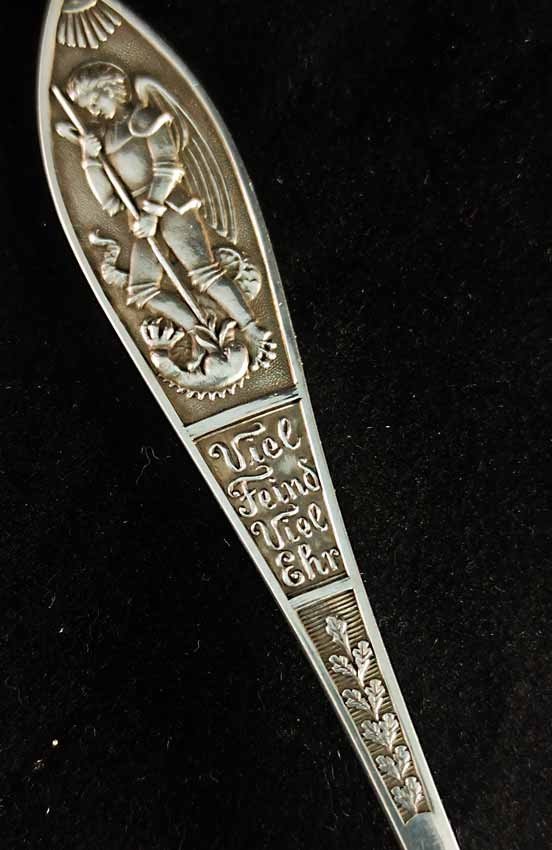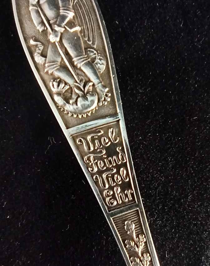 Reserviert! Silberlöffel mit Widmung "Viel Feind viel Ehr" und Darstellung eines Drachentöters, hier sicher Siegfried gemeint. Massiv Silber 800. Sehr guter Zustand. Rs. gestempelt "800, Mond, Krone" . Rs. ebenfalls Monogr.: "ER".  L. ca 15 cm.