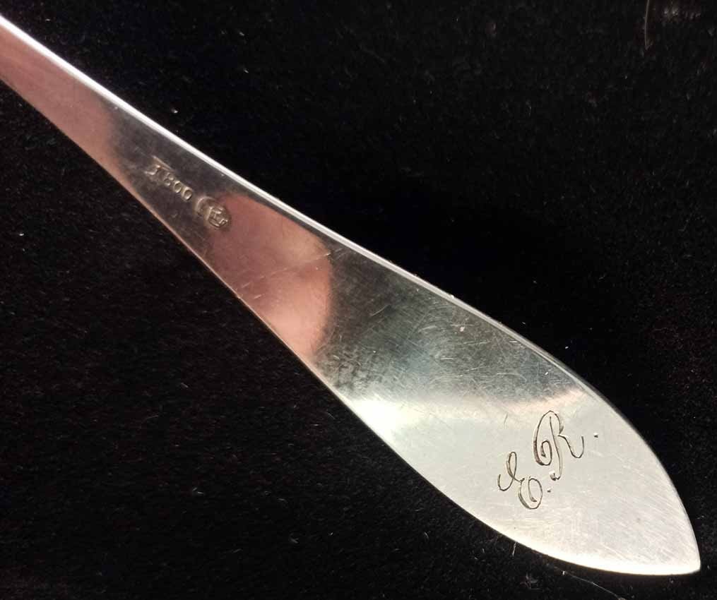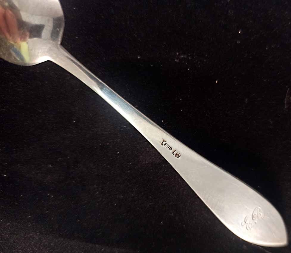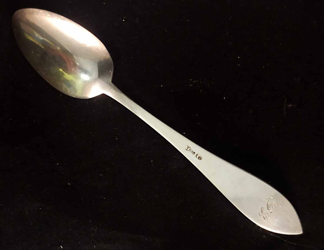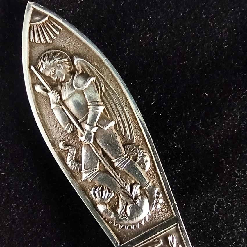Reserviert! Silberlöffel mit Widmung "Viel Feind viel Ehr" und Darstellung eines Drachentöters, hier sicher Siegfried gemeint. Massiv Silber 800. Sehr guter Zustand. Rs. gestempelt "800, Mond, Krone" . Rs. ebenfalls Monogr.: "ER".  L. ca 15 cm.