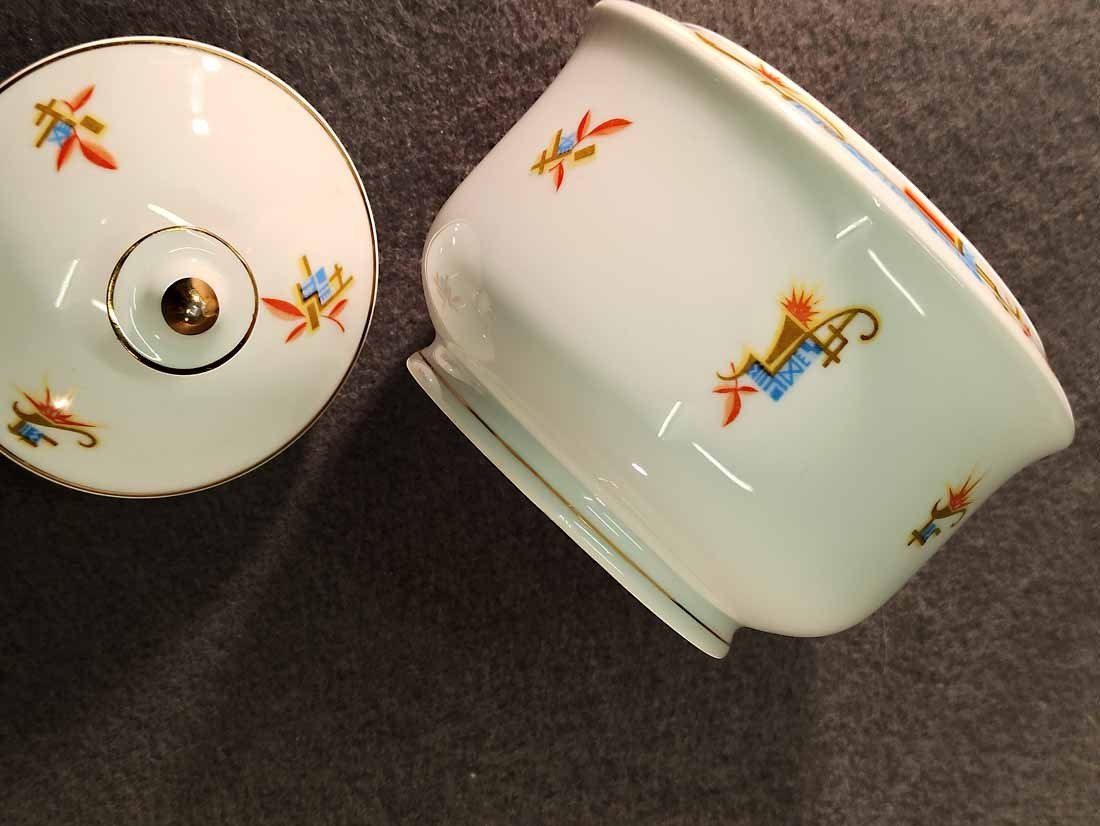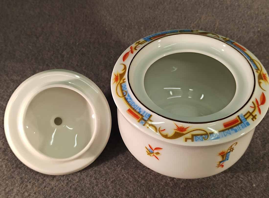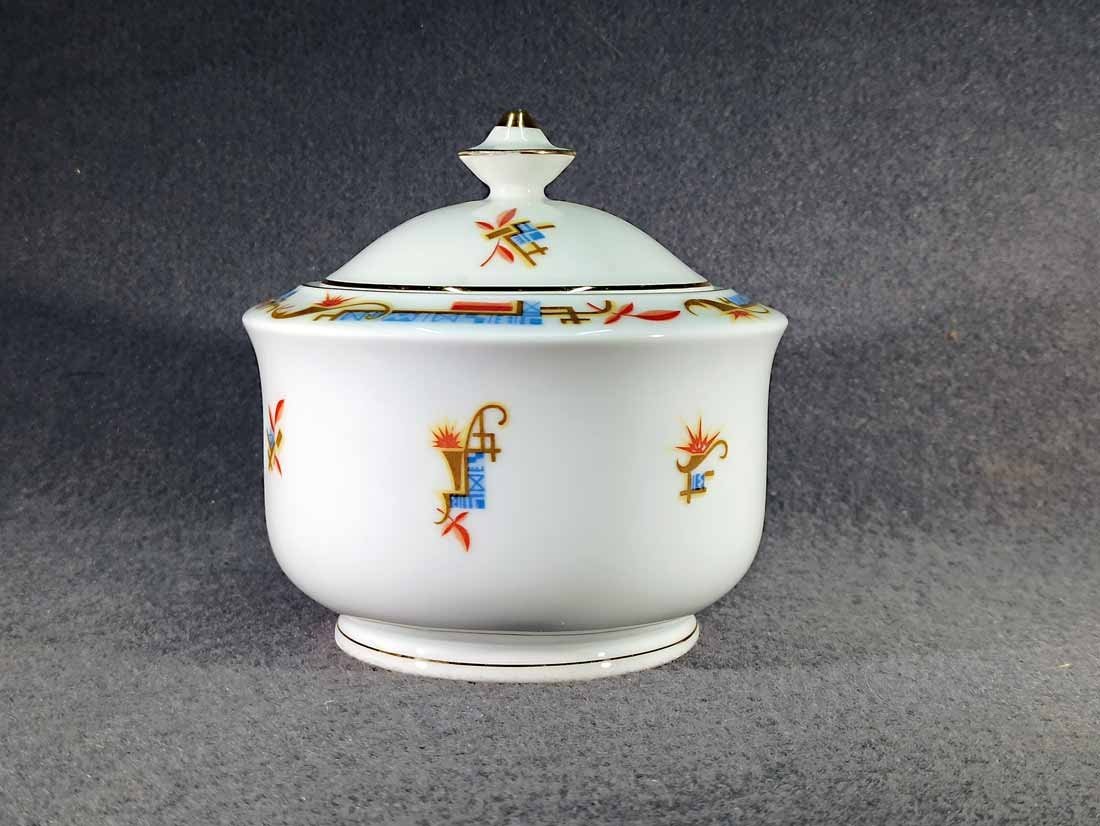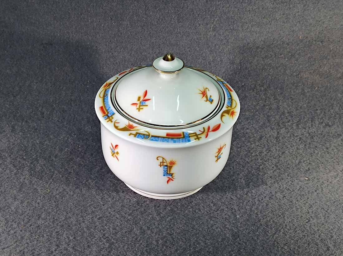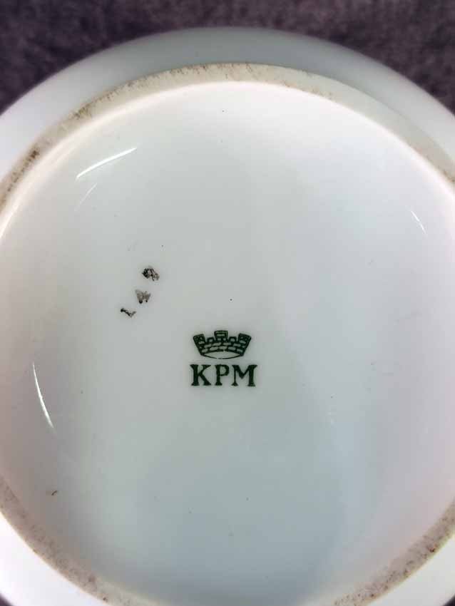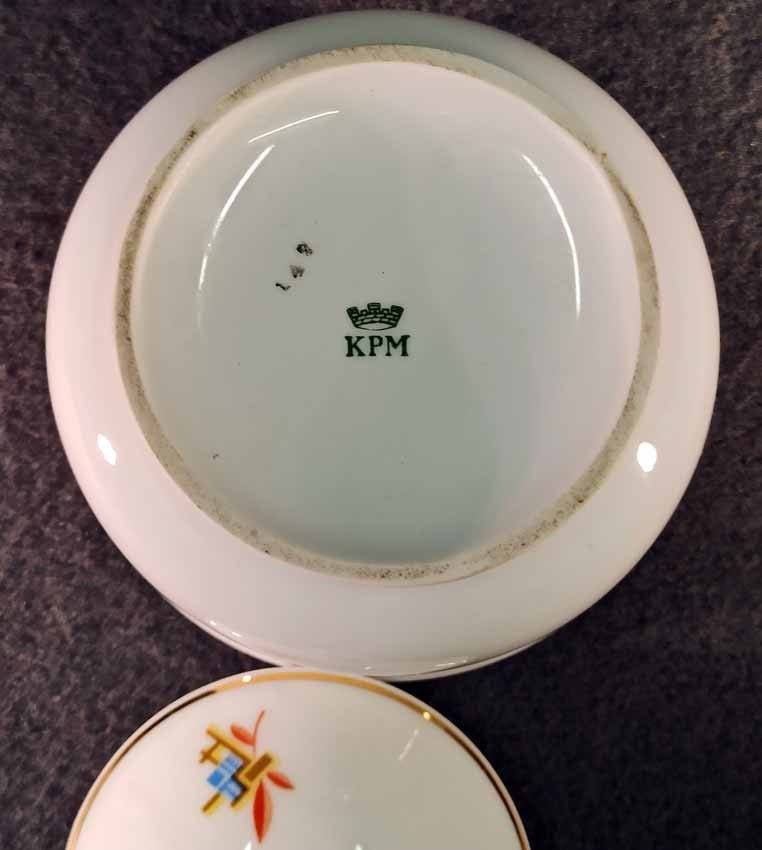 Bonboniere, Deckeldose Art Deco um 1920. Interessanter Dekor und Form. H. ca 11,5 cm, D. ca 12 cm. Gemarkt KPM unter Krone. Sehr guter Zustand ohne Beschädigungen.