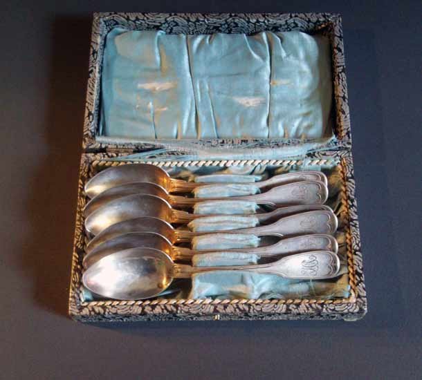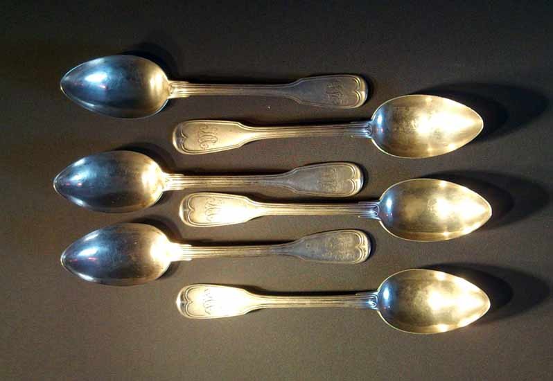 6 Kaffelöffel, Silber; Mitte/Ende 19.Jh. L. 15cm Gestempelt: "H.Mau 12 Loth Silber" . Gew.: 135 g
