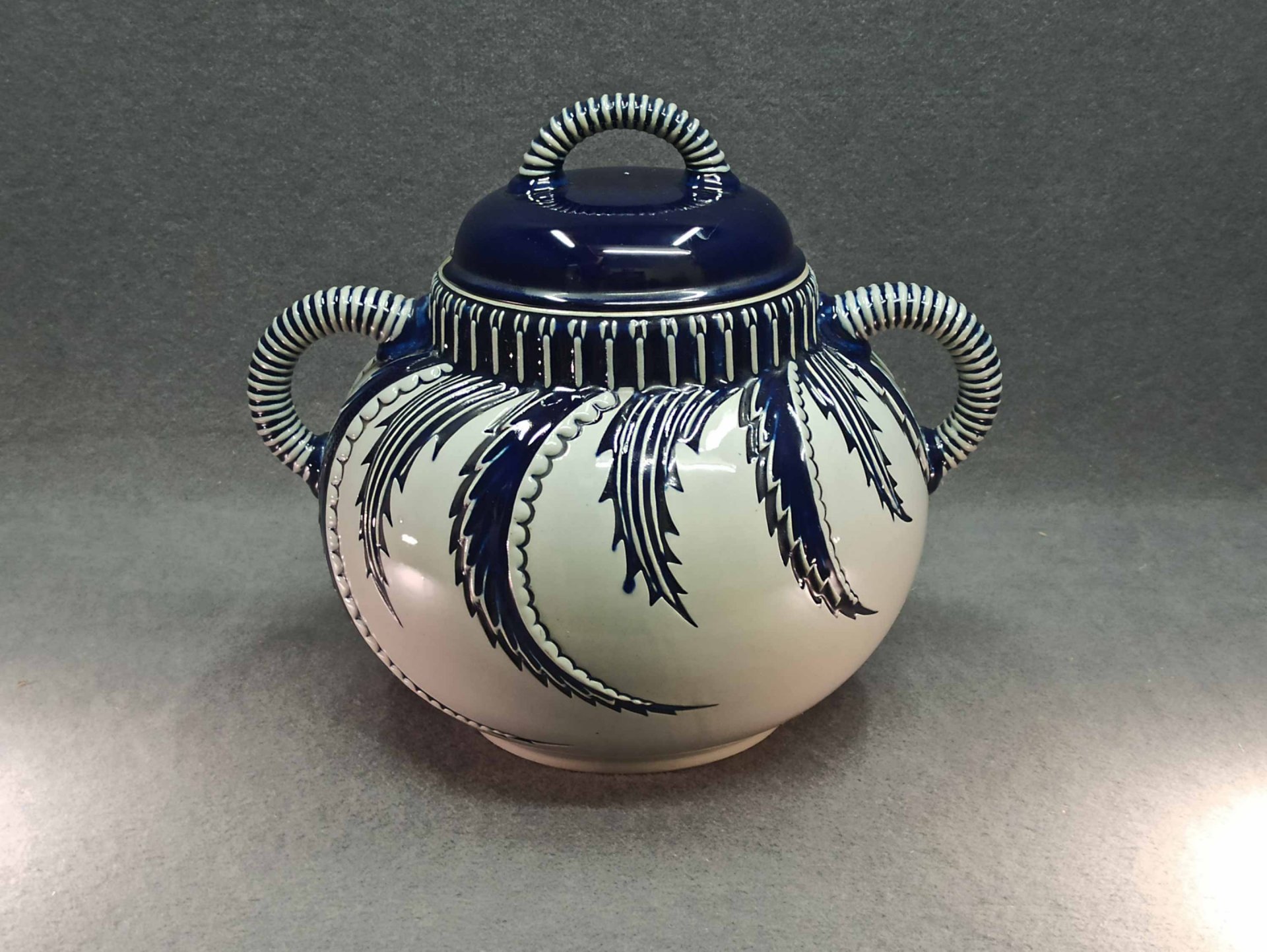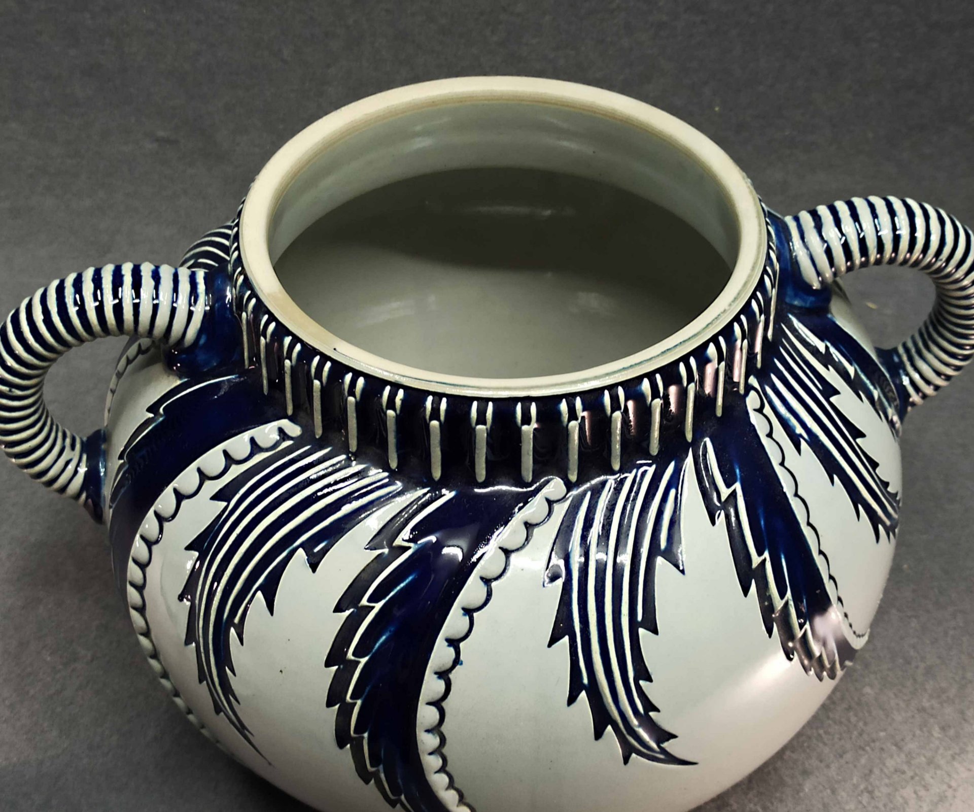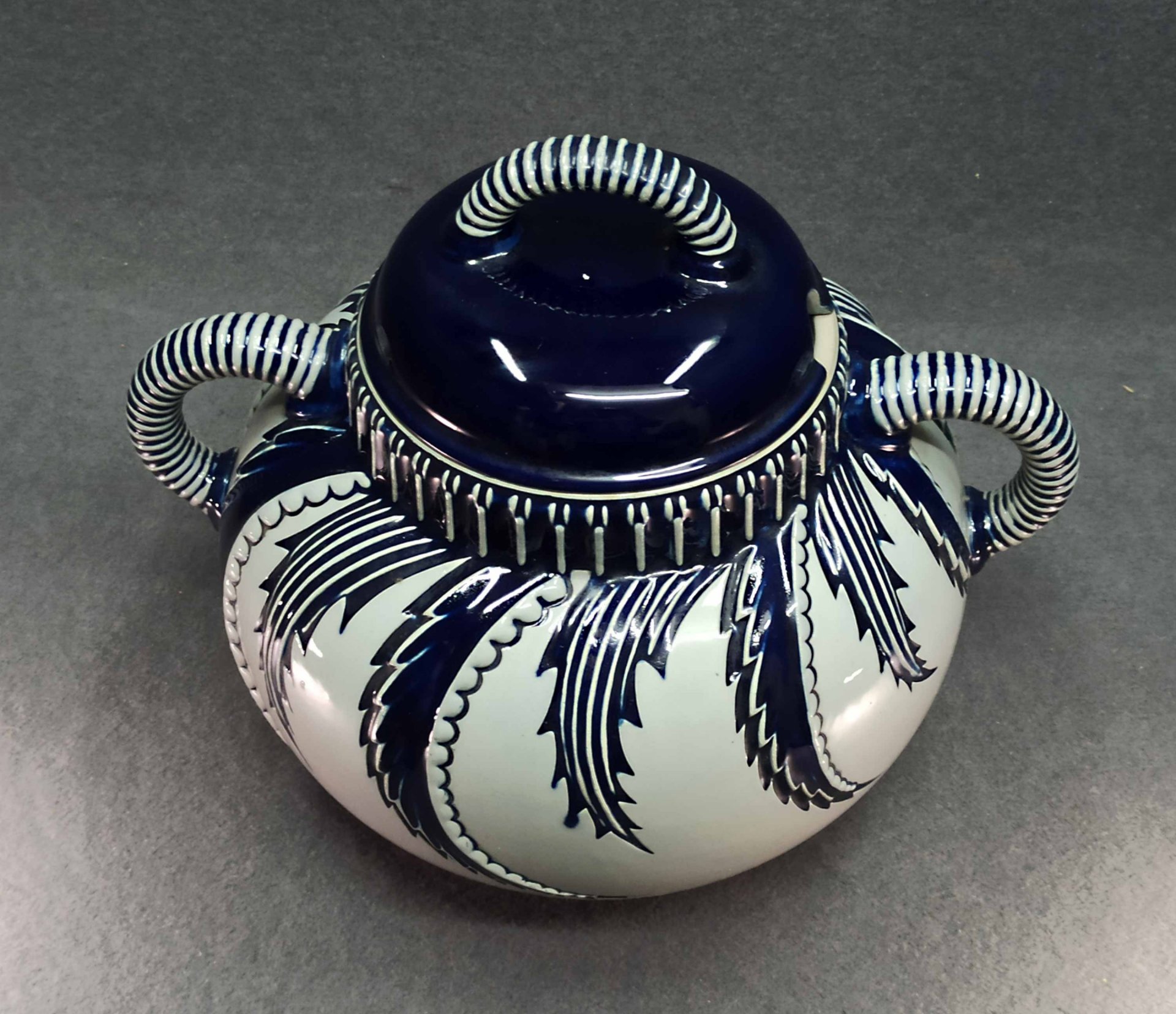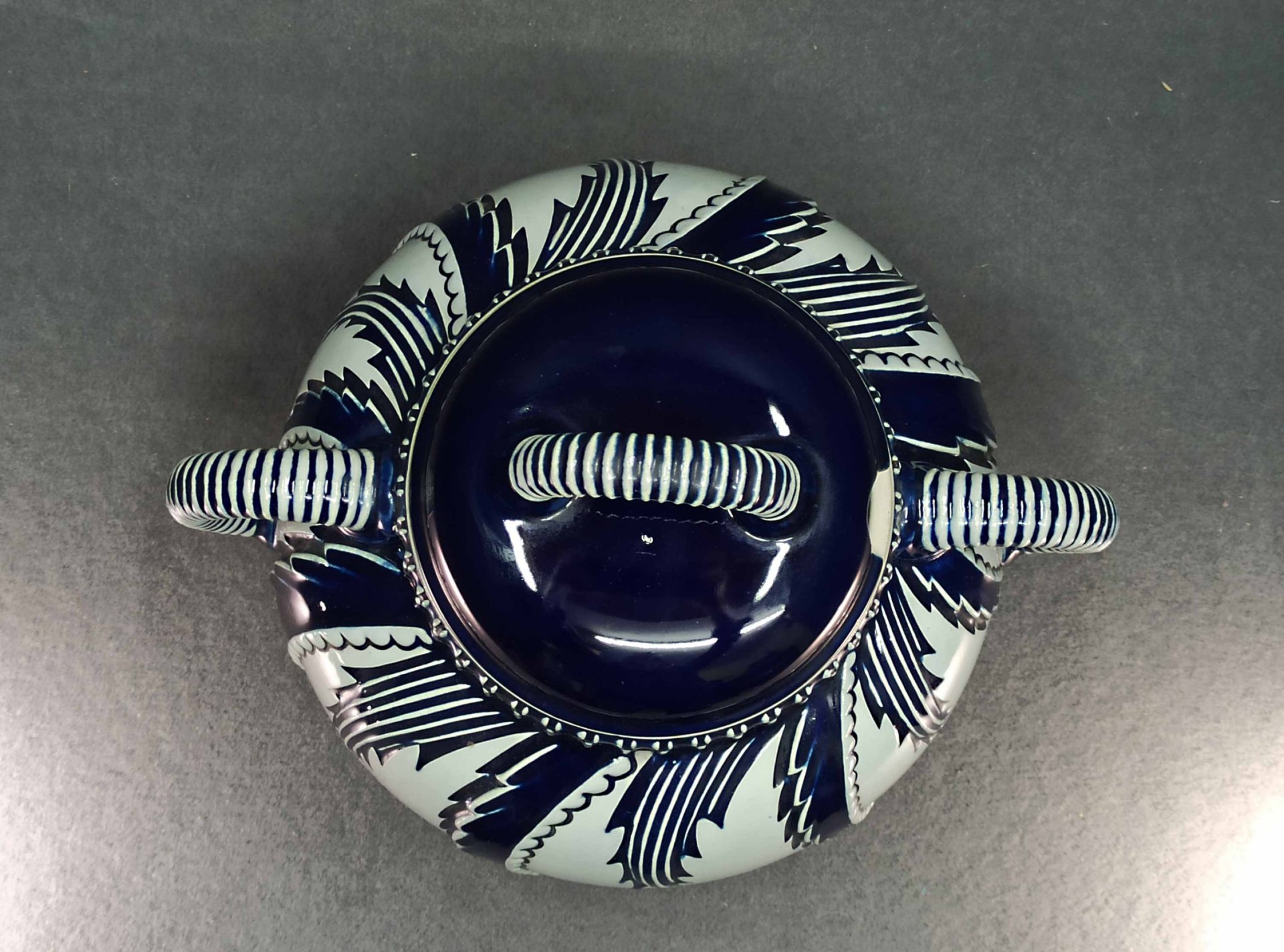 Art Deco Bowle. Entw.: Franz Nachtmann für Reinhold Merkelbach, Grenzhausen von 1929.Graues Steinzeug, Salzglasur mit kobaltblauer Malerei. Kugeliger Korpus mit Doppelhenkel; stilisierter Blattdekor im Art Deco Stil.