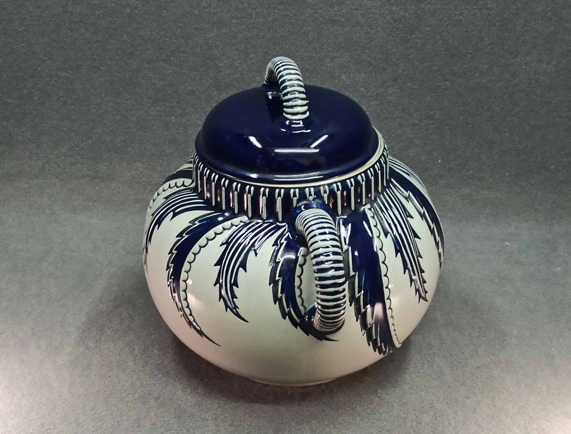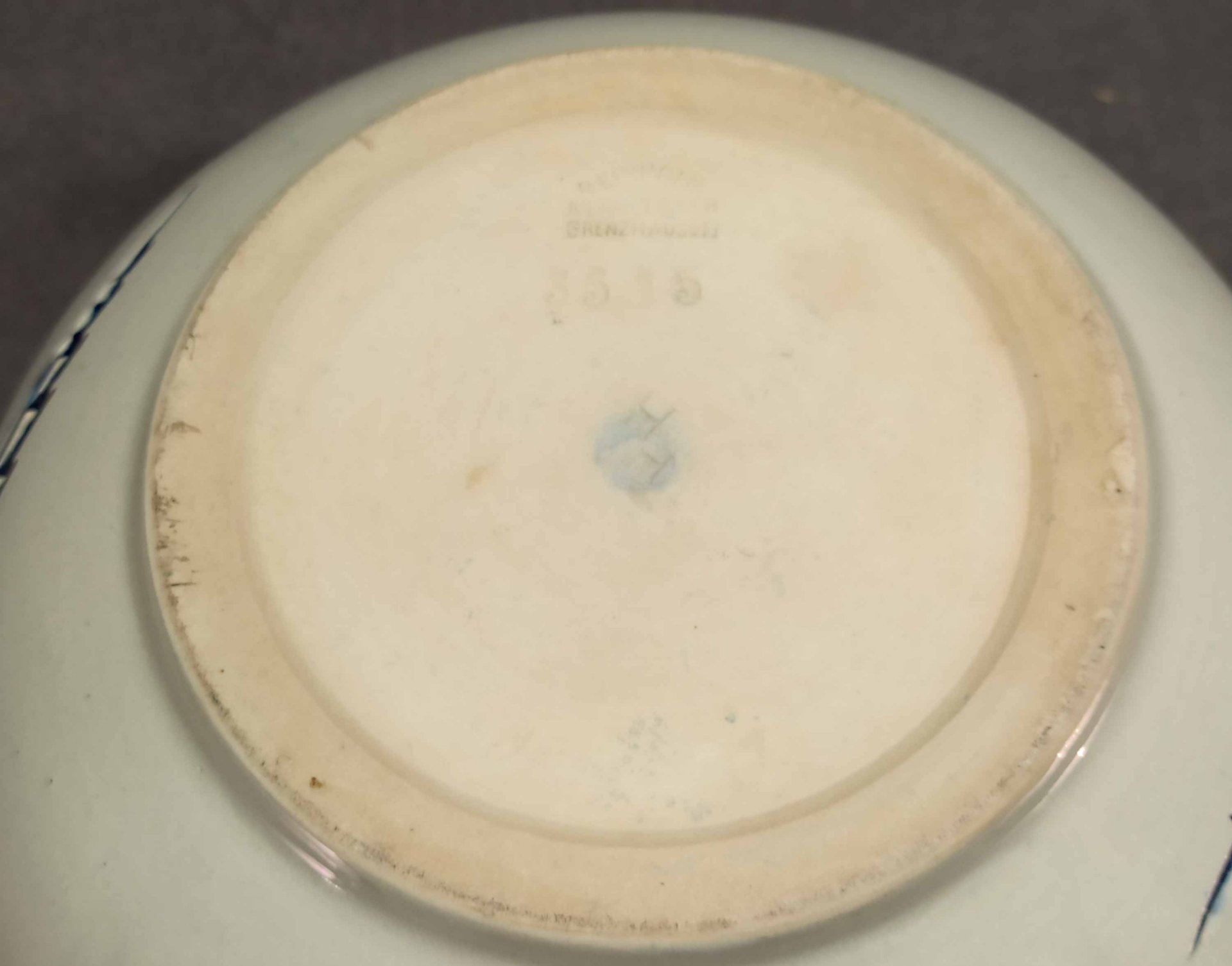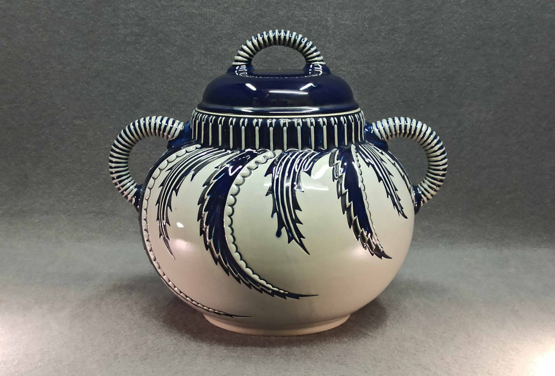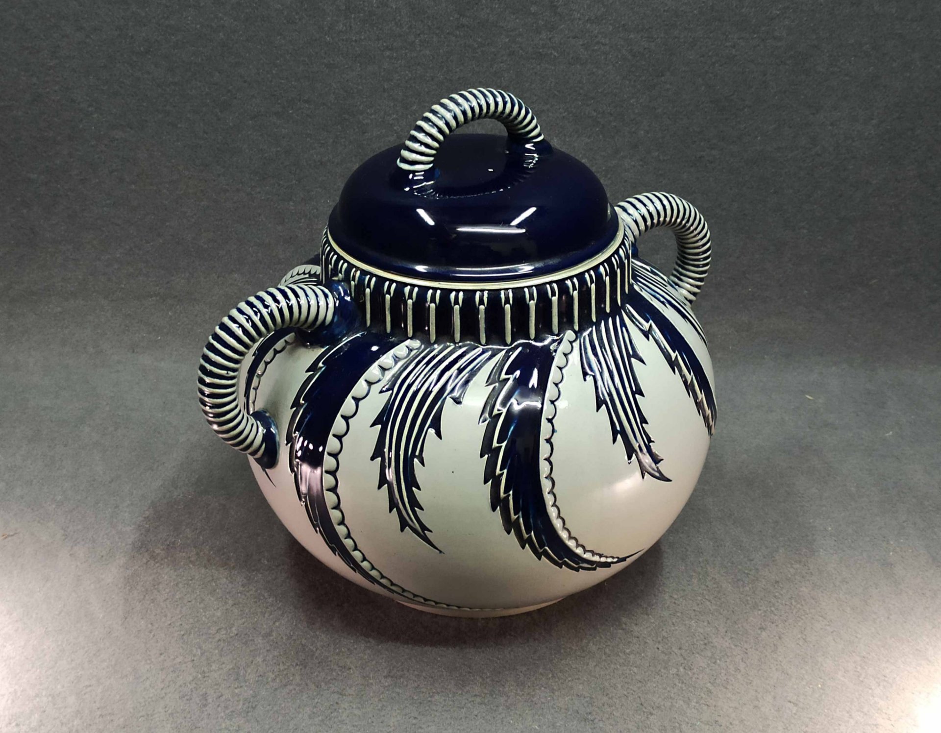 Art Deco Bowle. Entw.: Franz Nachtmann für Reinhold Merkelbach, Grenzhausen von 1929.Graues Steinzeug, Salzglasur mit kobaltblauer Malerei. Kugeliger Korpus mit Doppelhenkel; stilisierter Blattdekor im Art Deco Stil.