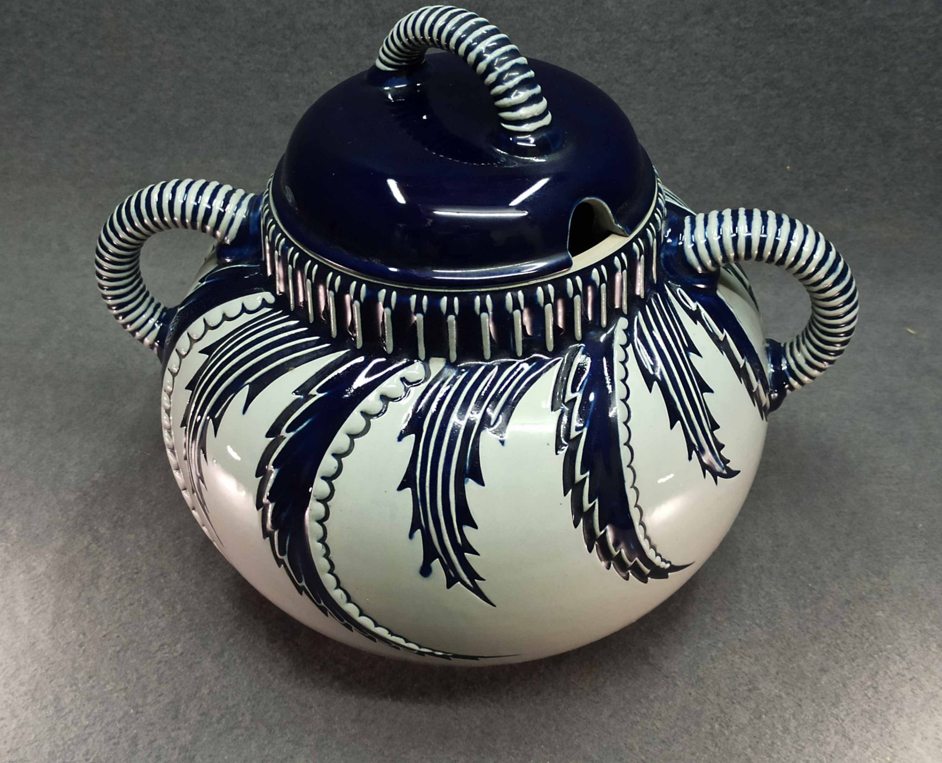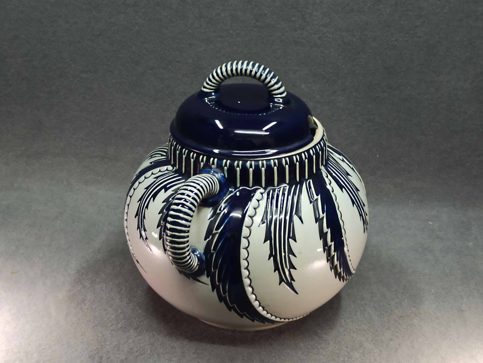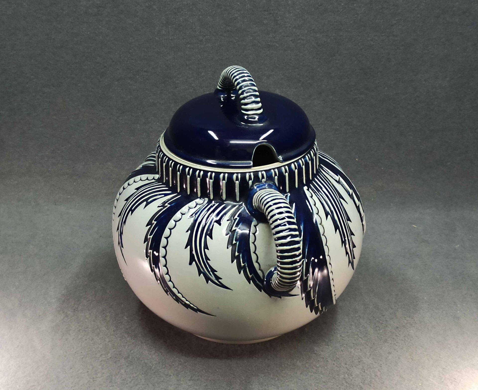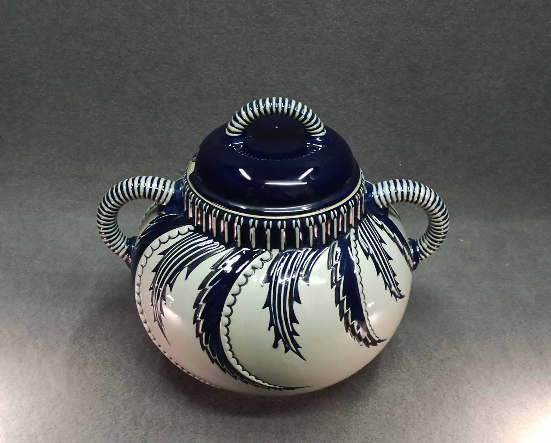 Art Deco Bowle. Entw.: Franz Nachtmann für Reinhold Merkelbach, Grenzhausen von 1929.Graues Steinzeug, Salzglasur mit kobaltblauer Malerei. Kugeliger Korpus mit Doppelhenkel; stilisierter Blattdekor im Art Deco Stil.