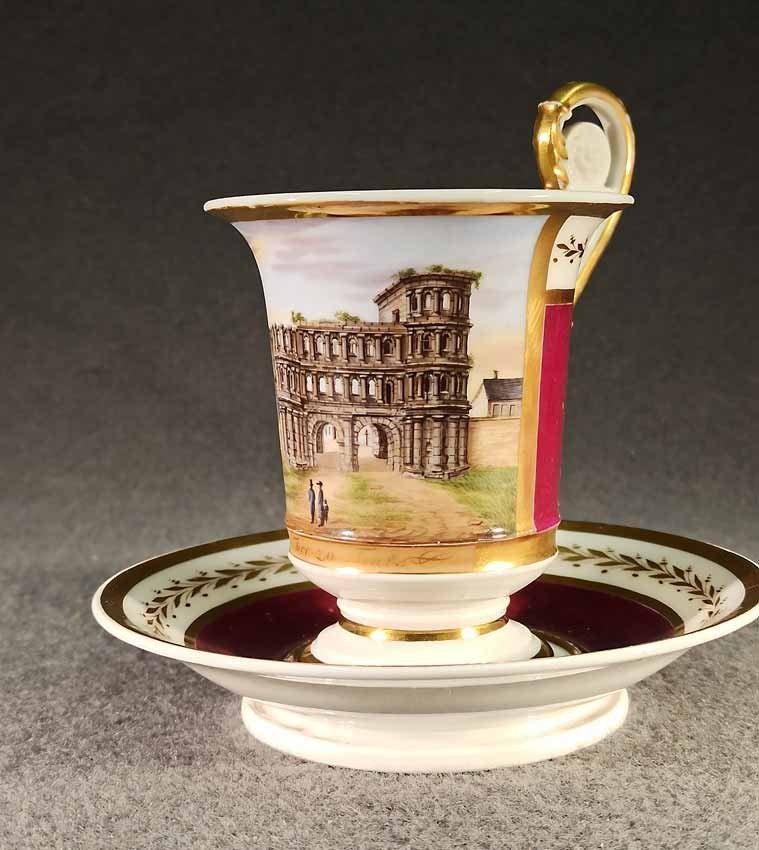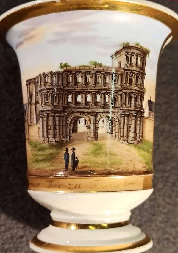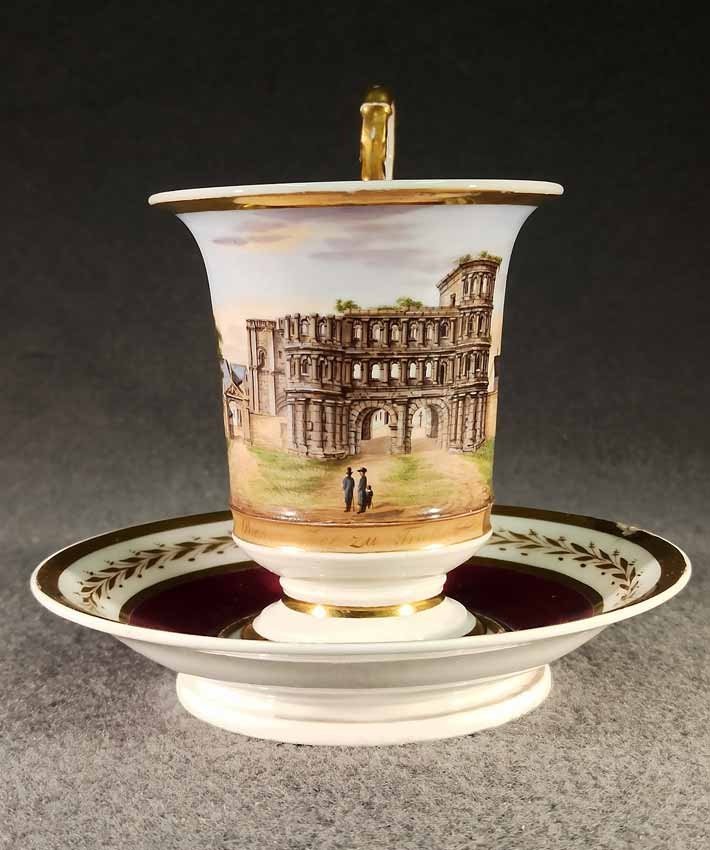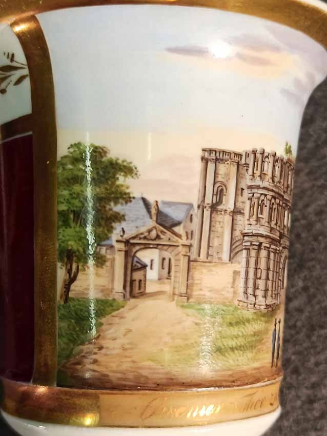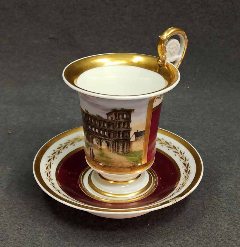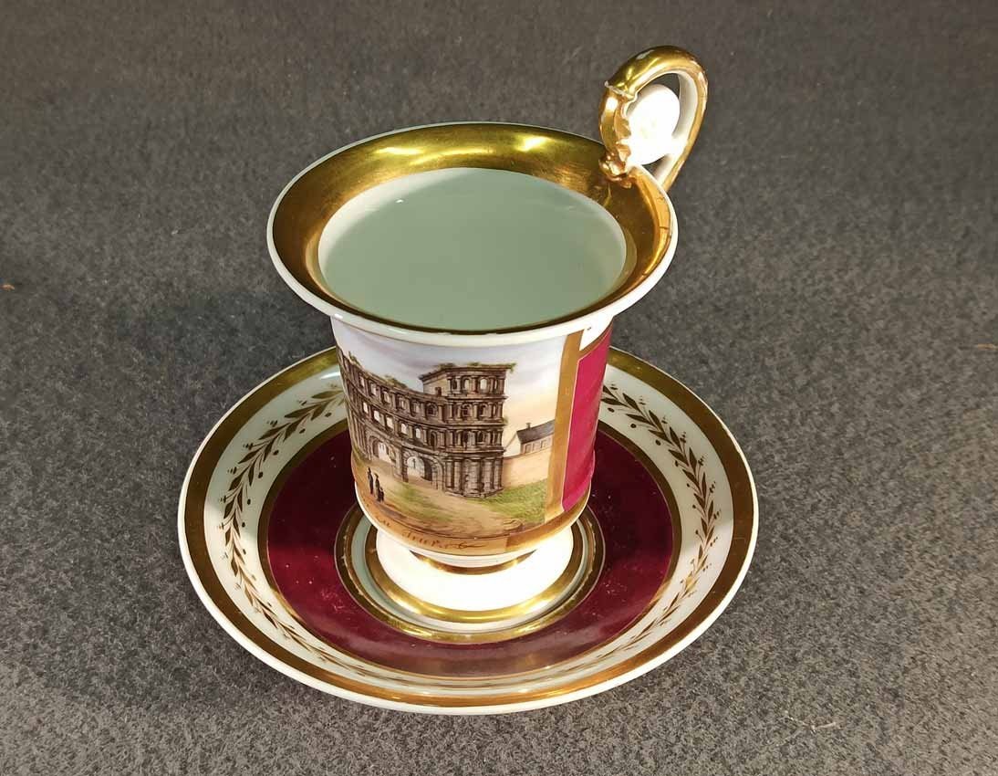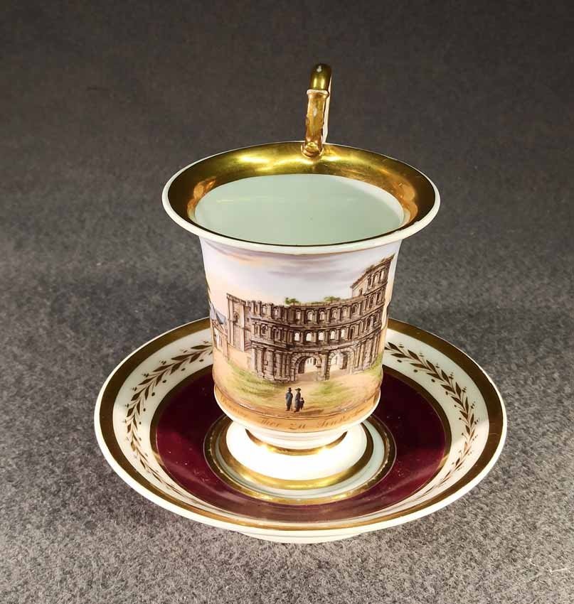 Reserviert! Bildertasse Anf. 19.Jh. mit Ansicht von Trier, Römer Tor. Kratertasse gefußt mit Biskuit Löwenkopfhenkel. Gold und Purpur gegliederte Tasse, schauseitig Rechteckkartusche mit Ansicht von Trier. Darunter in Gold bezeichnet "Roemer Thor zu Trier". Original Untertasse, diese mit alter Reperatur am Rand. Ungemarkt, Die Tasse am Boden bezeichnet mit "J. Warlang Maler in Trier". Tasse H.9,5/12 cm, D. 8,5 cm; U-Tasse D. 13,5 cm.