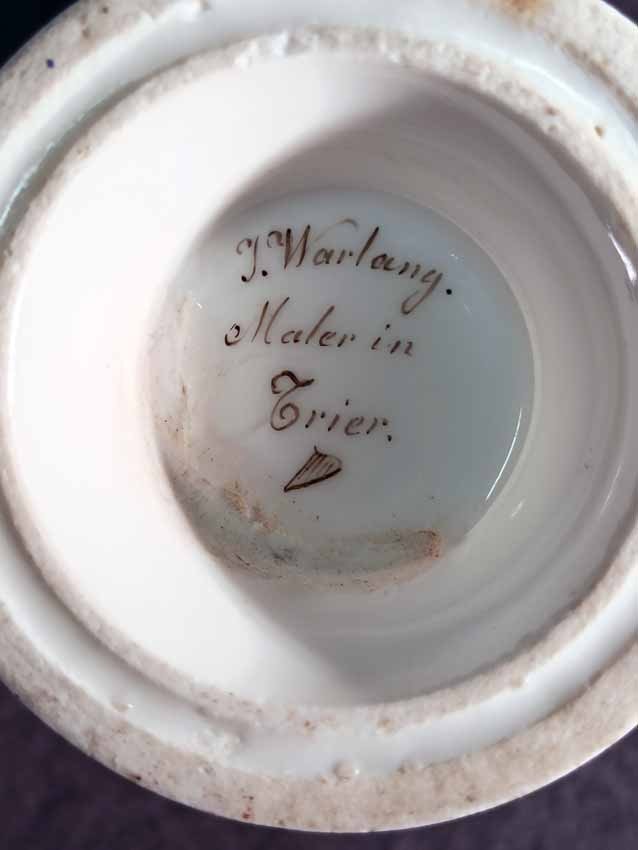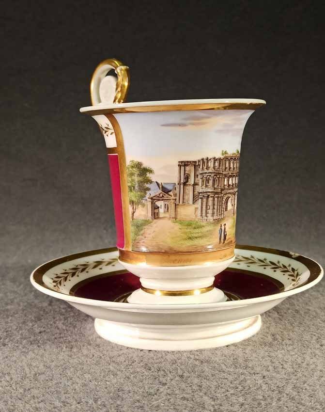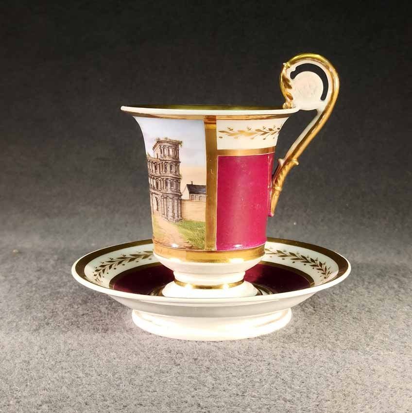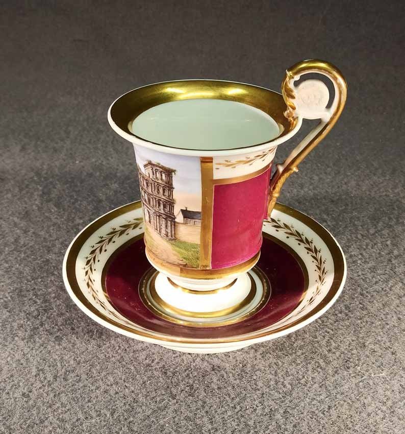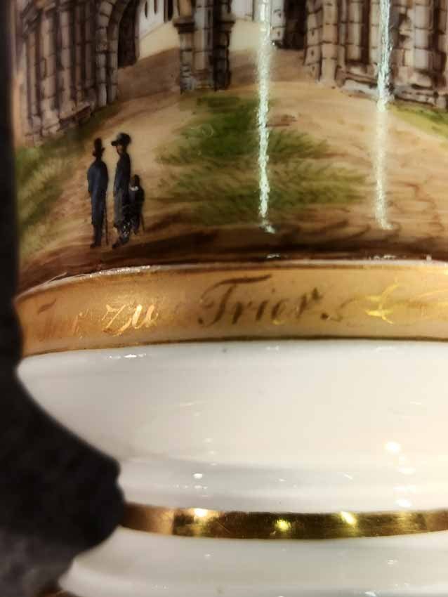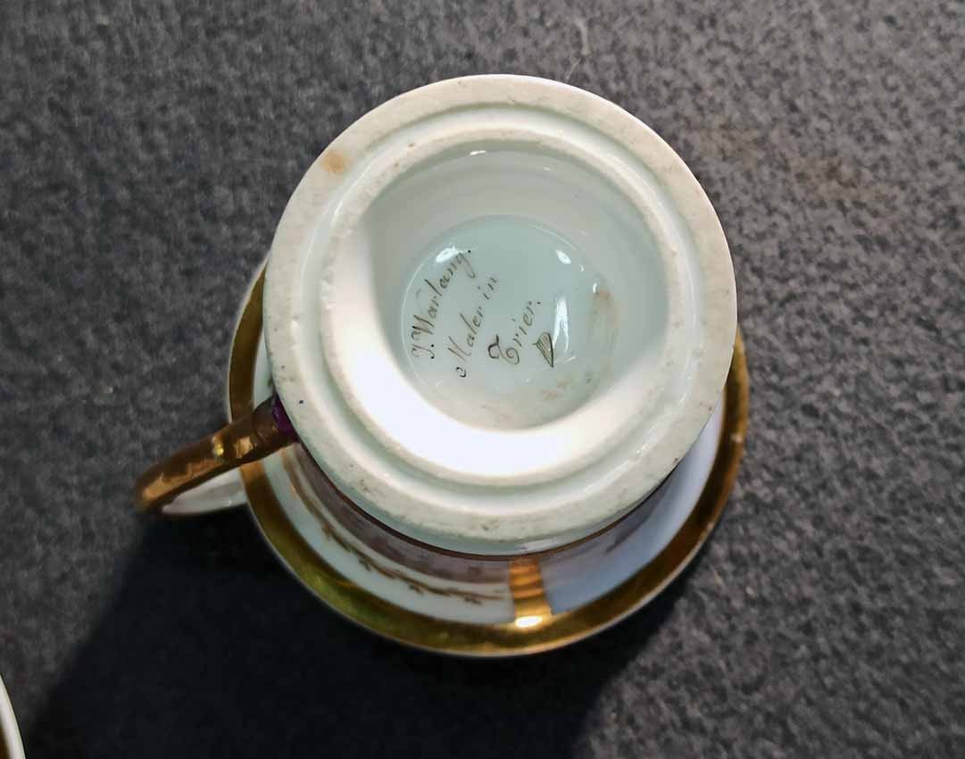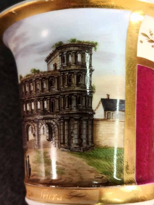 Reserviert! Bildertasse Anf. 19.Jh. mit Ansicht von Trier, Römer Tor. Kratertasse gefußt mit Biskuit Löwenkopfhenkel. Gold und Purpur gegliederte Tasse, schauseitig Rechteckkartusche mit Ansicht von Trier. Darunter in Gold bezeichnet "Roemer Thor zu Trier". Original Untertasse, diese mit alter Reperatur am Rand. Ungemarkt, Die Tasse am Boden bezeichnet mit "J. Warlang Maler in Trier". Tasse H.9,5/12 cm, D. 8,5 cm; U-Tasse D. 13,5 cm.