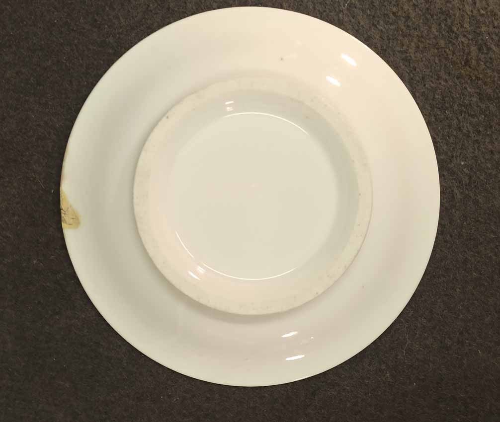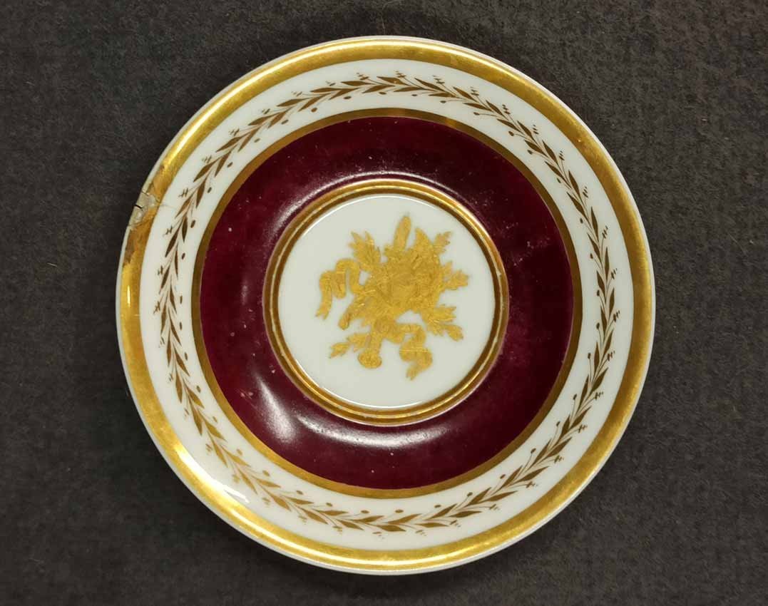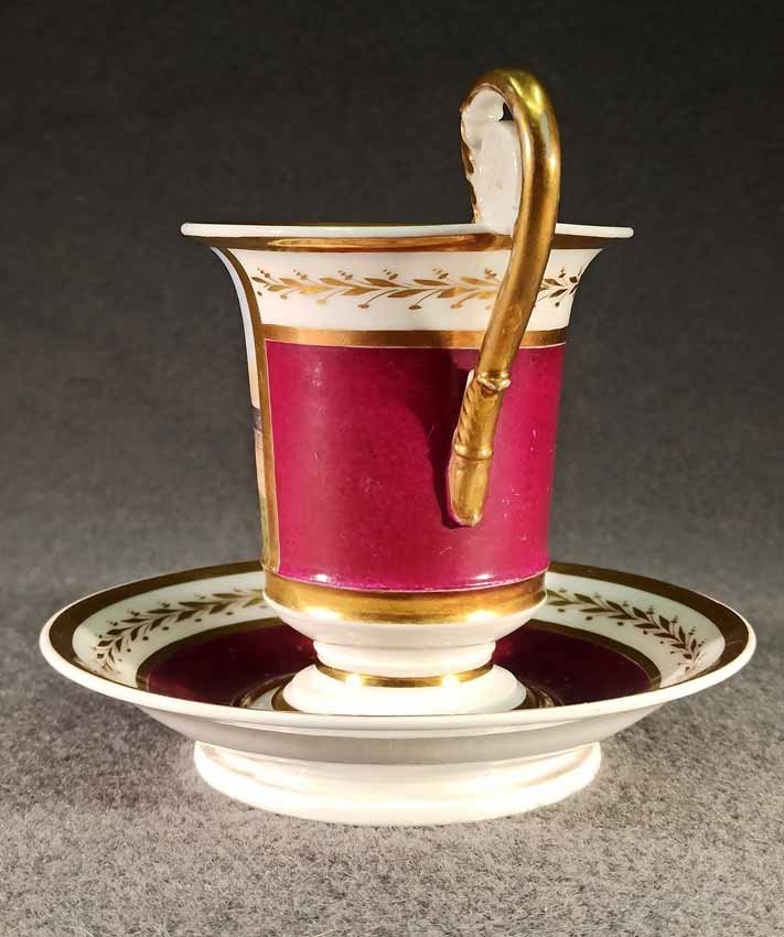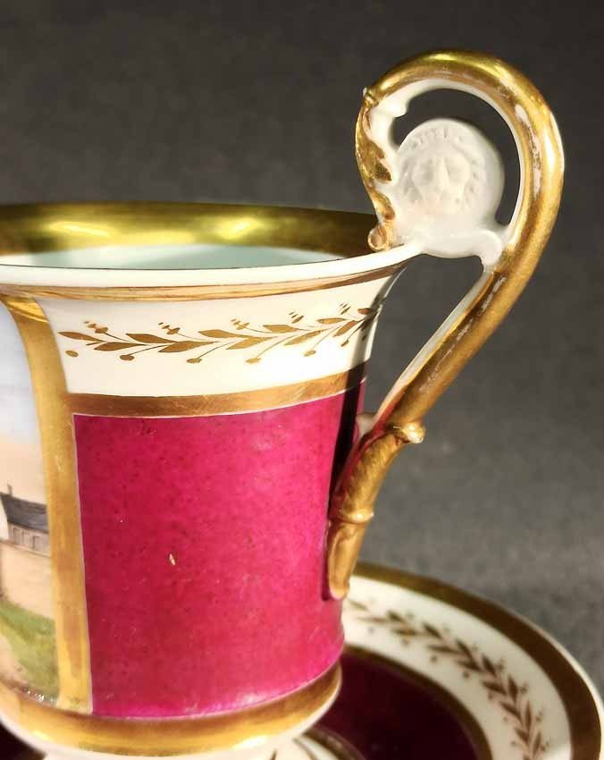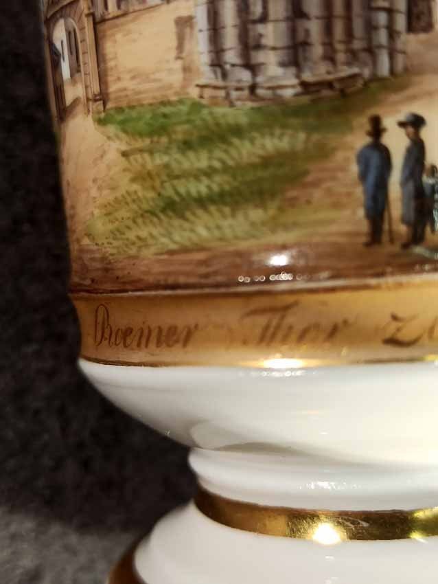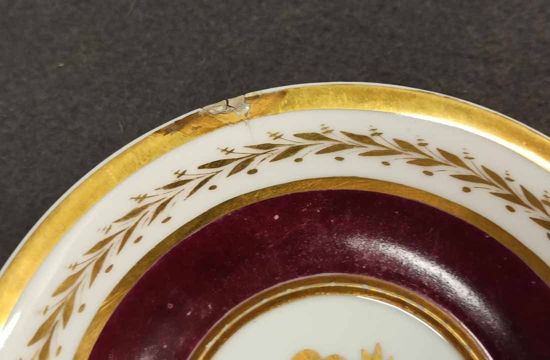 Reserviert! Bildertasse Anf. 19.Jh. mit Ansicht von Trier, Römer Tor. Kratertasse gefußt mit Biskuit Löwenkopfhenkel. Gold und Purpur gegliederte Tasse, schauseitig Rechteckkartusche mit Ansicht von Trier. Darunter in Gold bezeichnet "Roemer Thor zu Trier". Original Untertasse, diese mit alter Reperatur am Rand. Ungemarkt, Die Tasse am Boden bezeichnet mit "J. Warlang Maler in Trier". Tasse H.9,5/12 cm, D. 8,5 cm; U-Tasse D. 13,5 cm.