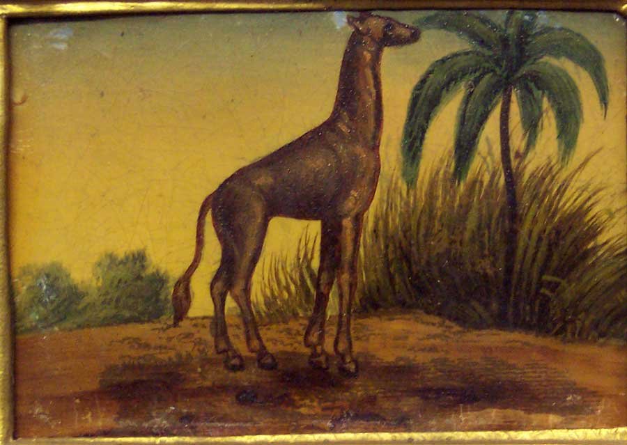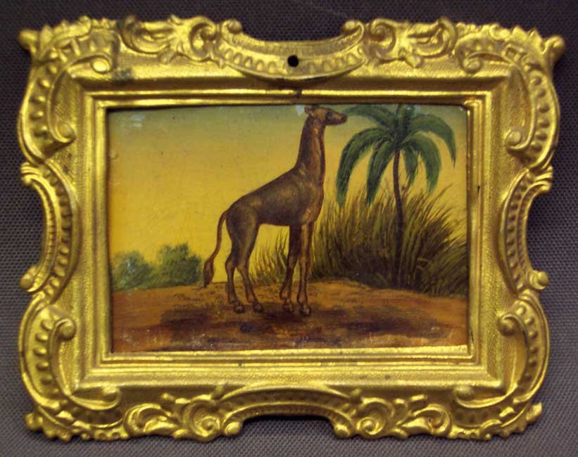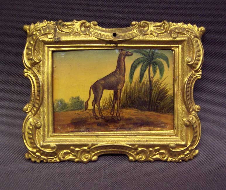 Nicht mehr verfügbar!! Bild aus Puppenstube von ca 1850/80. Giraffe in exotischer Landschaft. Sehr schön: die naive Darstellung der Giraffe. Das Bild auf Blech in Goldrahmen. Guter Zustand, Fundzustand.