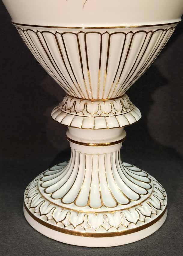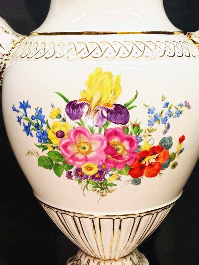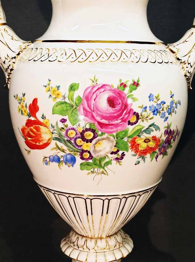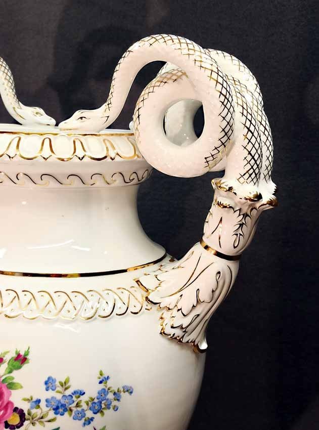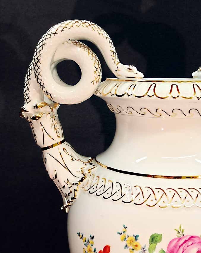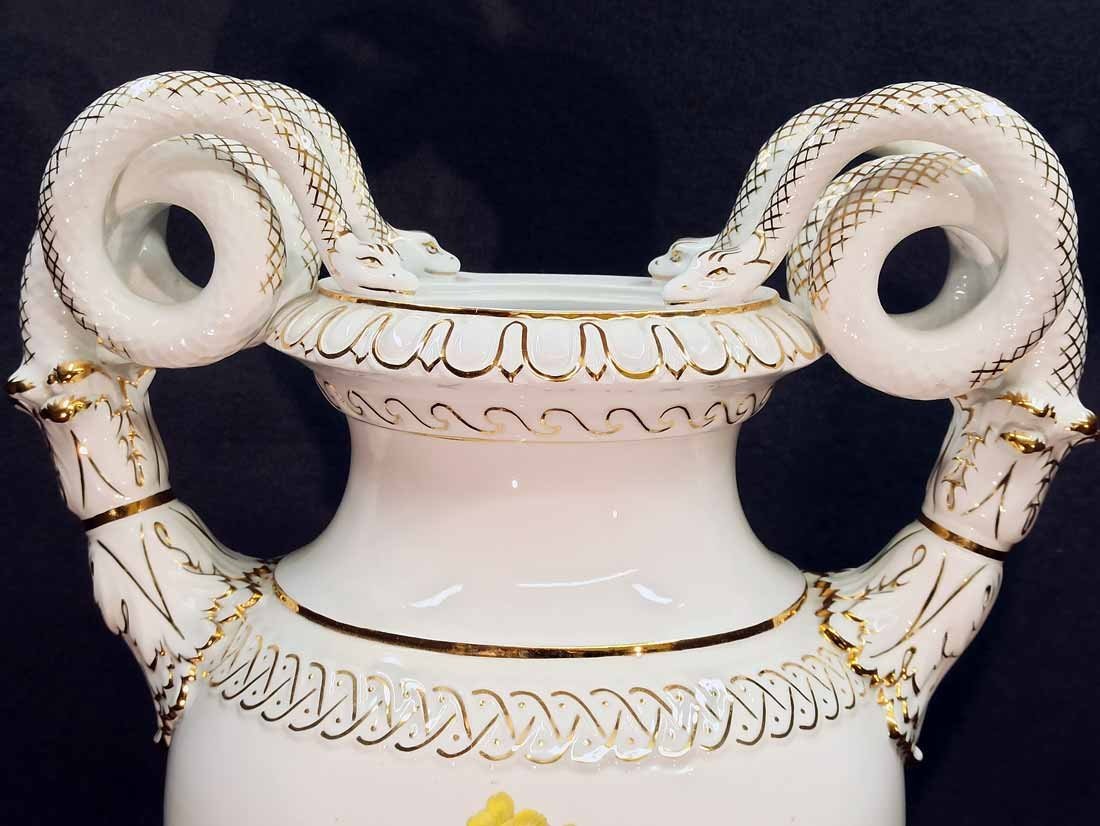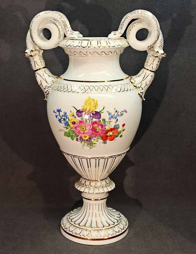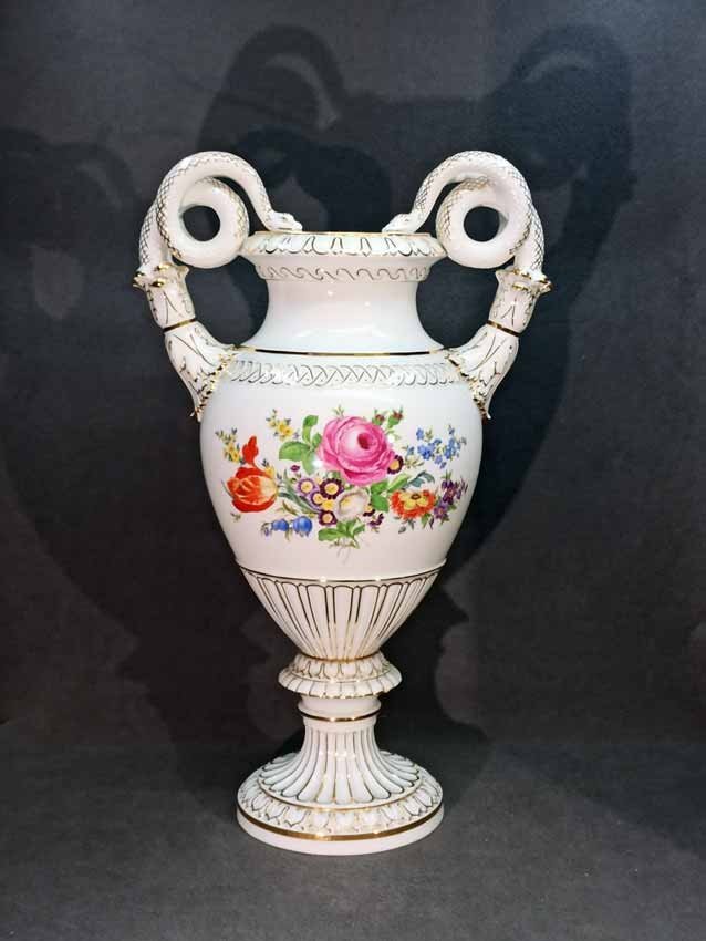 Reserviert! Sehr große Schlangenhenkelvase, H. ca 70 cm. Vorder- und rückseitig je ein reiches Blumenbukett. Seitl. je zwei gewundene Schlangen als Handhaben. Korpus mit Reliefverzierungen; Mäanderbänder., Eierstab, Arkanthusblättern etc. diese vergoldet. Manufaktur Carl Thieme Potschappel bzw. Sächsische Porzellanmanufaktur Dresden in Freital.