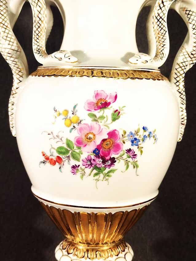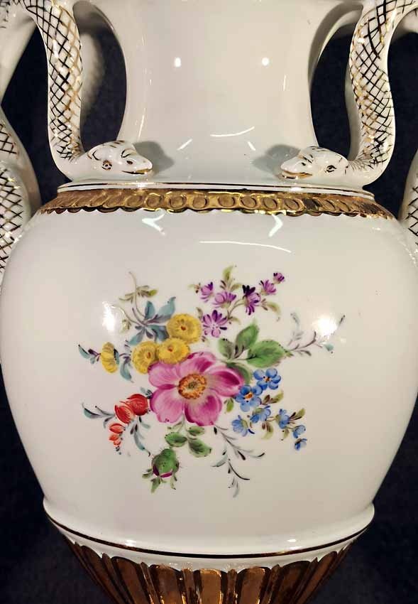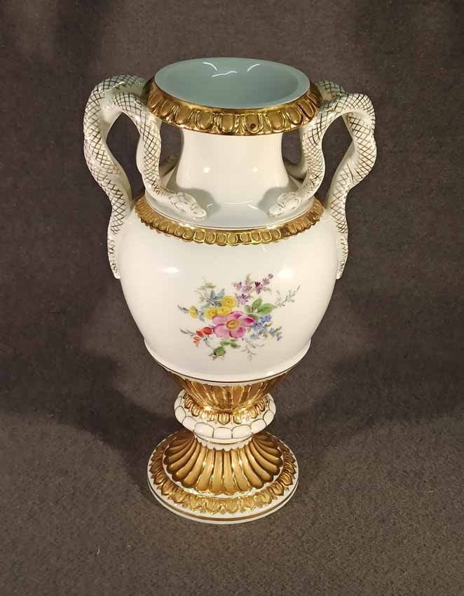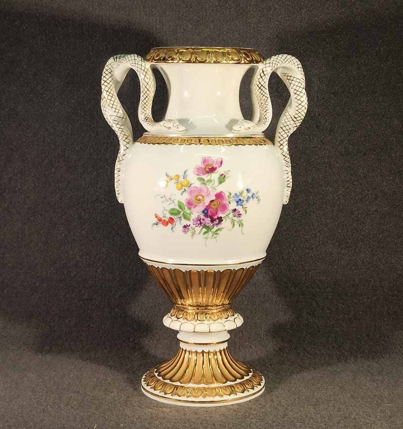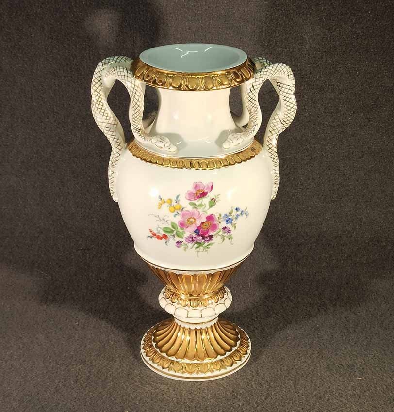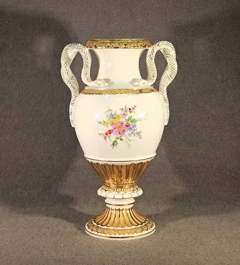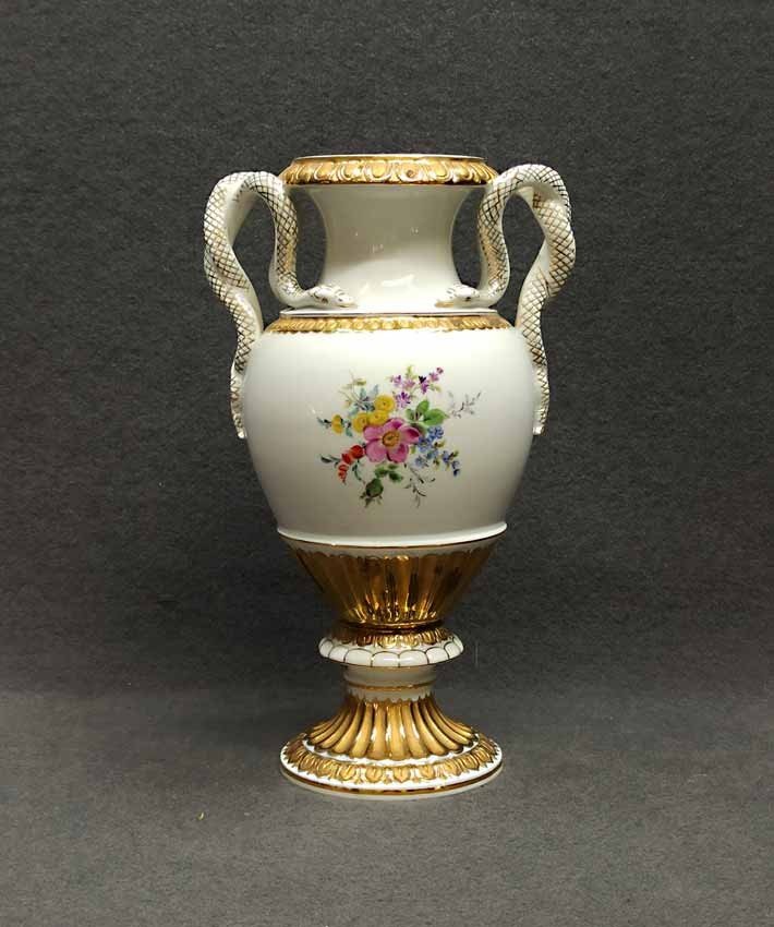 Meissen, Schlangenhenkelvase mit Blumenmalerei und Gold, 1. Wahl