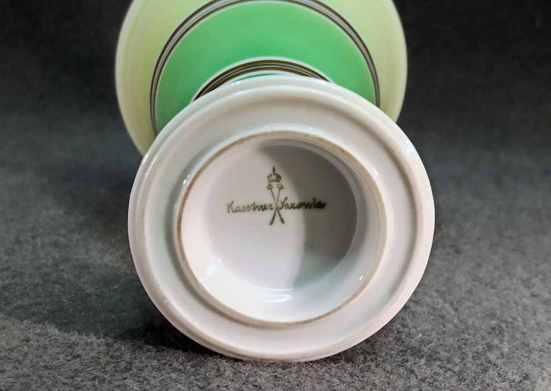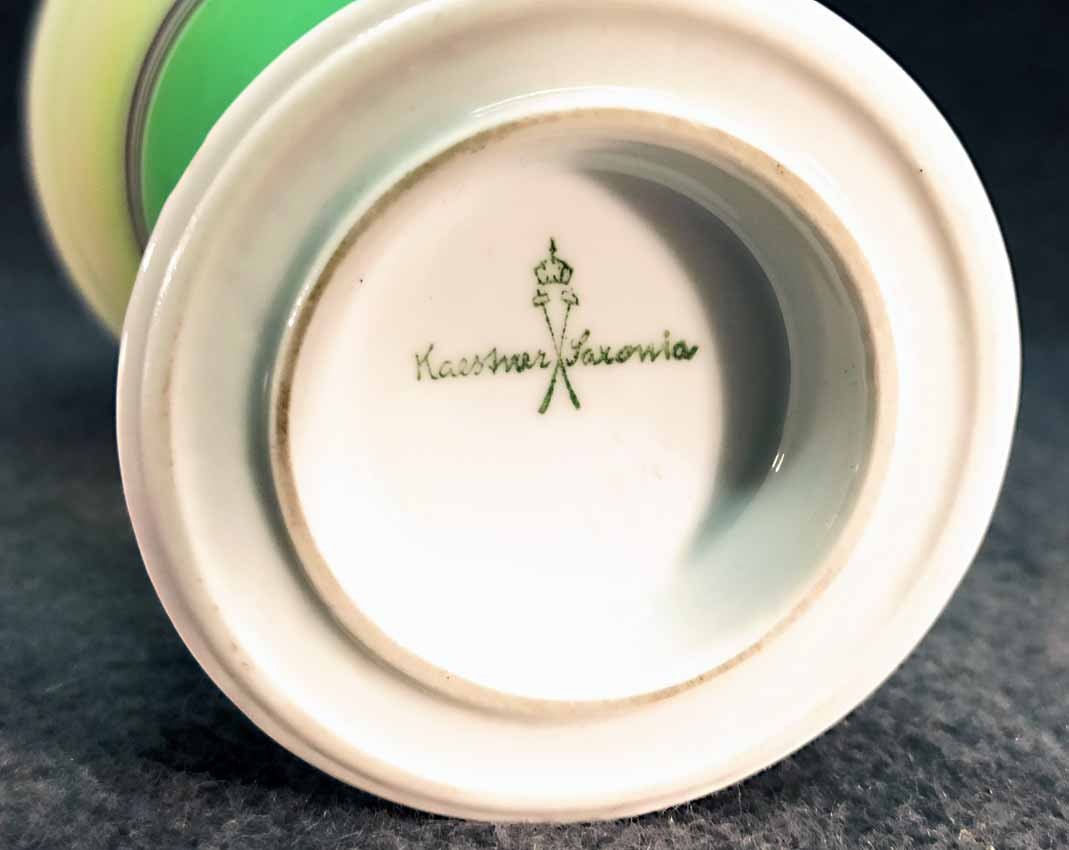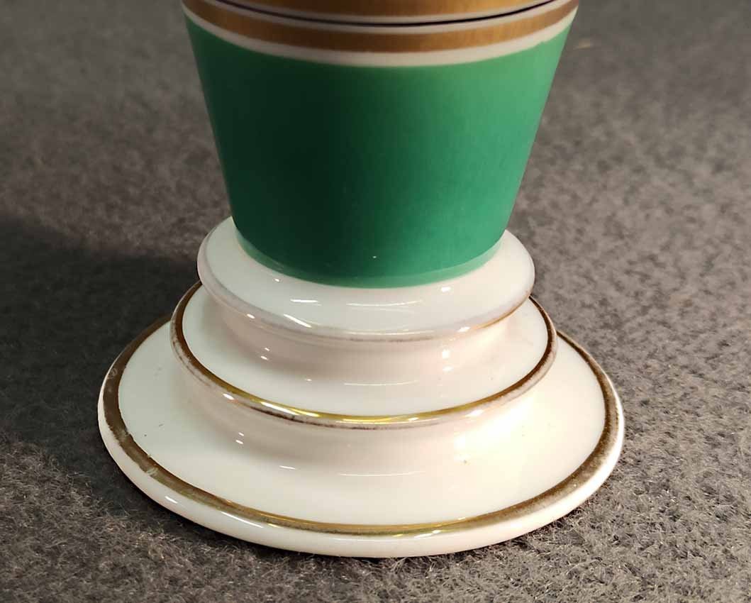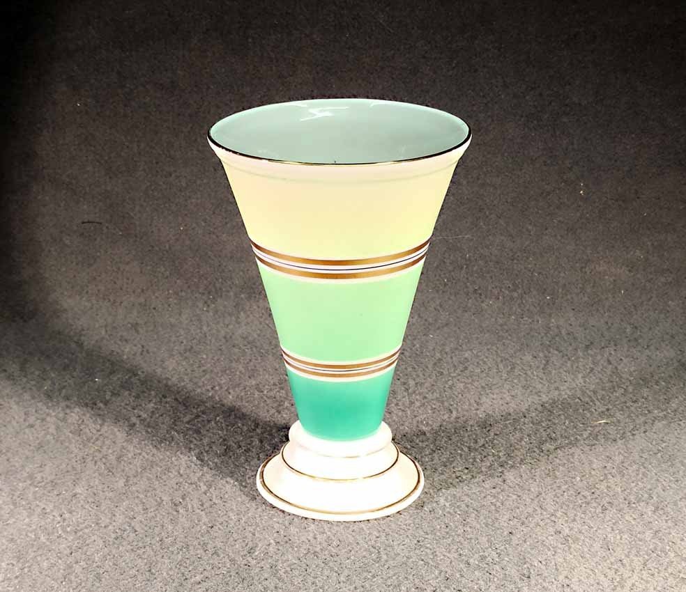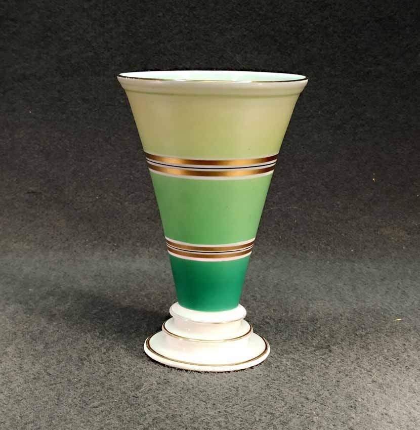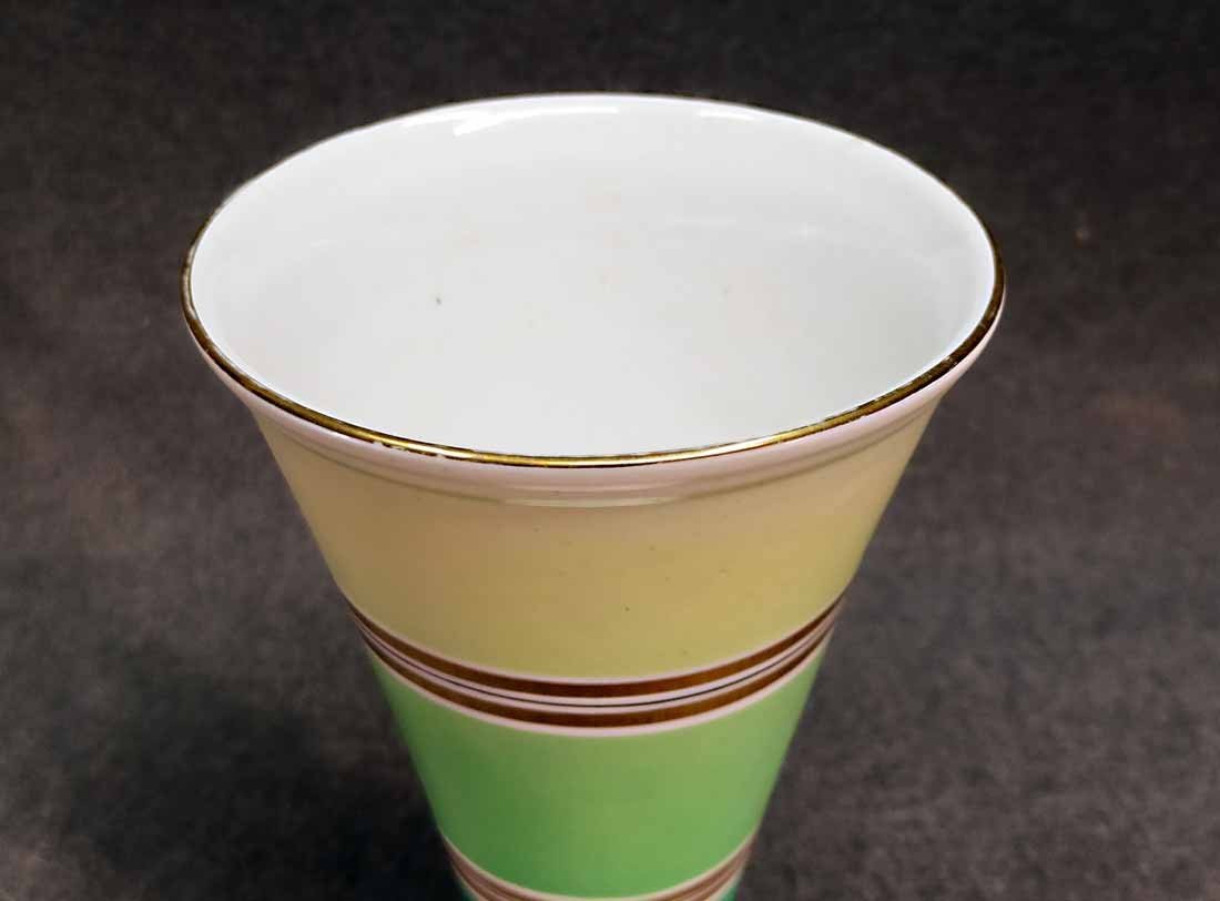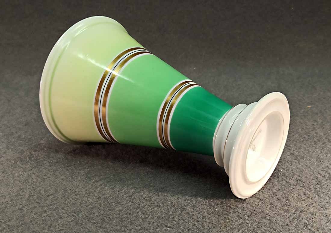 Trichtervase von Kästner. H. 16 cm. Guter Zustand ohne Beschädigungen, geringer Farb-/Goldabrieb. Bodenmarke von "Kästner Saxonia" in Grün.