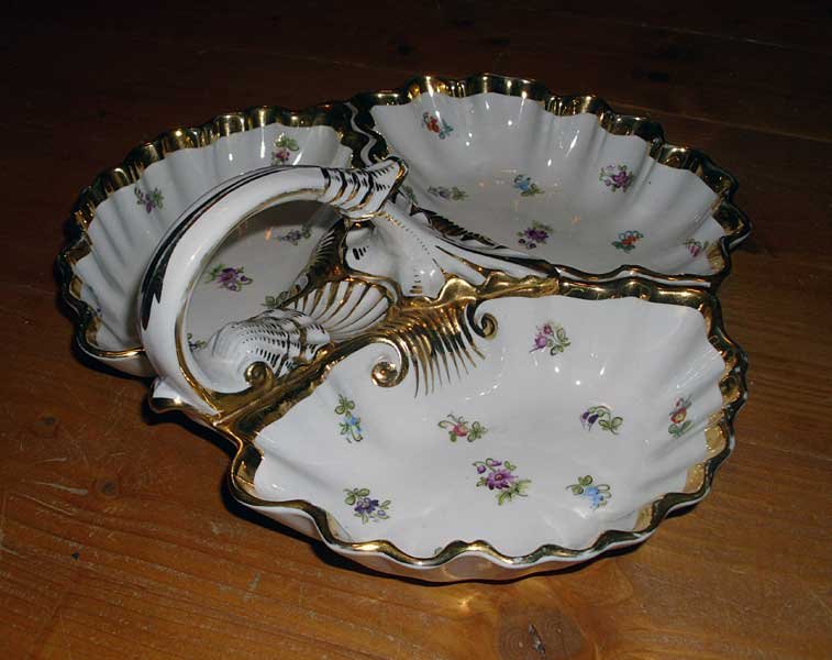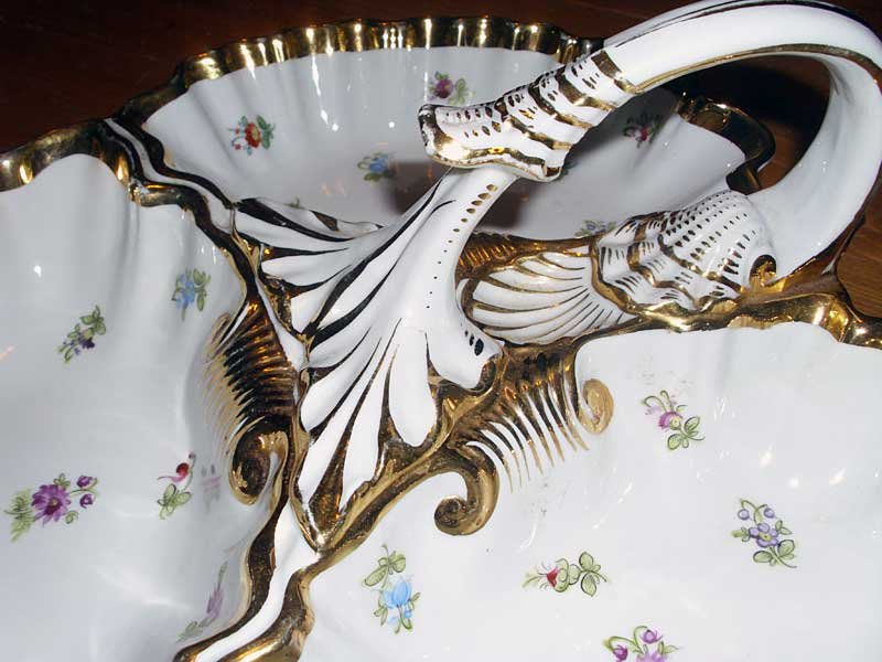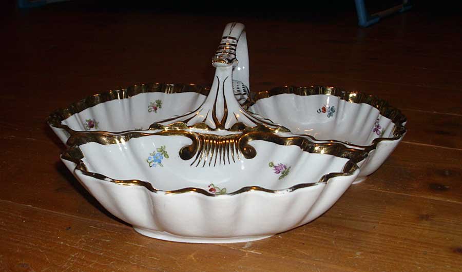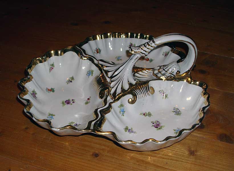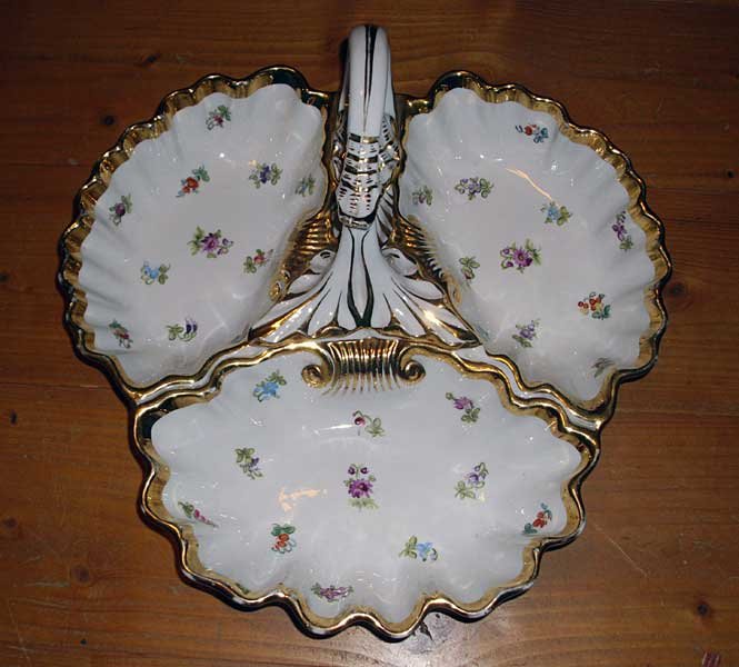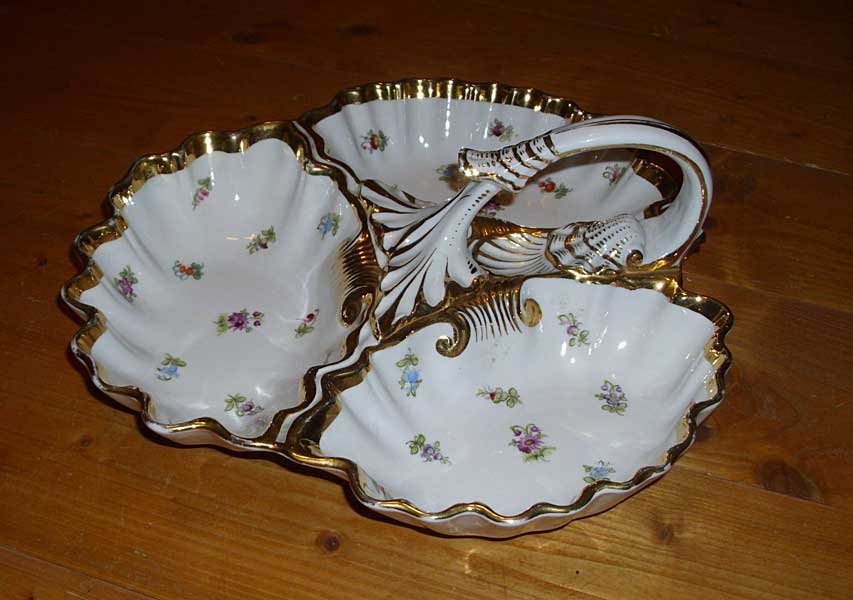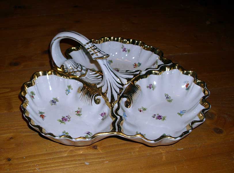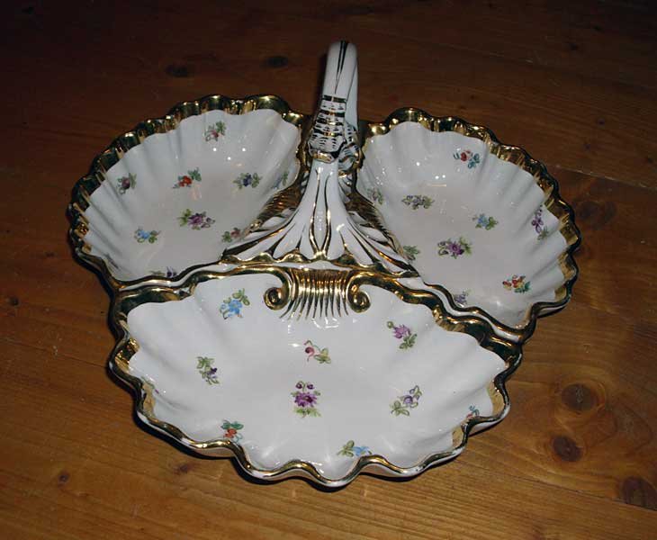 Nicht mehr verfügbar!! Anbietschale dreigeteilt mit Griff, Streublümchen und Gold. Seltene Schale in guter Teichert Qualität. Sehr Seltene Marke der Firma Teichert in Meissen aus den 1880er Jahren. Guter Zustand, keine Beschädigungen, keine Chips, Risse oder Abplatzer. Keine Restaurierungen. Geringer Goldabrieb.
