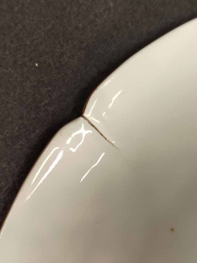 Prunkschale von Meissen mit vergoldetem Reliefrand und Blumenmalerei. Schale mit herstellungsbedingten Mängeln. Ein Brandriss am Rand und eine kleine Porzellanfehlstelle unter dem Rand unter Glasur (herstellungsbedingt), von vorn nicht sichtbar. Blaue Schwertermarke mit Punkt 1920-30er Jahre. Aufgrund der beschriebenen Herstellungsmängel Marke 4x gestrichen. D. 30,5 cm.