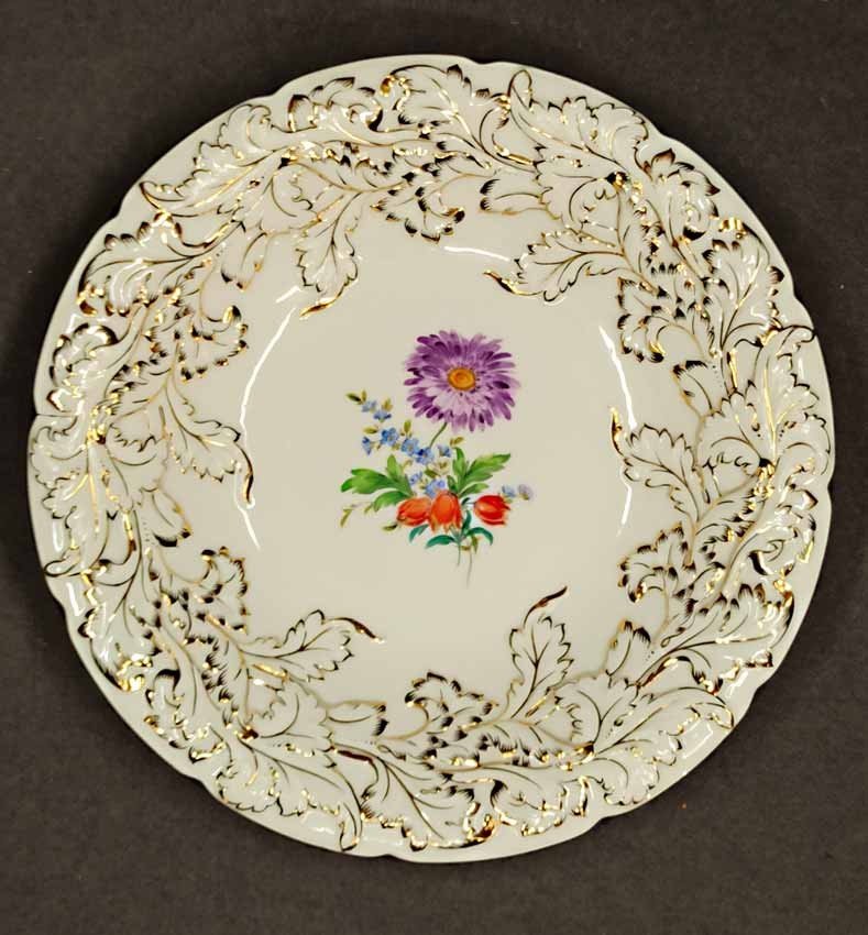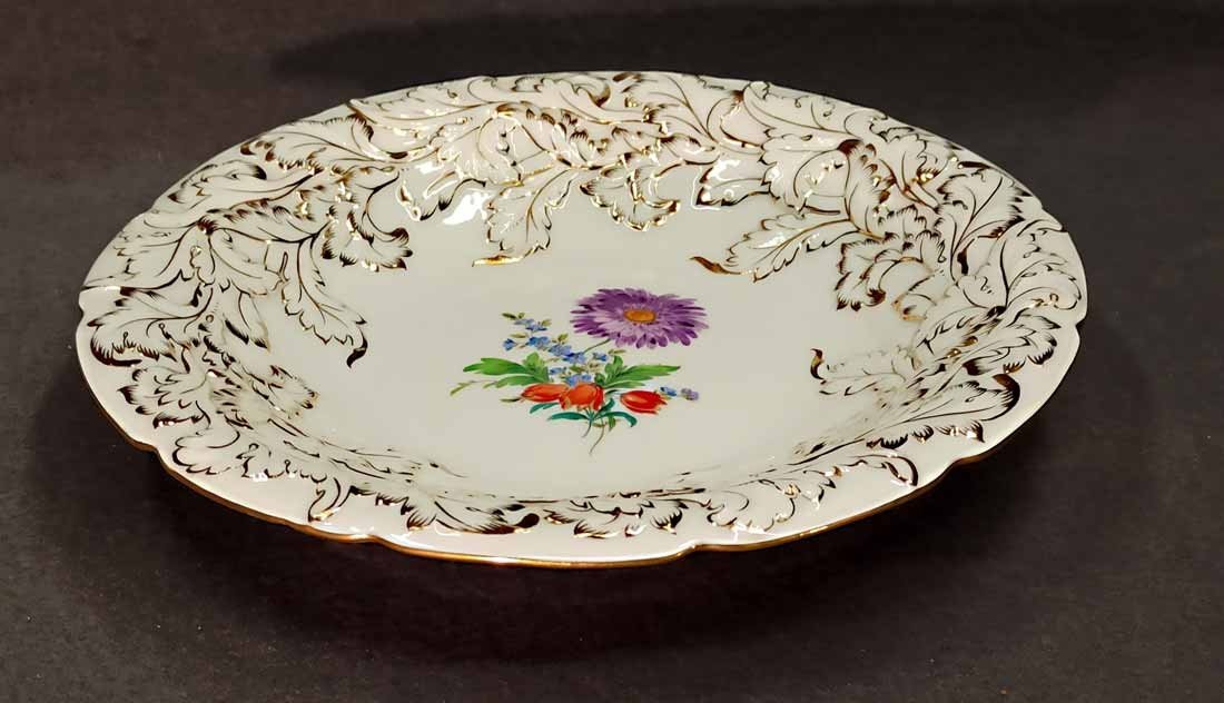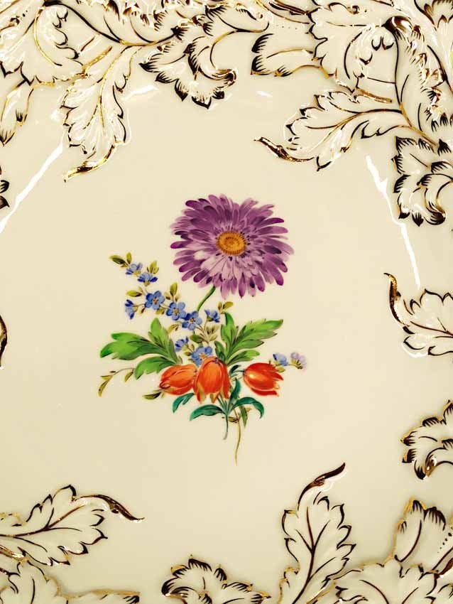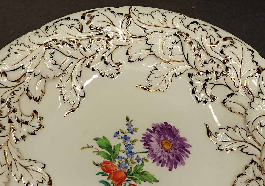 Meissen, Prunkschale/-teller mit Blumenmalerei und Reliefrand mit Gold, D. 30,5 cm