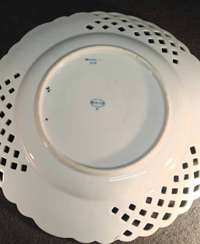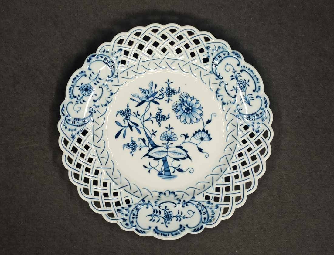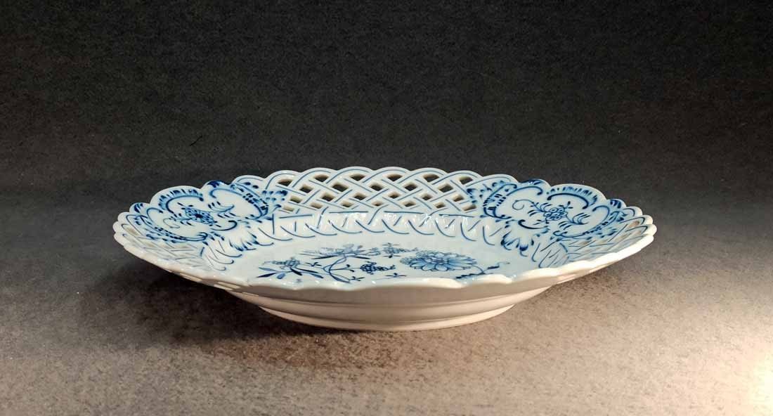 Teichert-Meissen, großer Zwiebelmuster Teller mit Flechtrand, D. 28,5 cm.Sehr guter Zustand ohne Beschädigungen. Rs. Blaue Manufakturmarke von Teichert; Schriftzug "MEISSEN" im Oval. Großer Teller D. 28,5 cm