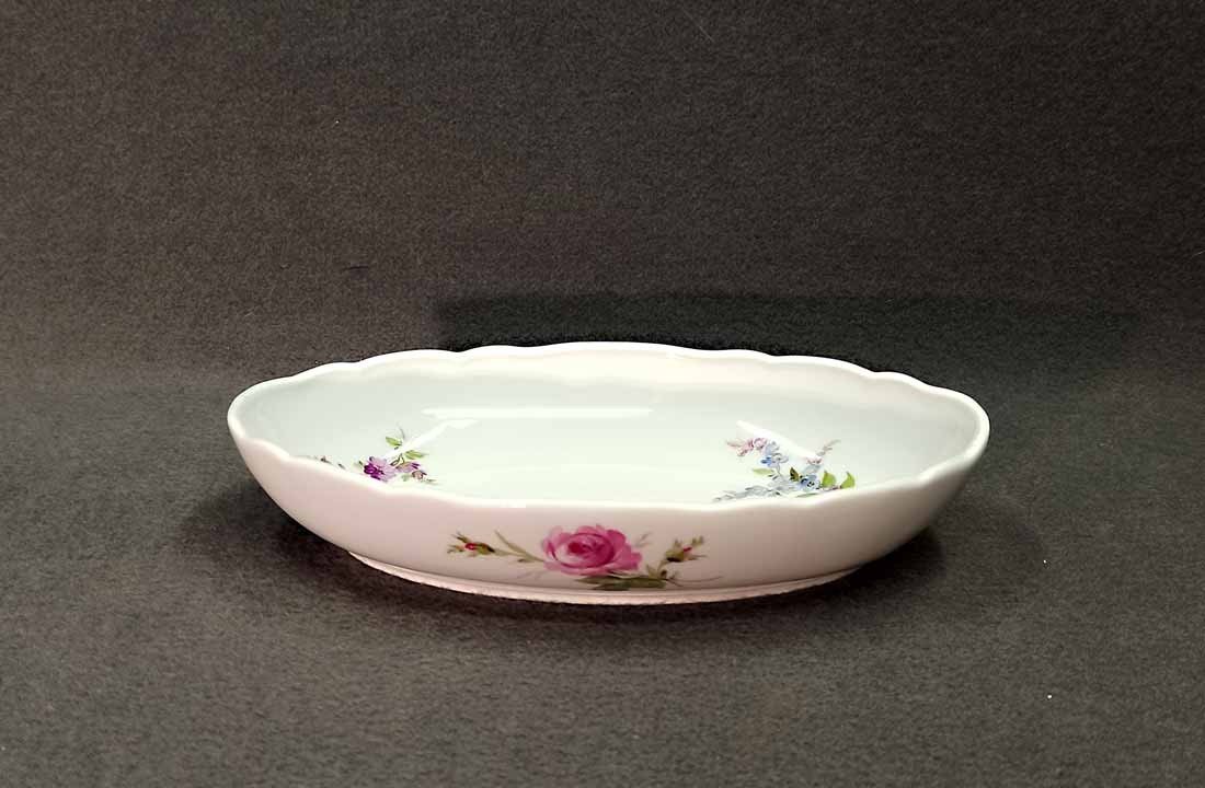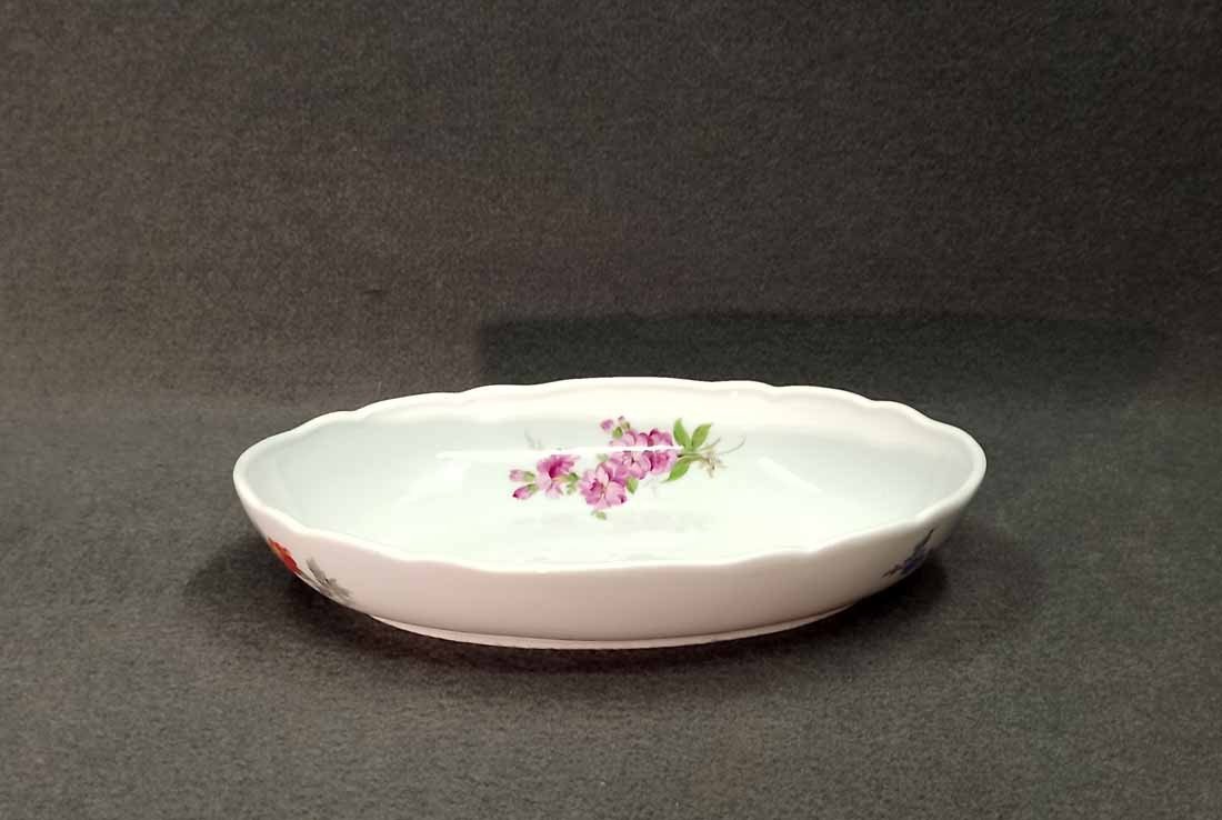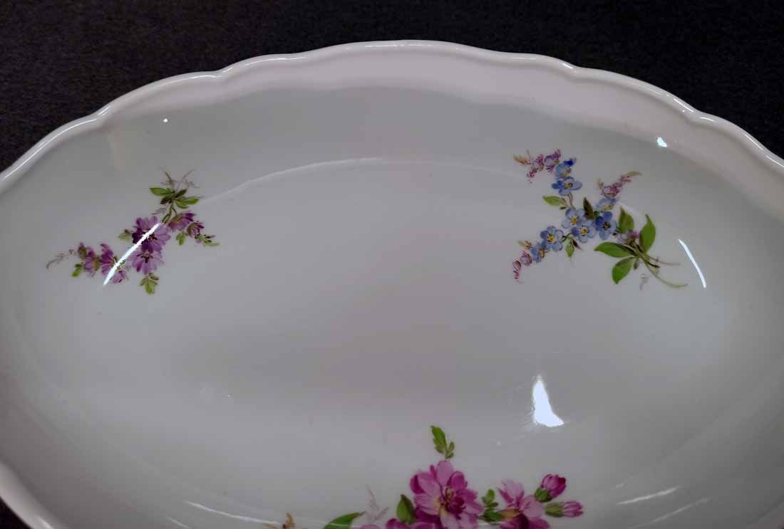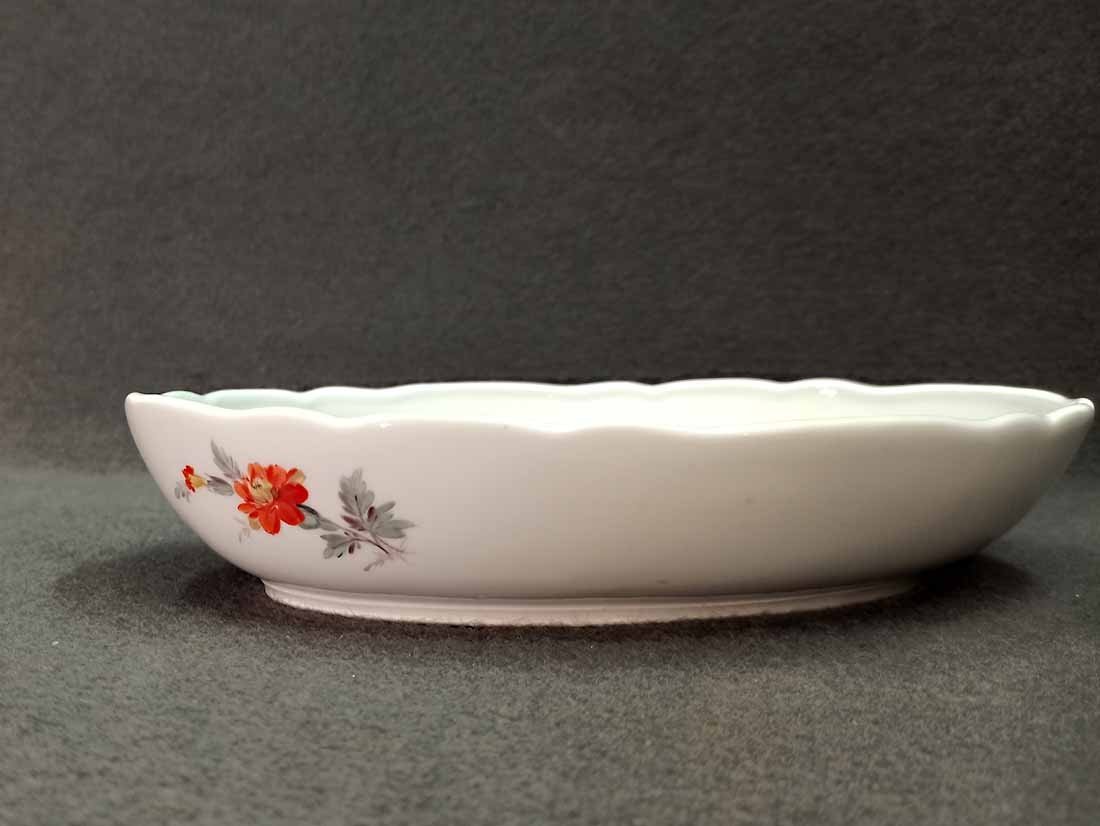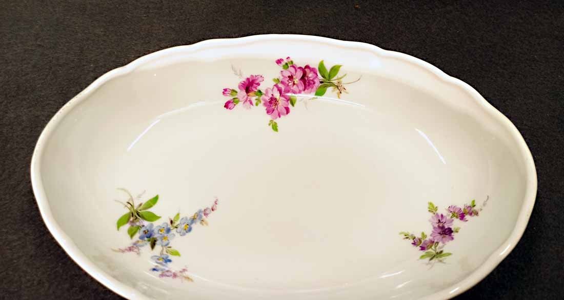Meissen; Schale mit Blumenmalerei um 1880/1900. Schale auch außen bemalt. Guter Zustand ohne Beschädigungen. Schwertermarke der Manufaktur Meissen ohne Schleifstriche, 1.Wahl. Alte Schwertermarke mit Knaufgriffen um 1880-1900. L.xB.  25,5 cm x 17 cm, H. 5 cm.