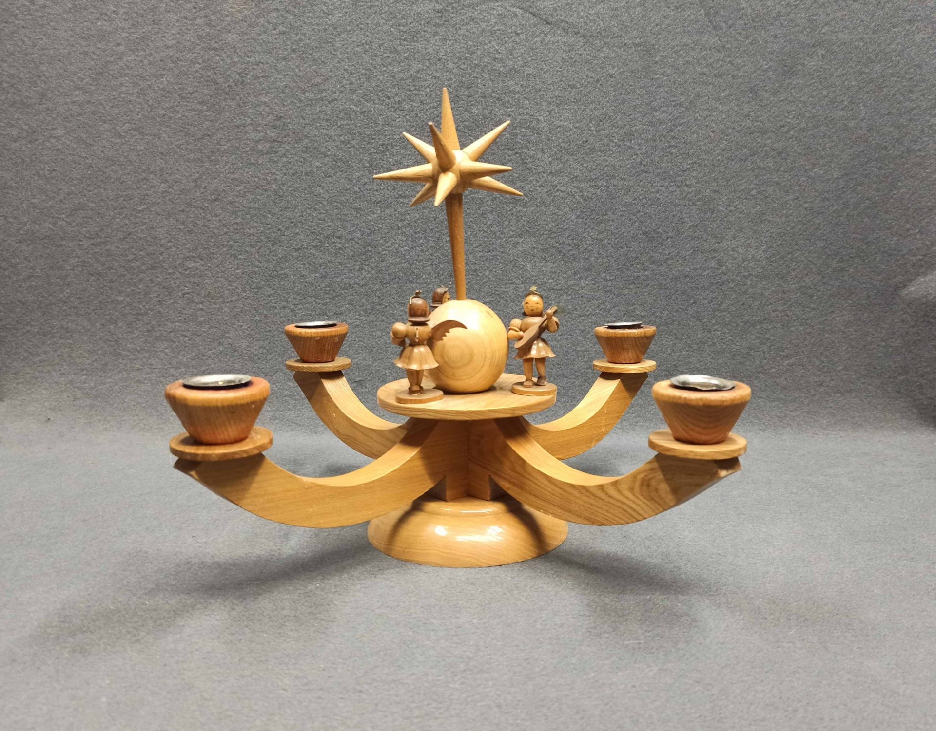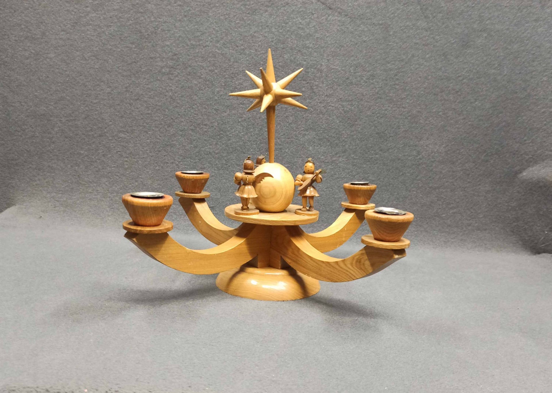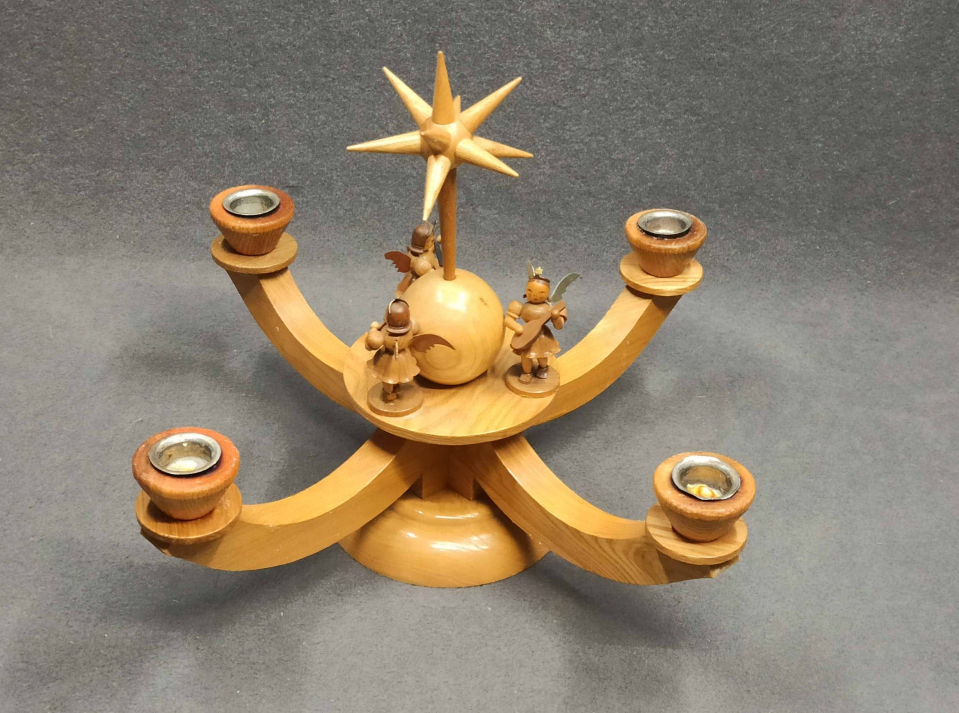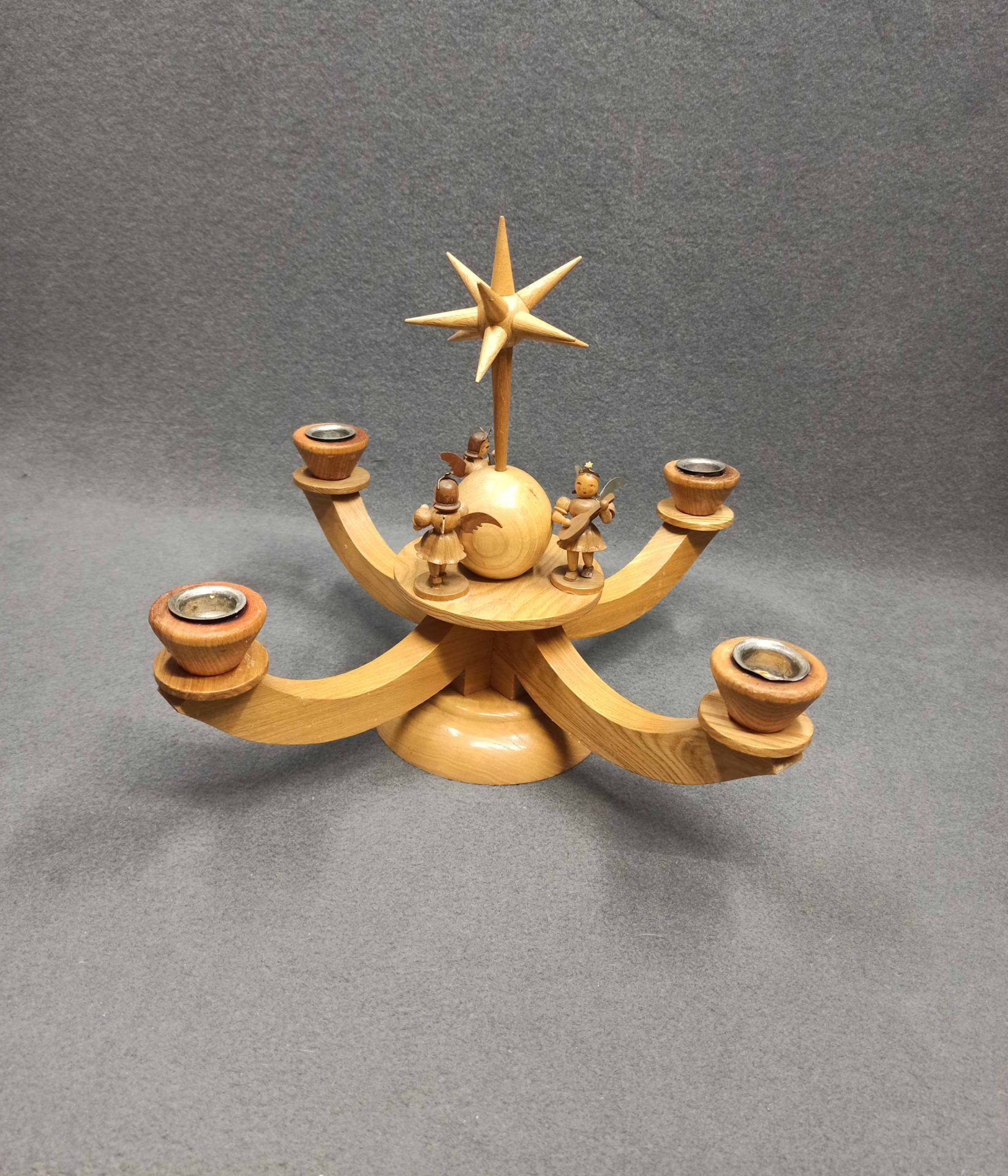 Verkauft! Adventsleuchter mit 3 Engeln, Erzgebirge. B. 38 cm. Guter gebrauchter Zustand. Die Flügel der Engel etwas gerupft mit Def. bzw. fehlen tw. oder ergänzt.