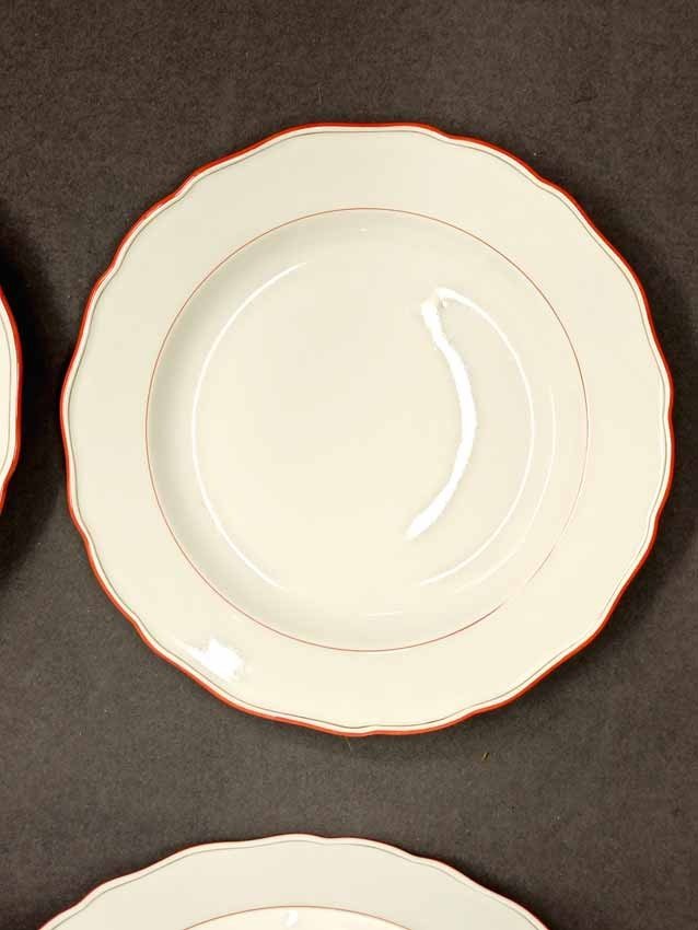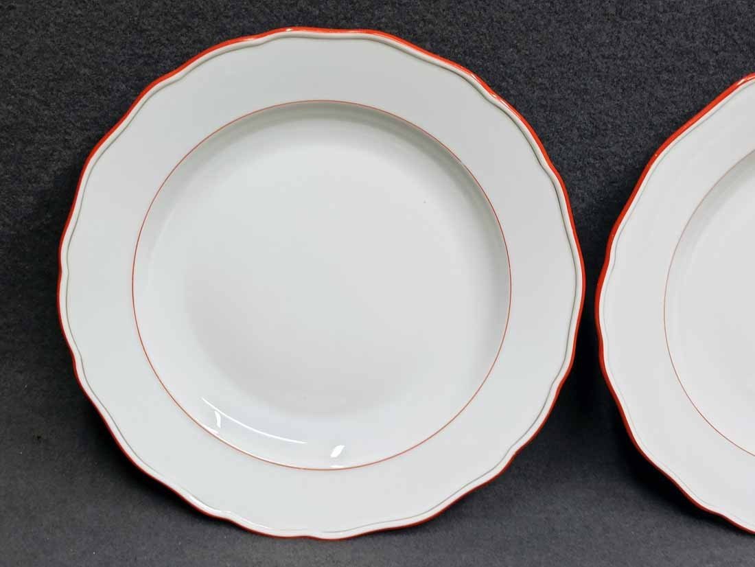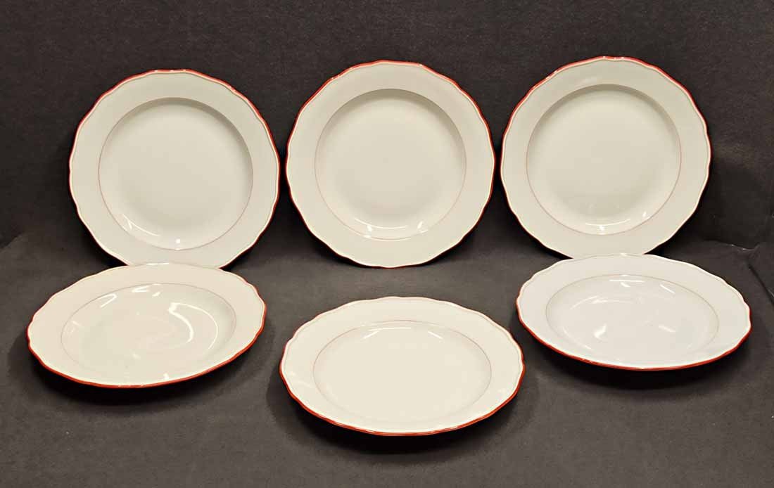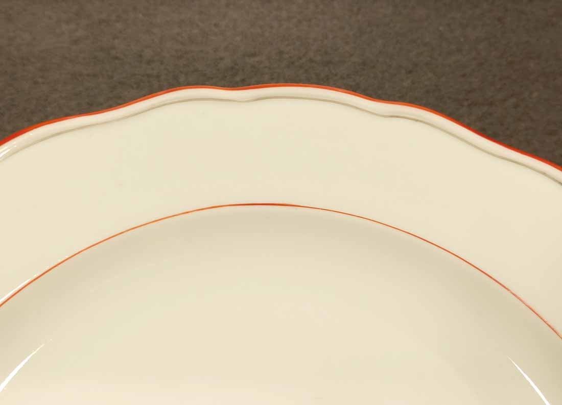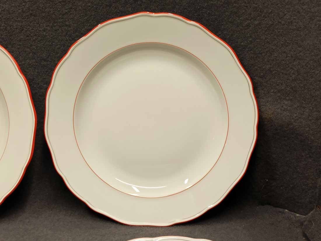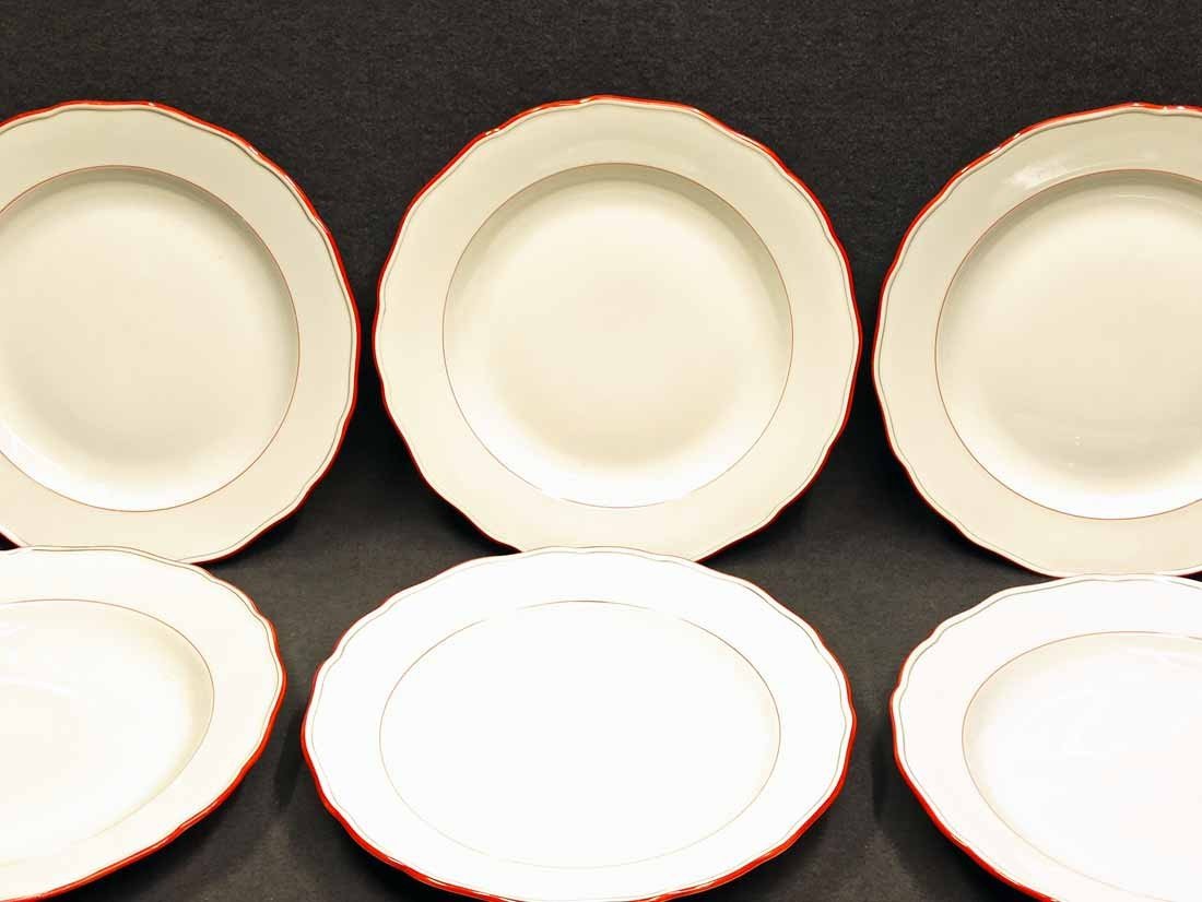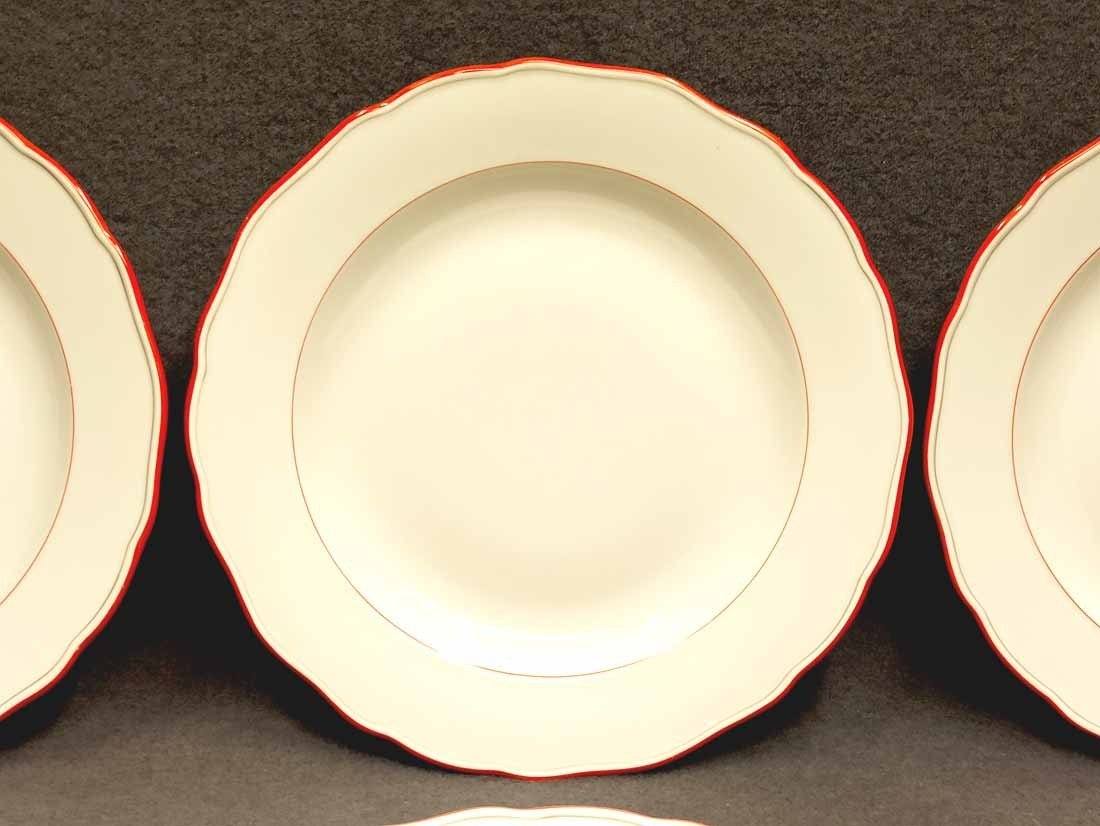 Meissen, 6x große Speiseteller, Koralle Rot mit grauem Faden. D. 25,5 cm, H. 3,2 cm. Guter Zustand ohne Beschädigungen, zwei Teller mit mit herstellungsbedingten Glasureinschlüssen. Schwertermarke der Manufaktur Meissen 2x gestrichen.