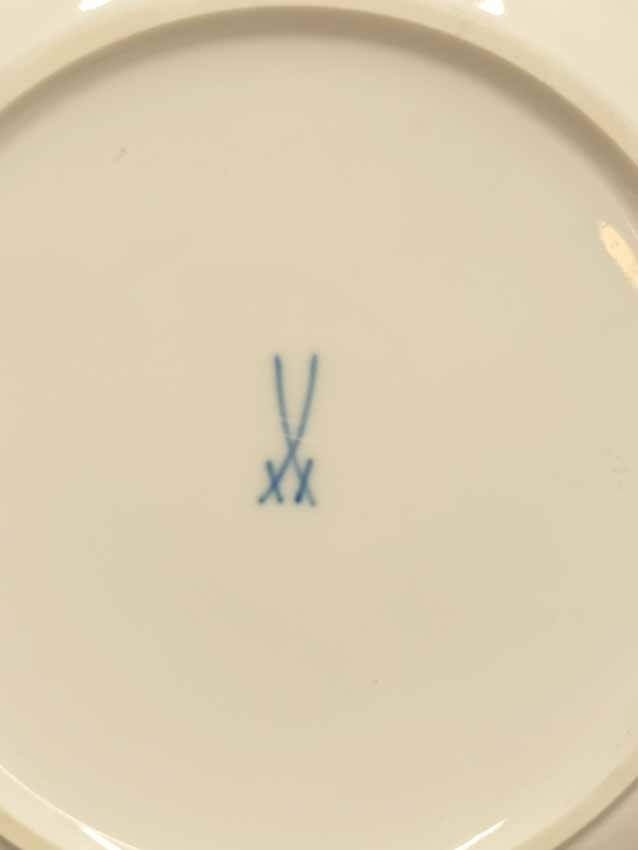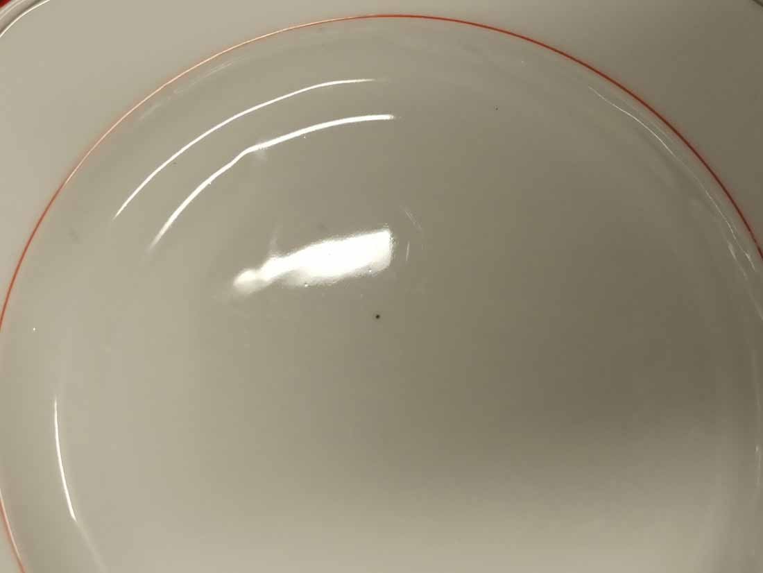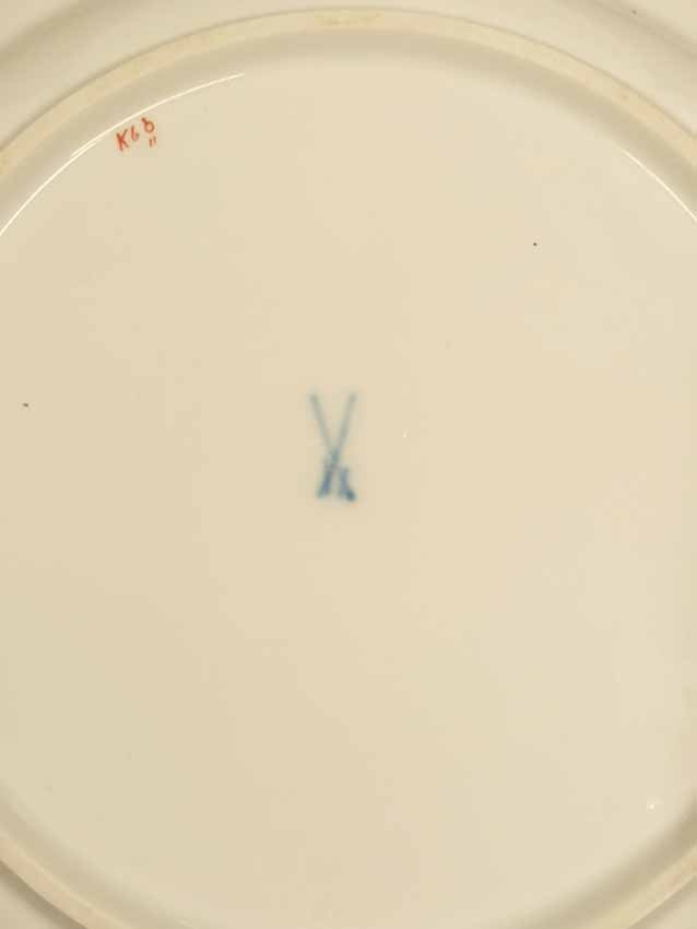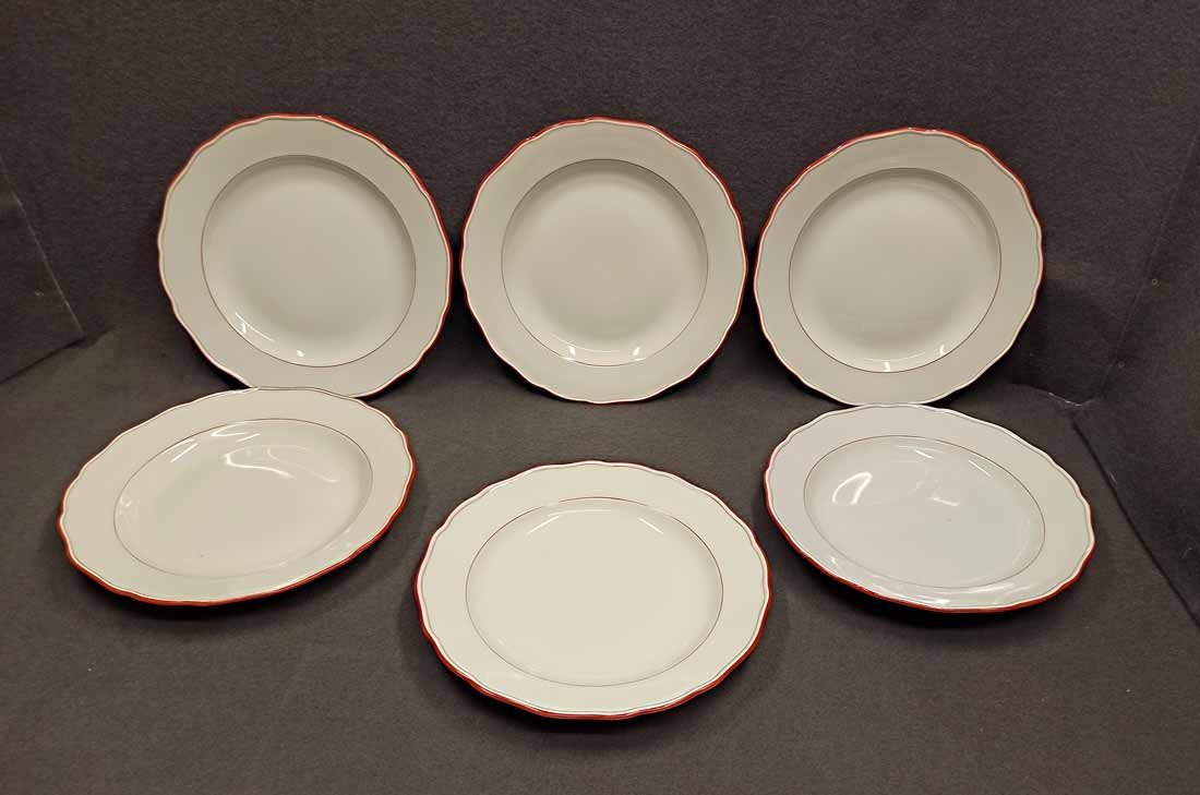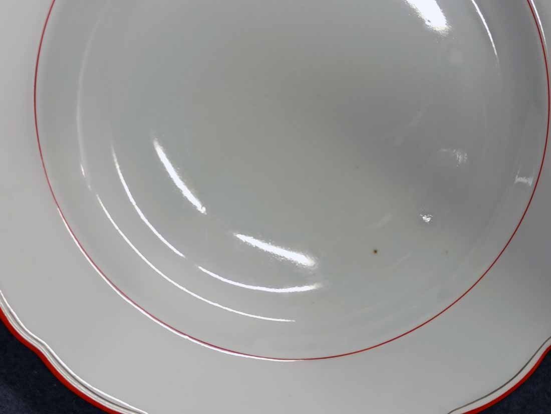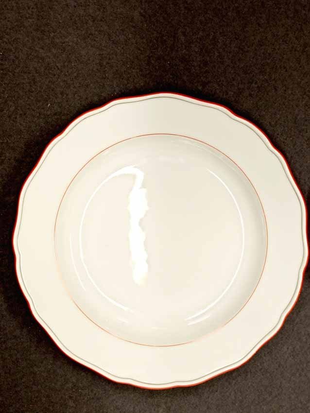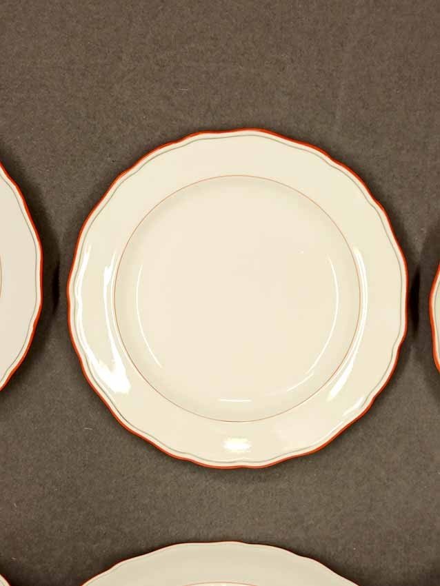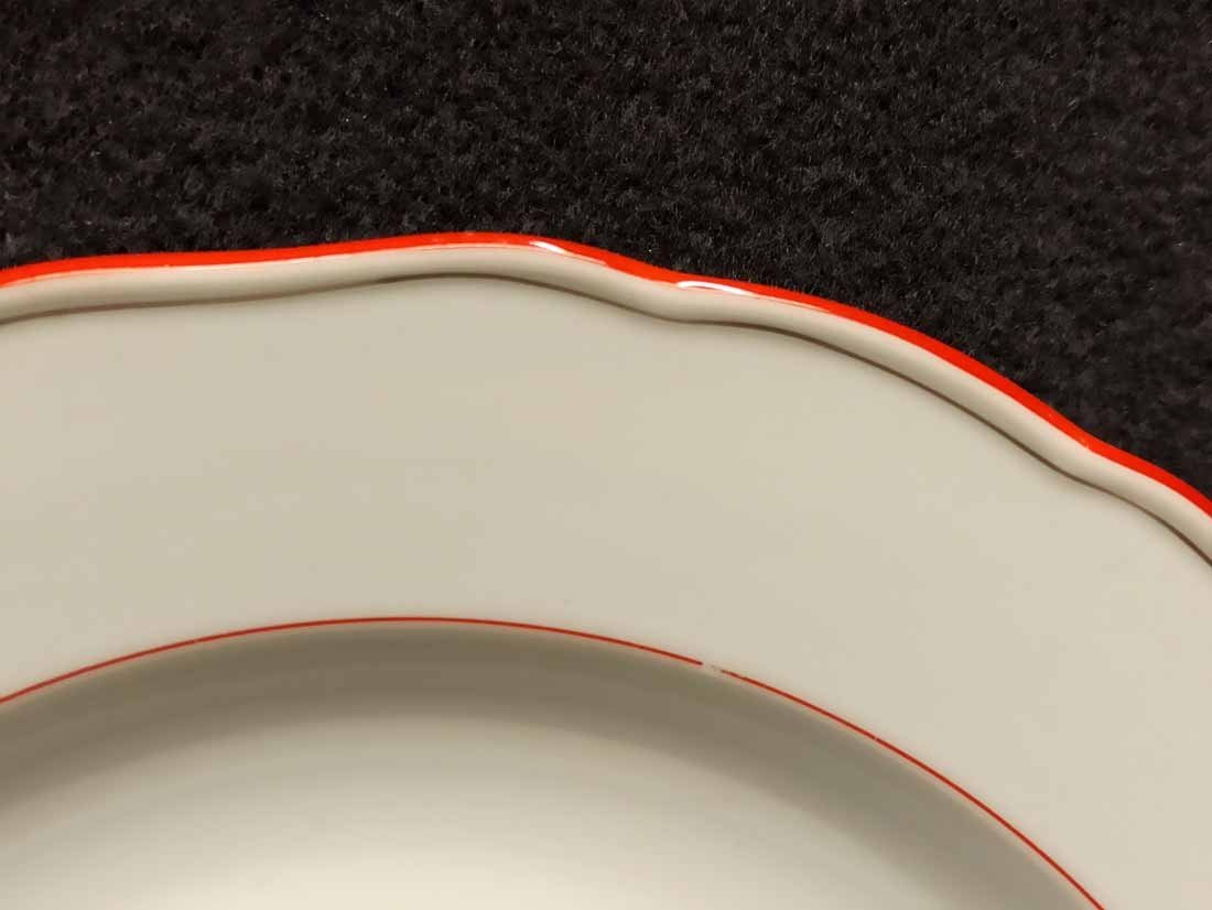 Meissen, 6x große Speiseteller, Koralle Rot mit grauem Faden. D. 25,5 cm, H. 3,2 cm. Guter Zustand ohne Beschädigungen, zwei Teller mit mit herstellungsbedingten Glasureinschlüssen. Schwertermarke der Manufaktur Meissen 2x gestrichen.