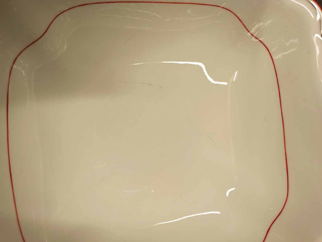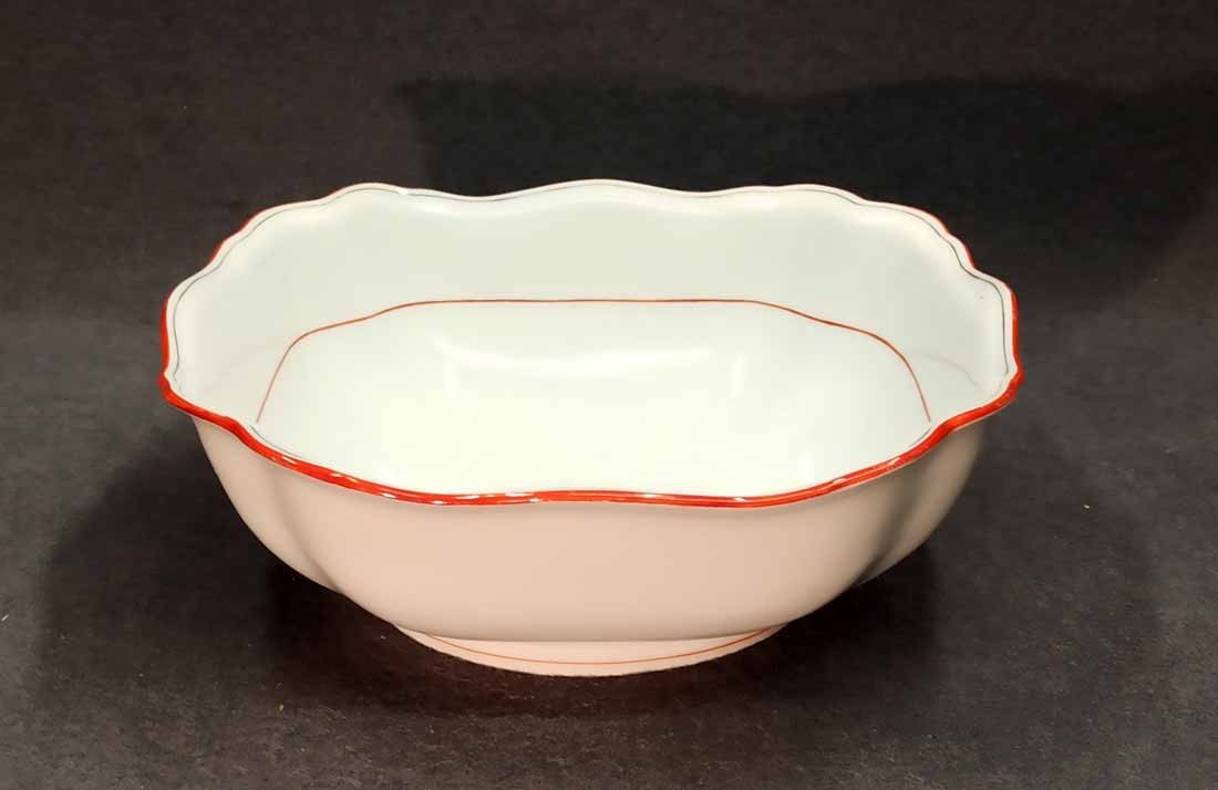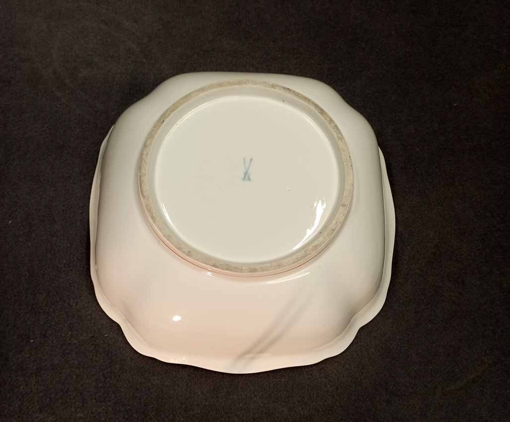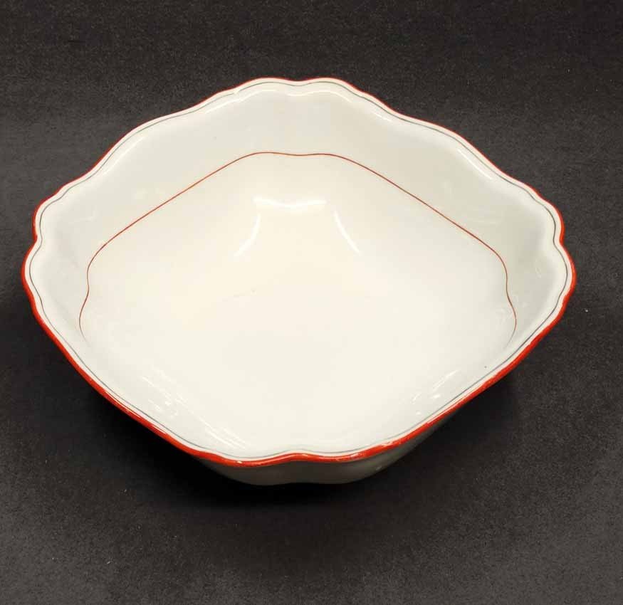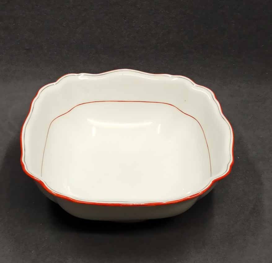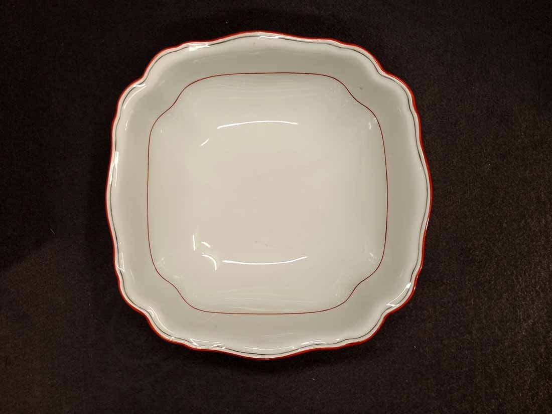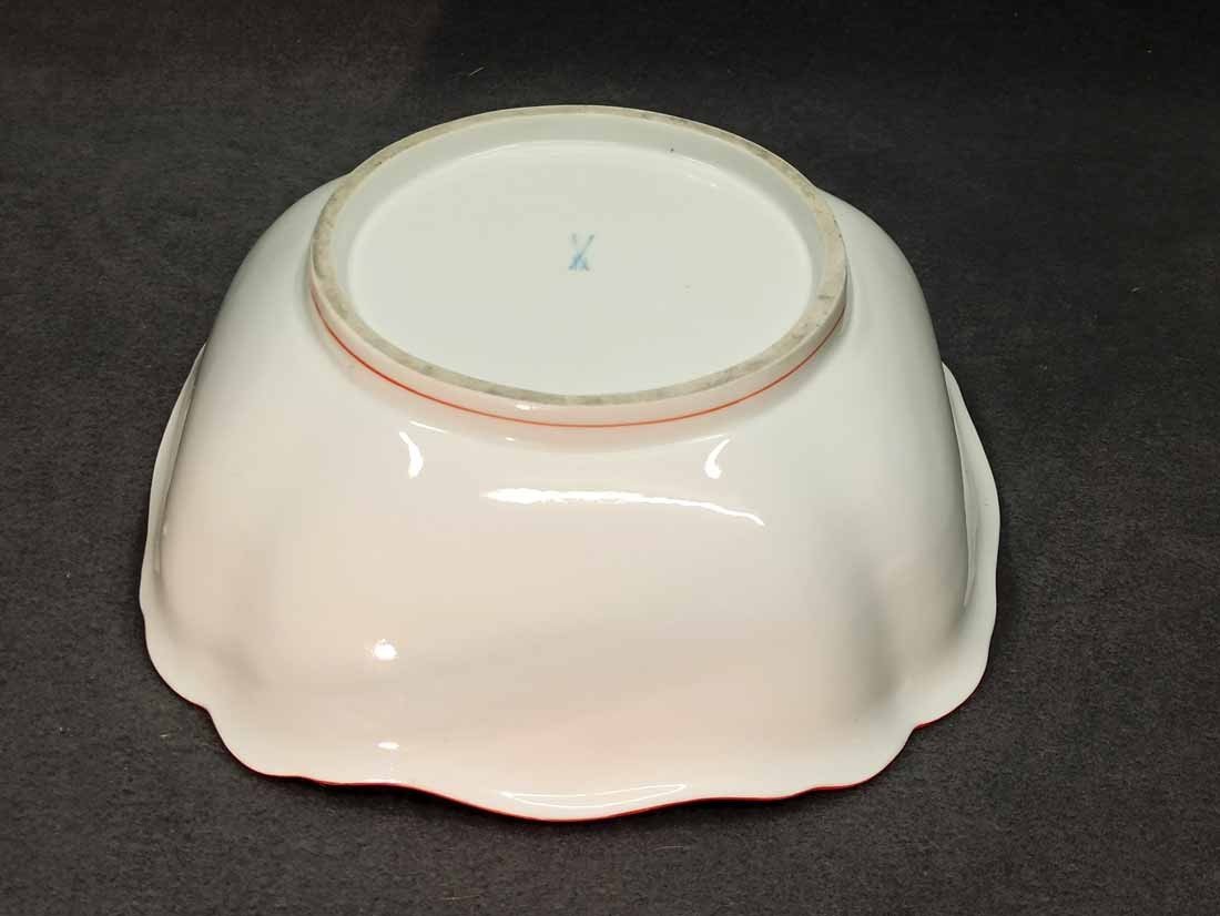 Meissen Schüssel, Koralle Rot mit grauem Faden. Große Schüssel mit viereckiger Grundform, geschwungen. Zustand ohne Beschädigungen. Innen mit leichten Gebrauchsspuren. L. x B. 26,5 x 26,5 cm, H. 9,5 cm
