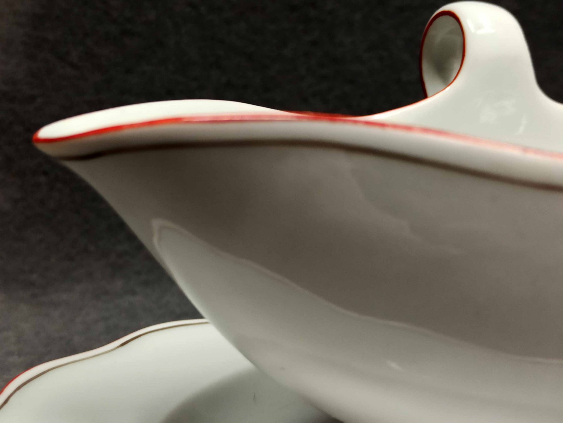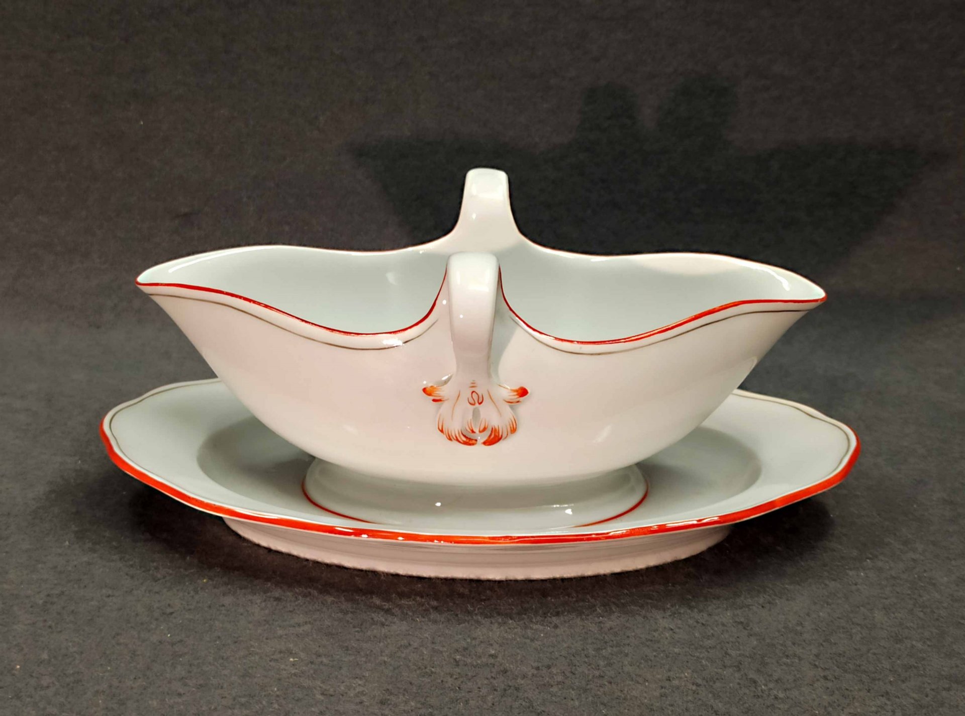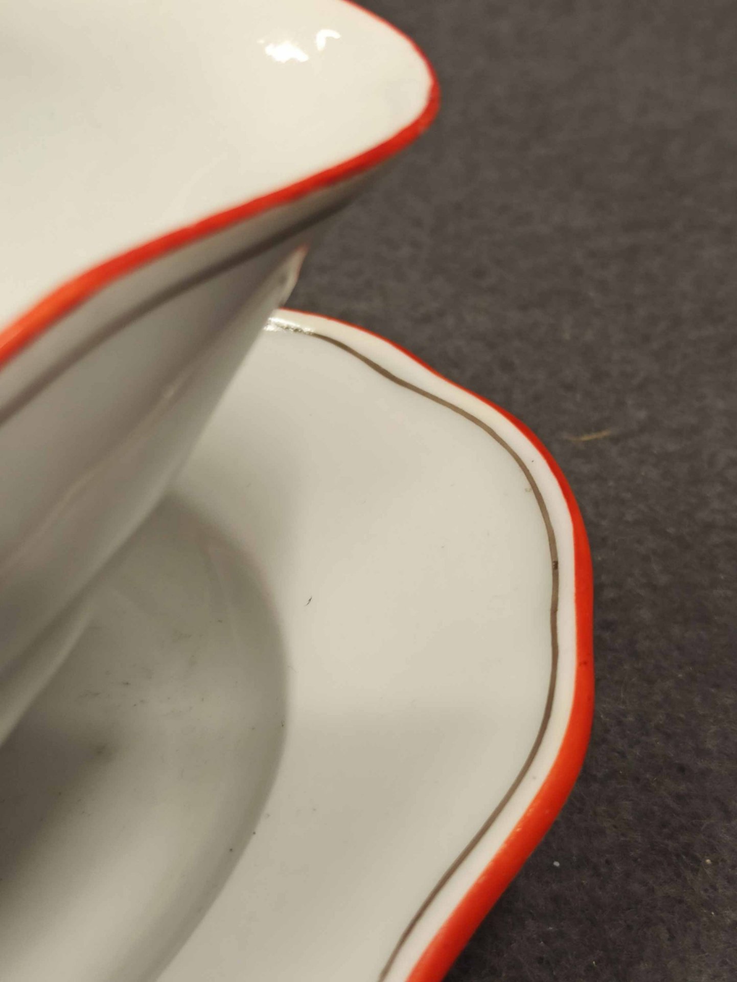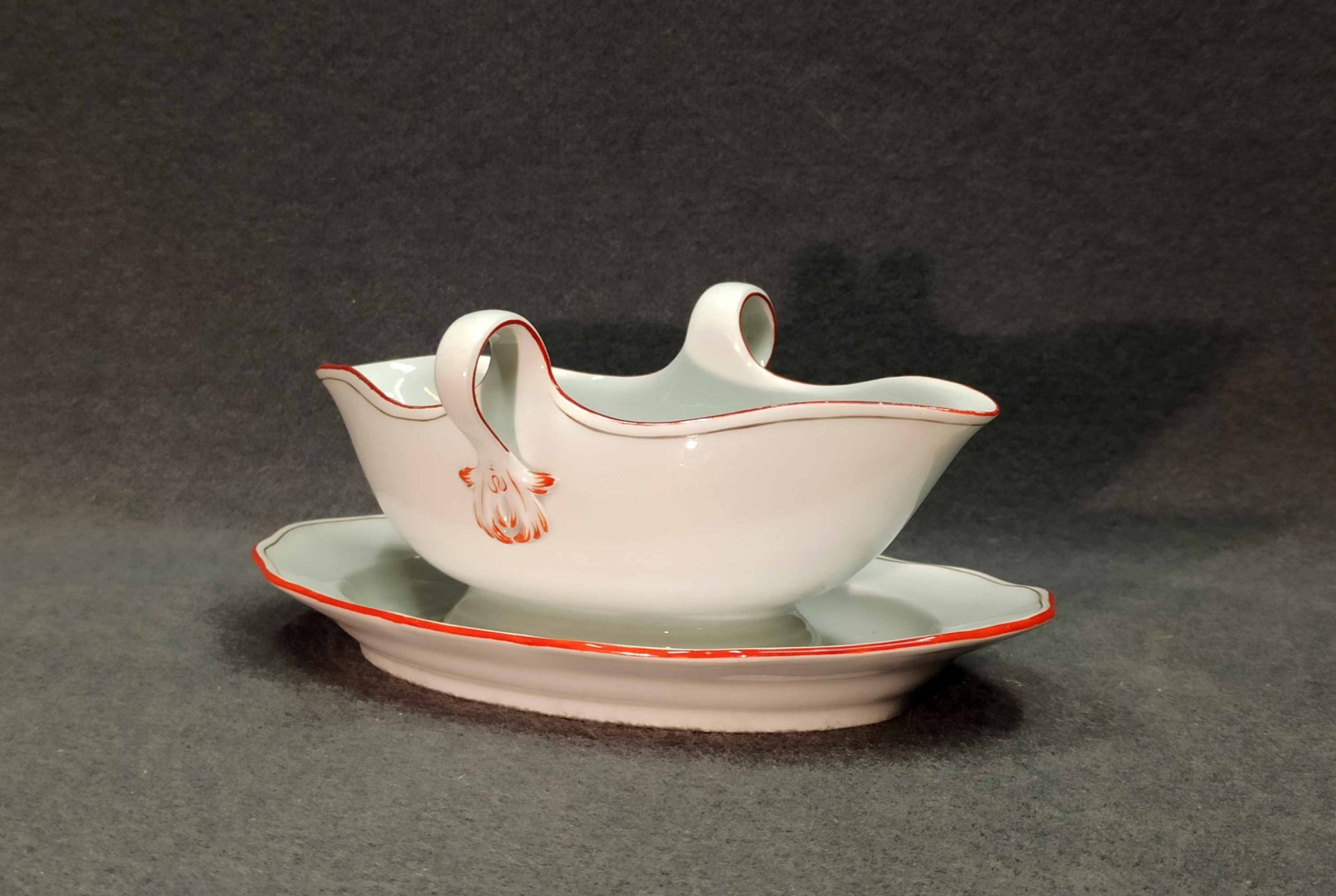 Meissen, Sauciere, Koralle Rot mit Faden grau. Sauciere mit Doppelhenkel. Zustand ohne Beschädigungen. L. ca 24 cm, B. 15 cm, H. ca 10 cm. Schwertermarke der Manufaktur Meissen 2x gestrichen.