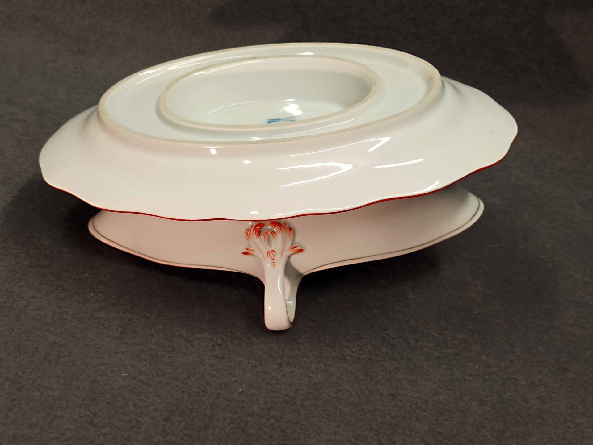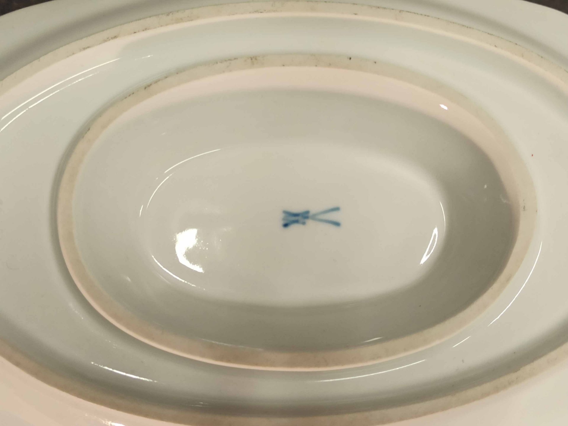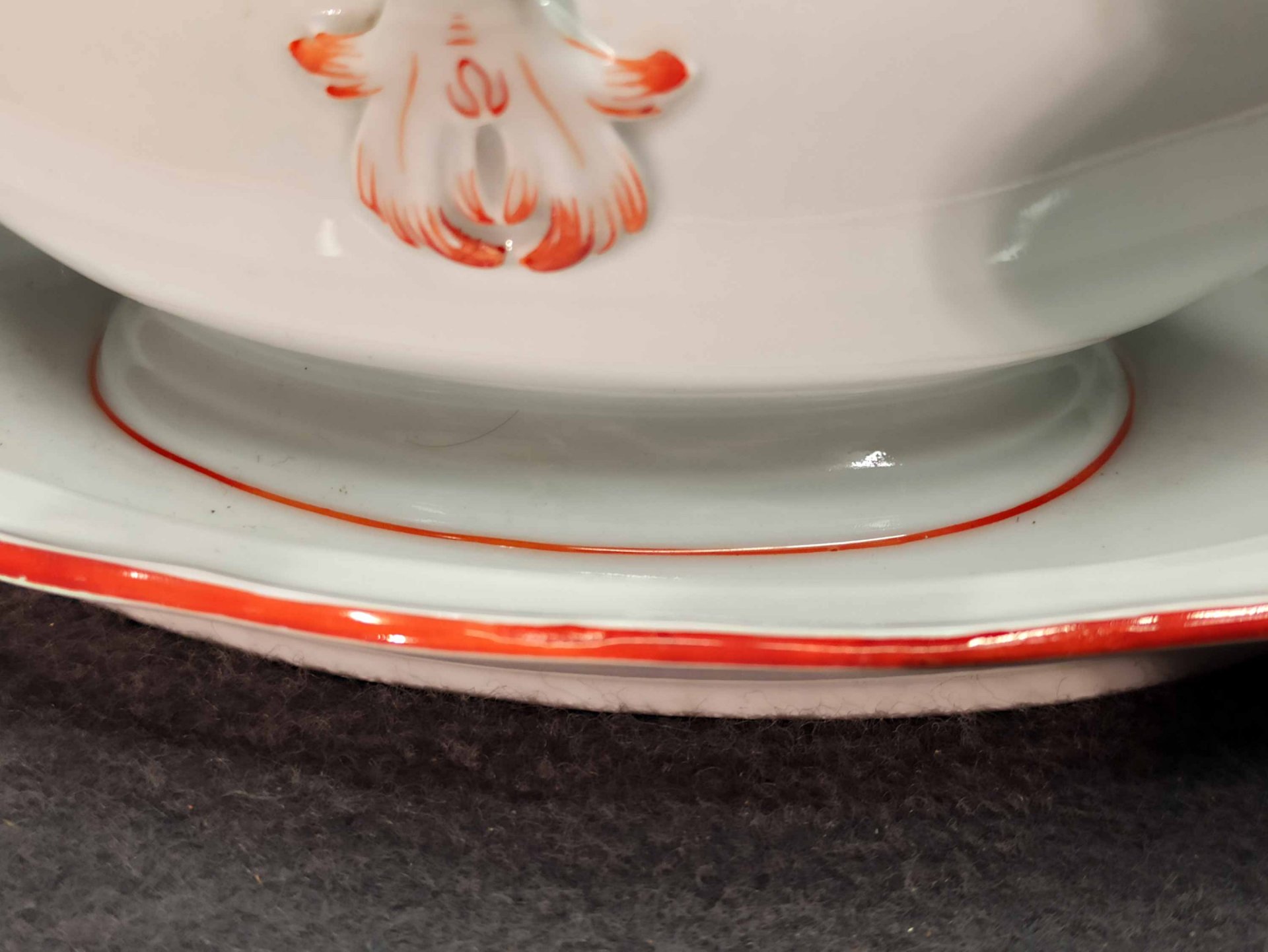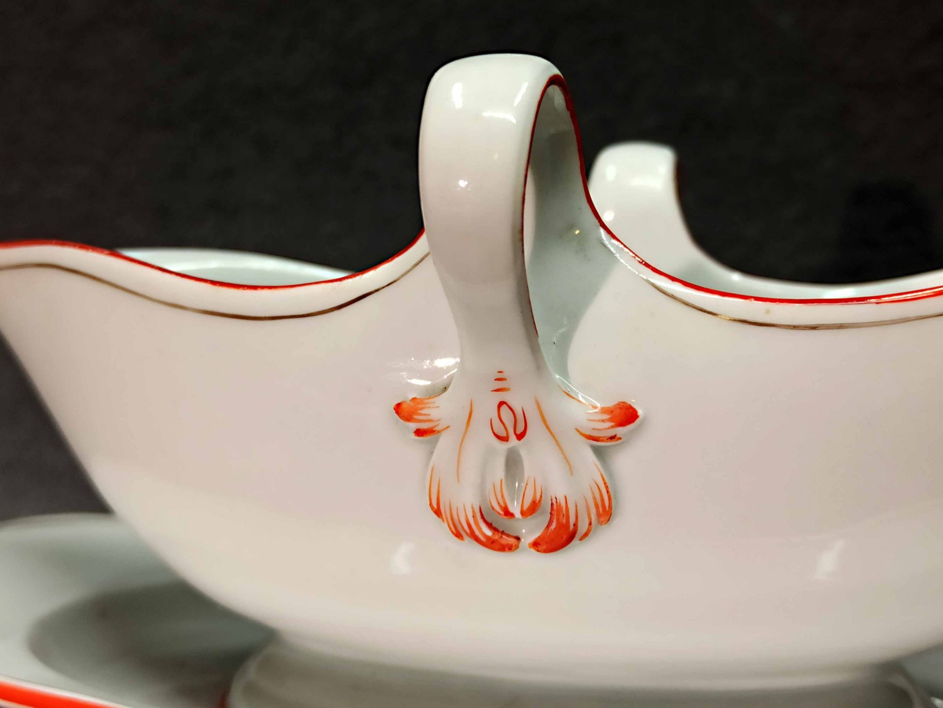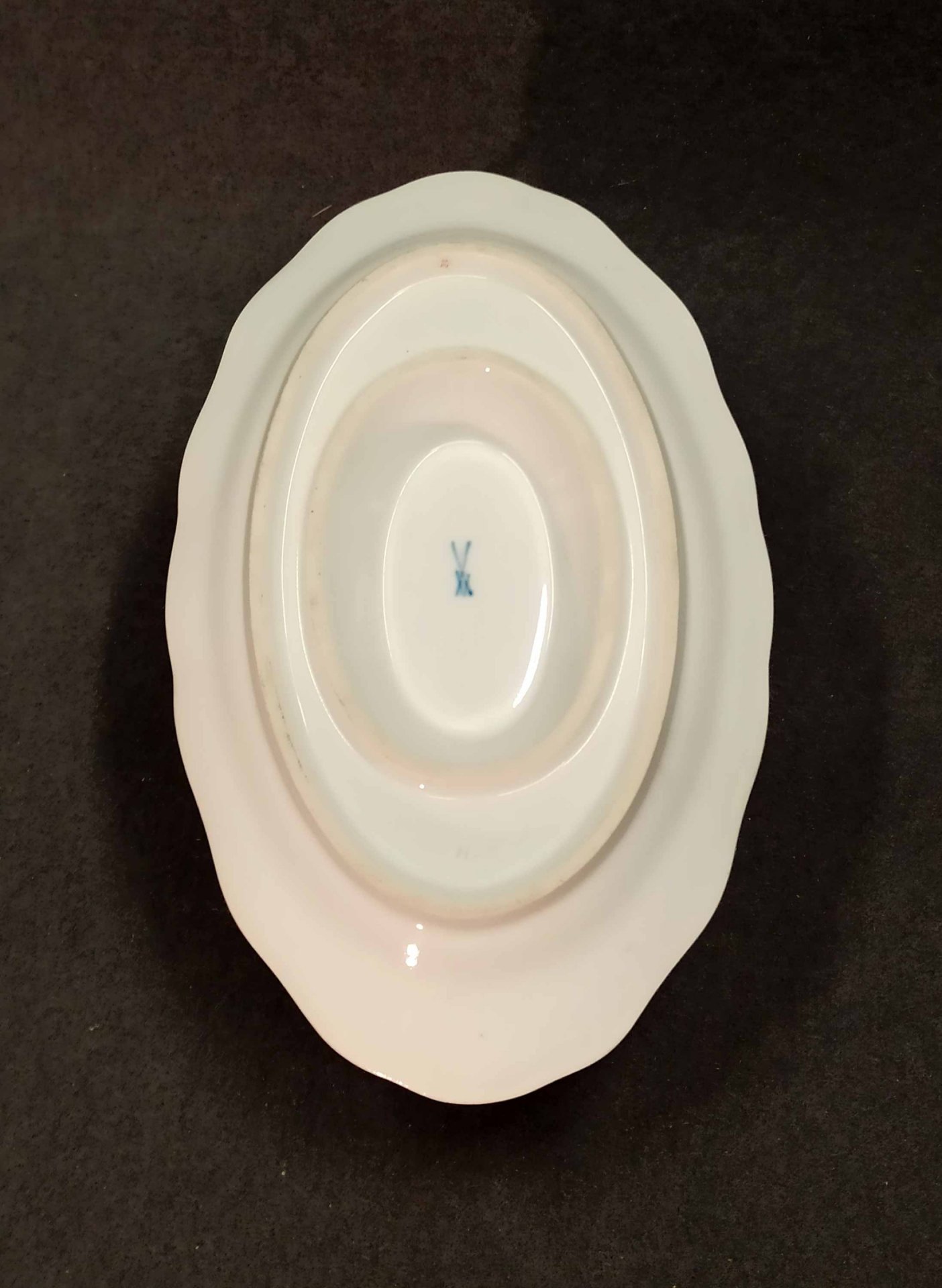Meissen, Sauciere, Koralle Rot mit Faden grau. Sauciere mit Doppelhenkel. Zustand ohne Beschädigungen. L. ca 24 cm, B. 15 cm, H. ca 10 cm. Schwertermarke der Manufaktur Meissen 2x gestrichen.