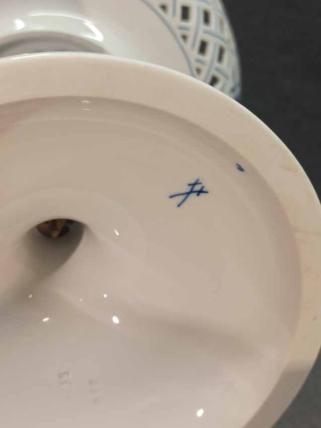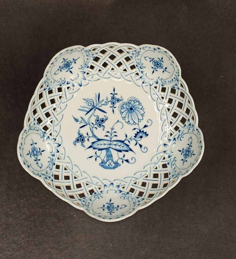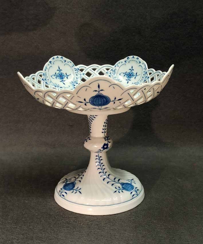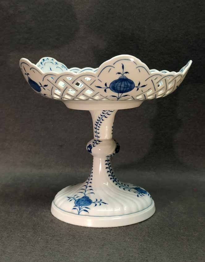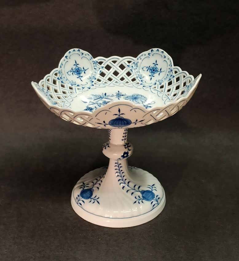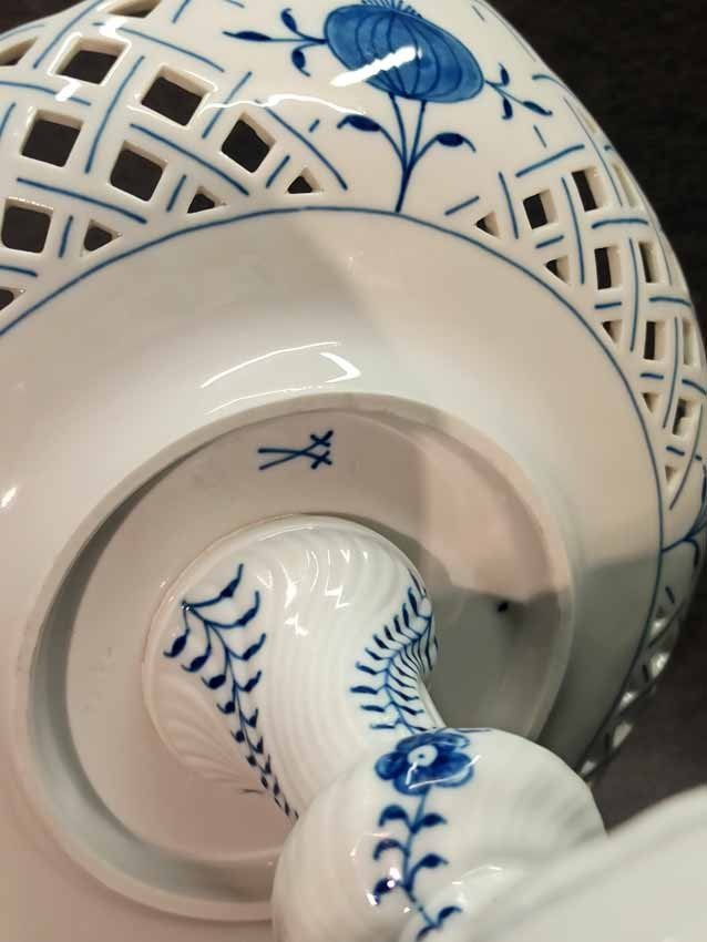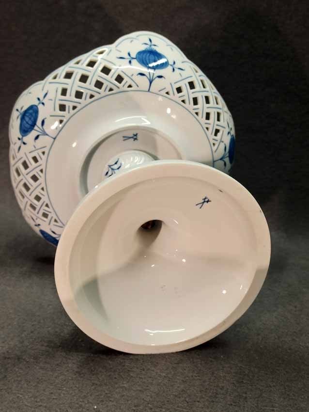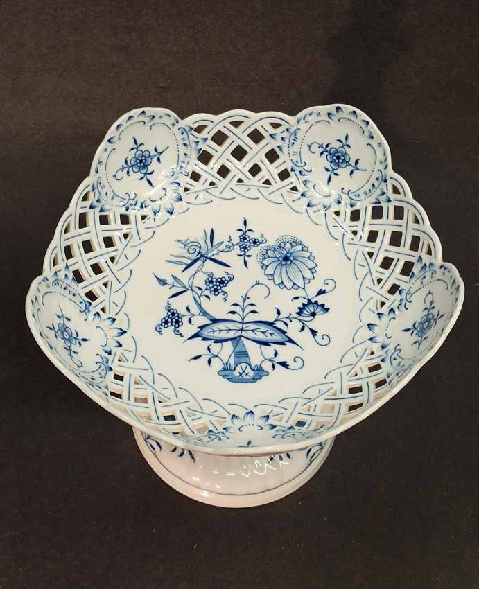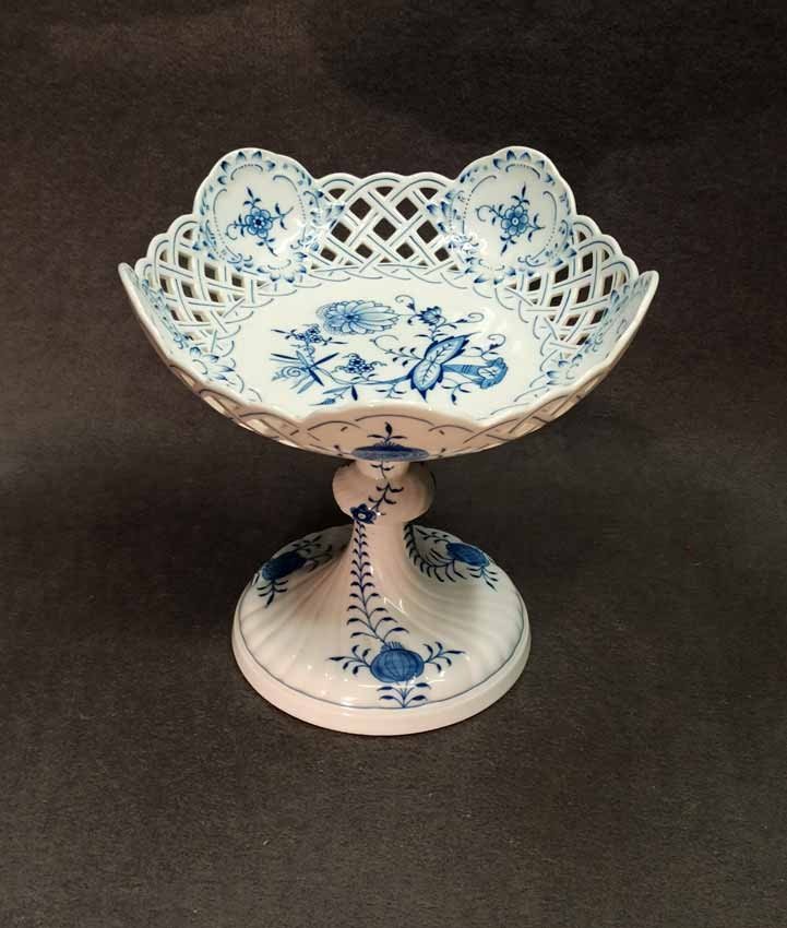 Meissen, Zwiebelmuster Tafelaufsatz. Sehr guter Zustand ohne Beschädigungen oder Gebrauchsspuren, Vitrinenstück. Schwertermarke der Manufaktur Meissen mit einem Schleifstrich neben den Schwertern. H. ca 22 cm, D. ca 23 cm.