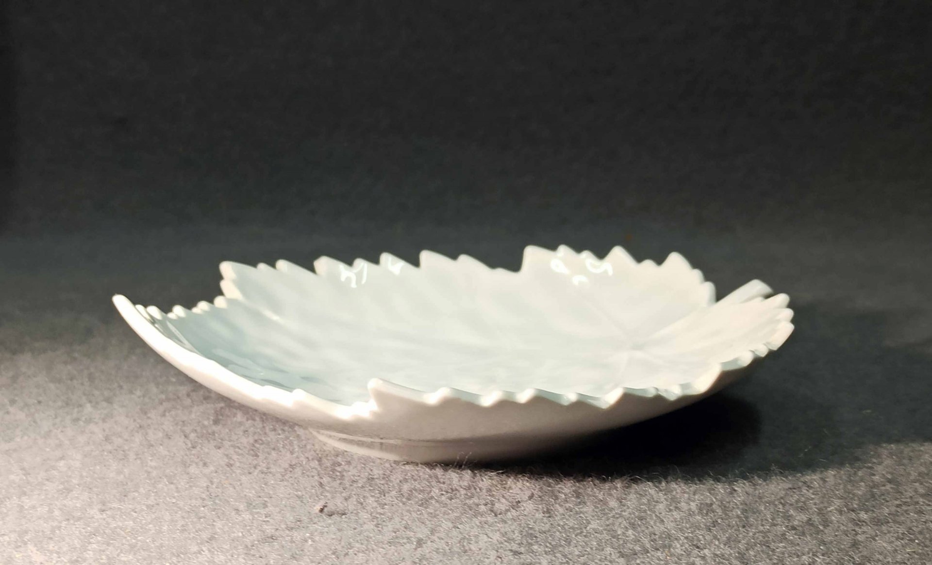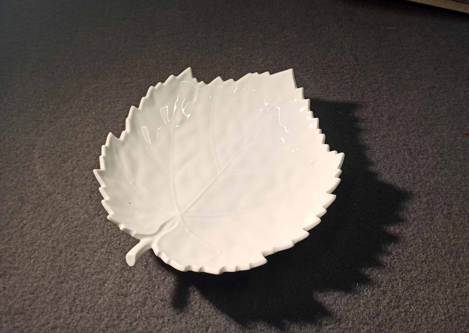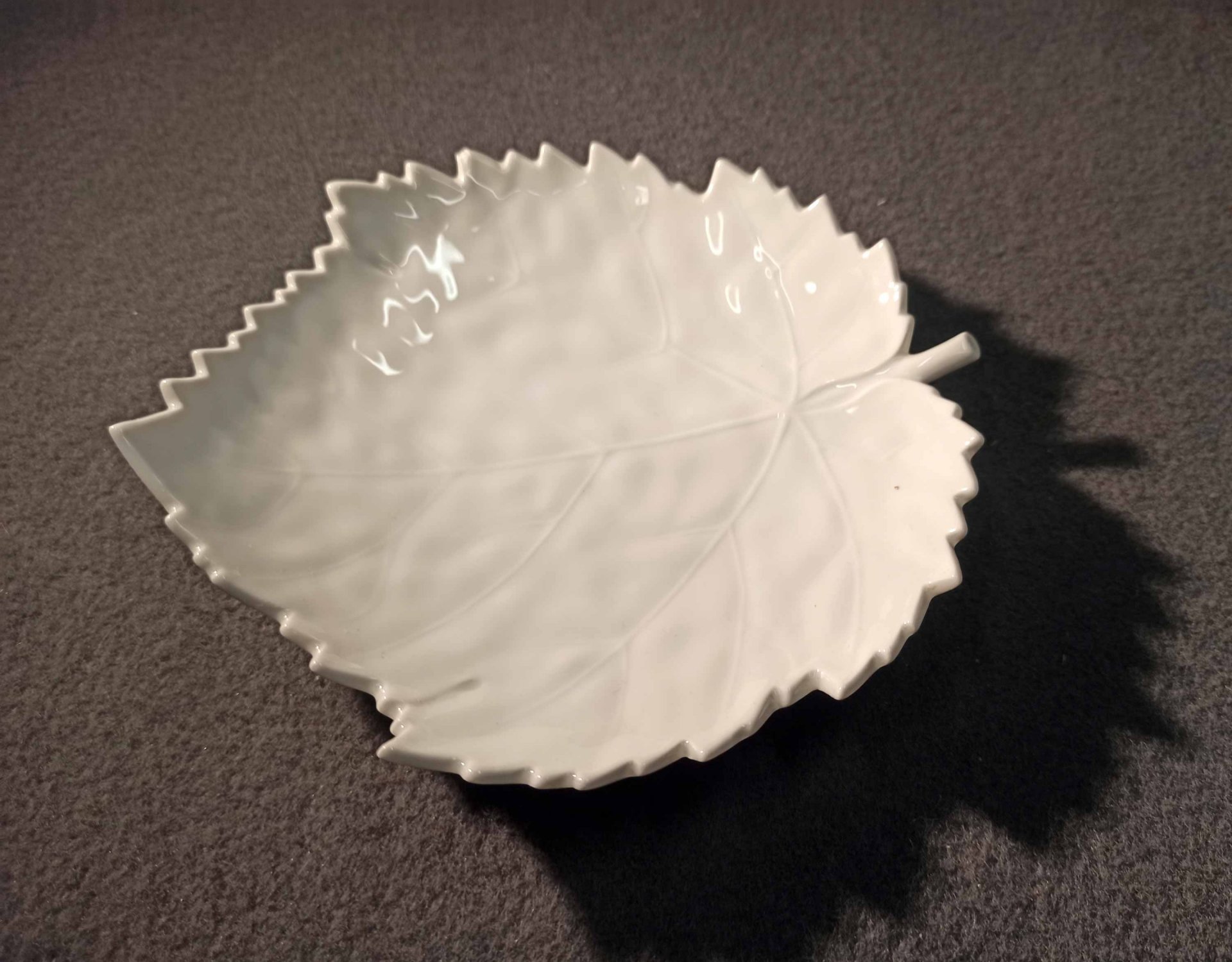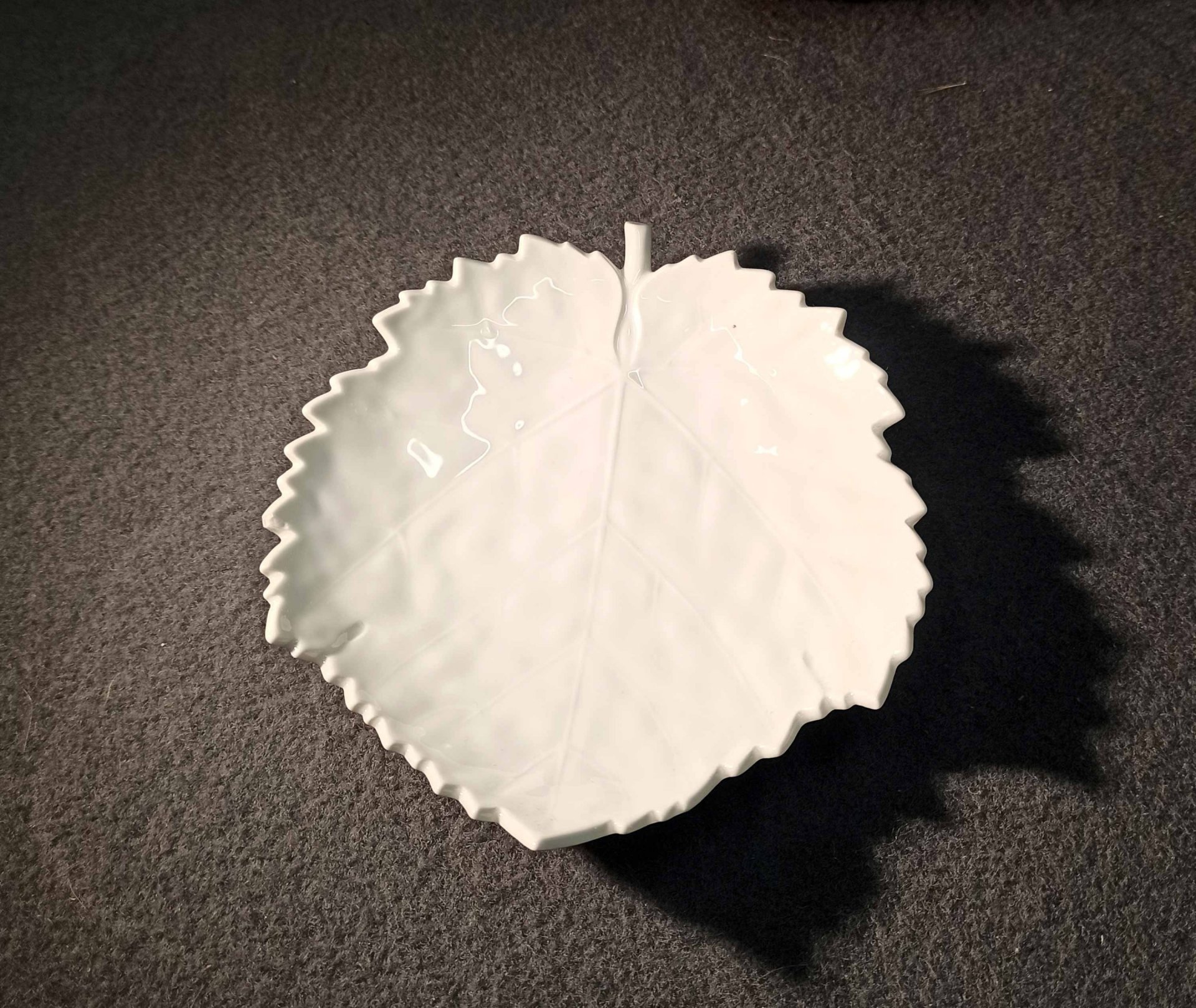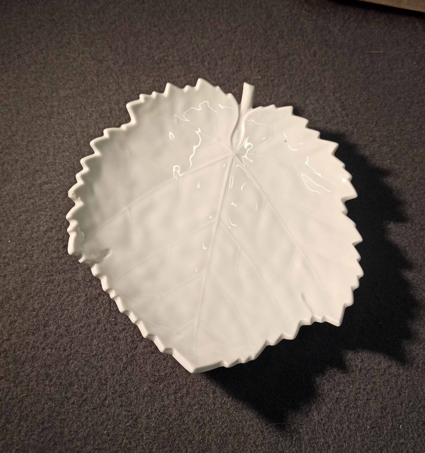 KPM Berlin, kleine Schale, Blattschale in Weiß. Die Oberfläche naturalistisch reliefiert mit Blattrippen etc. Kleine, unauffällige Fehlstelle an einer Blattspitze (Foto). L.x B. ca 16,5 x 15 cm. Zeptermarke der KPM Berlin