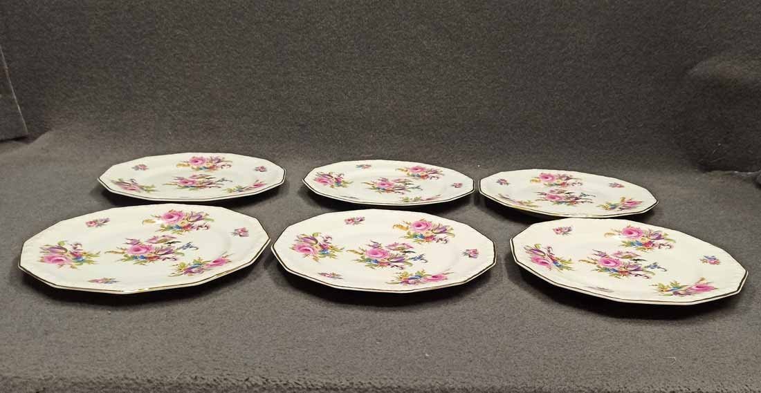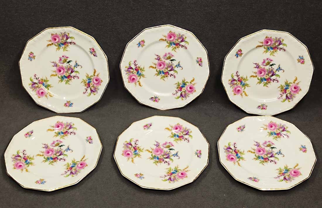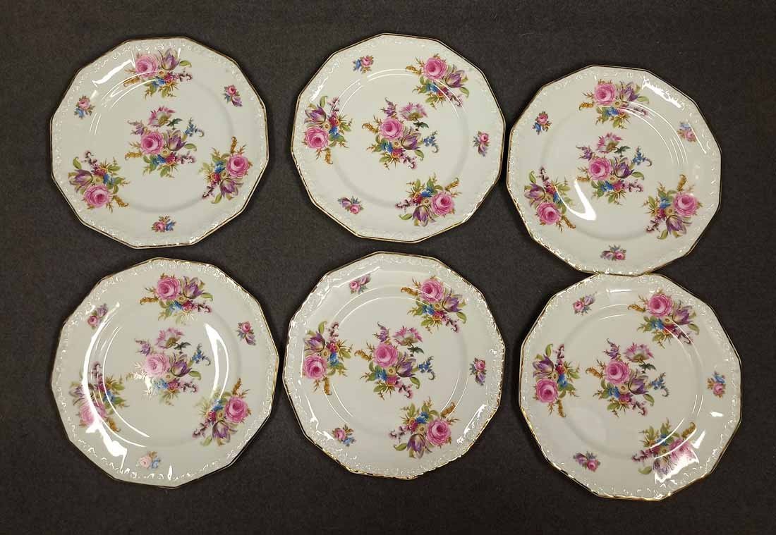 6x Speiseteller Maria mit reicher Blumenmalerei und Goldrand. Sehr schöne identische Teller in sehr gutem Zustand, ohne Beschädigungen. Flache Teller D. 20 cm. Manufaktur Marke von Rosenthal auf der Unterseite.