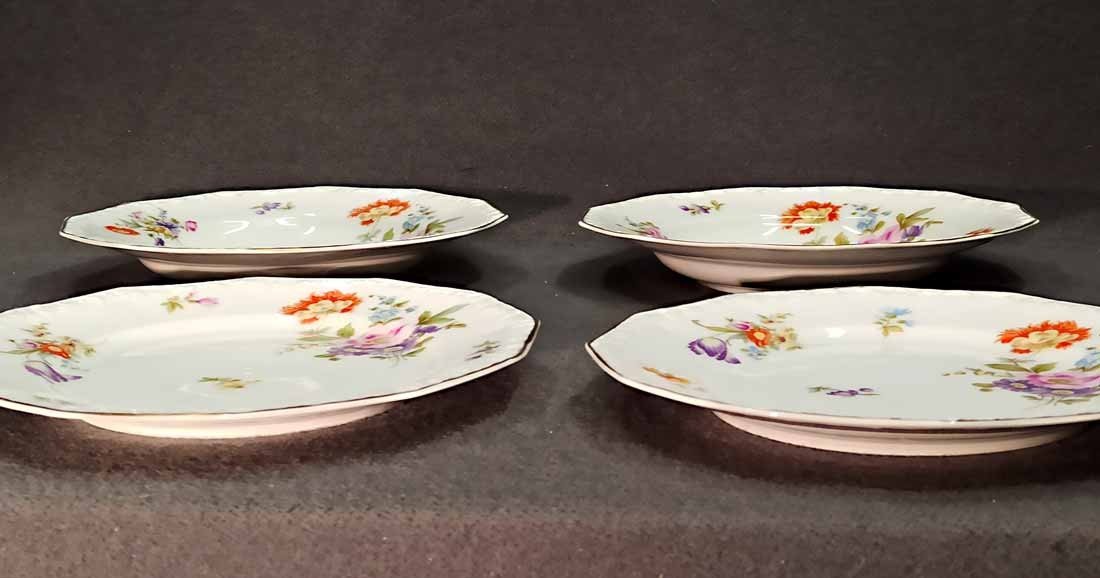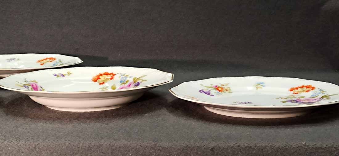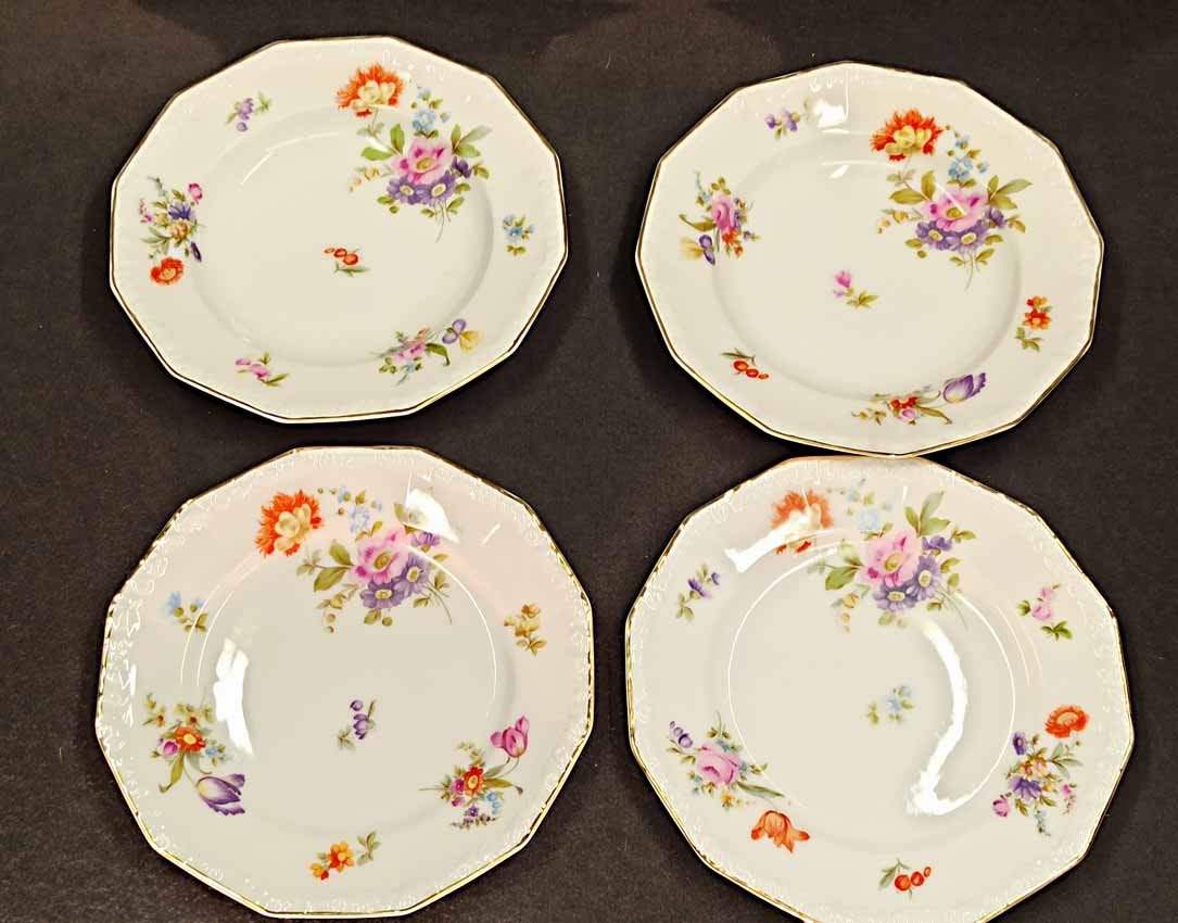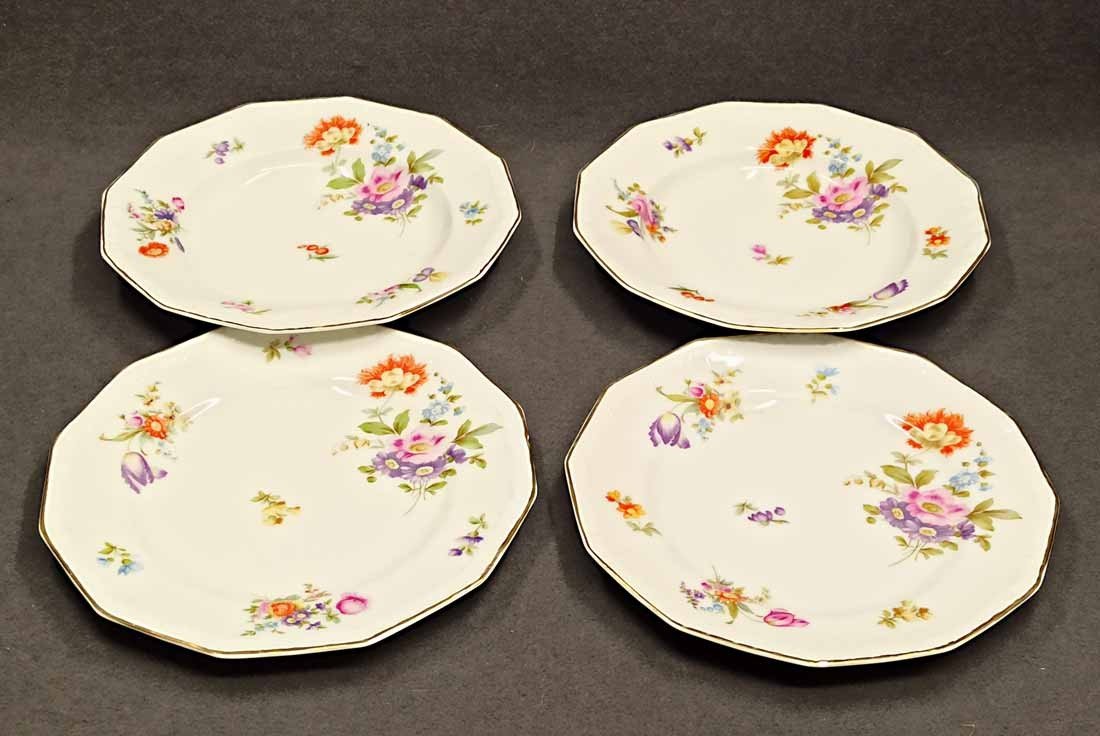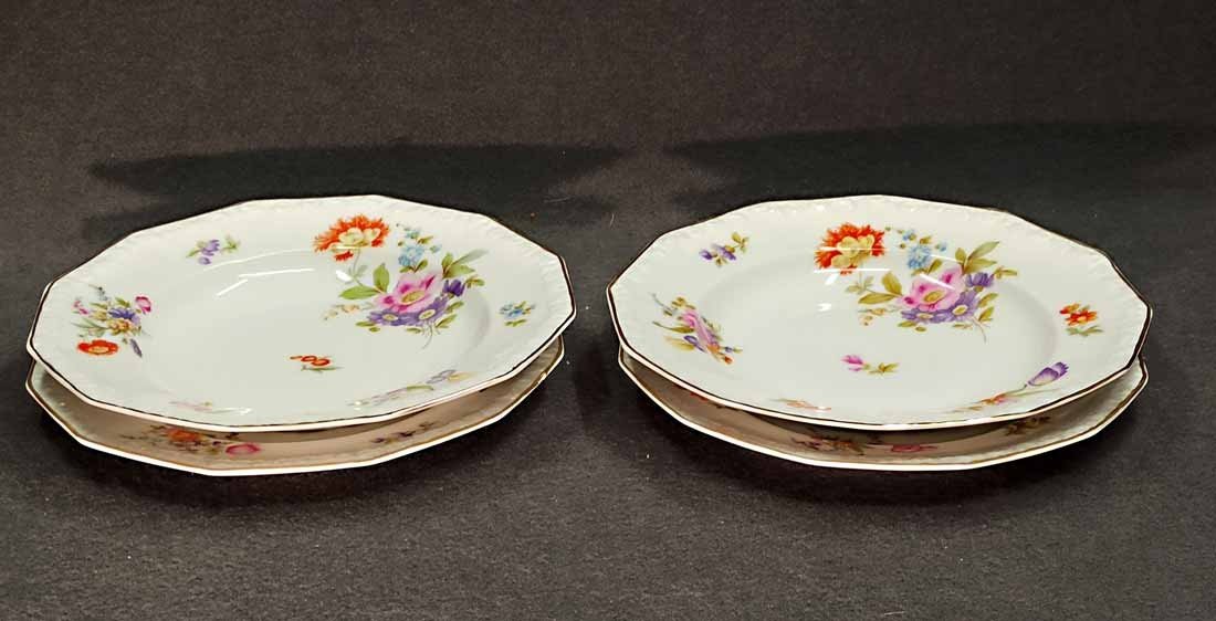 Rosenthal Maria mit Blumenmalerei und Goldrand. 4x Teller, identisch je 2x flache und 2x tiefe Teller. Großer Suppen- und Speiseteller D. 24,5 cm. Guter Zustand ohne Beschädigungen. Manufaktur Marke von Rosenthal auf der Unterseite.