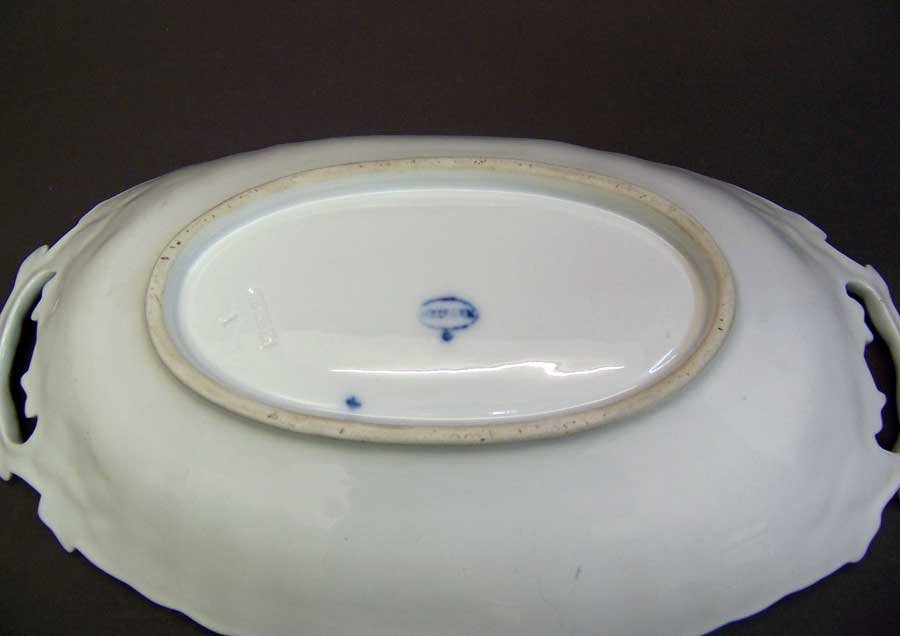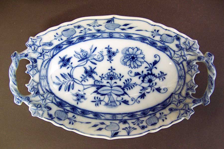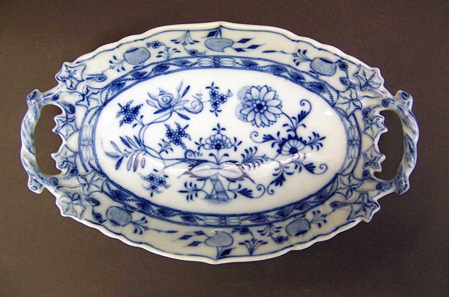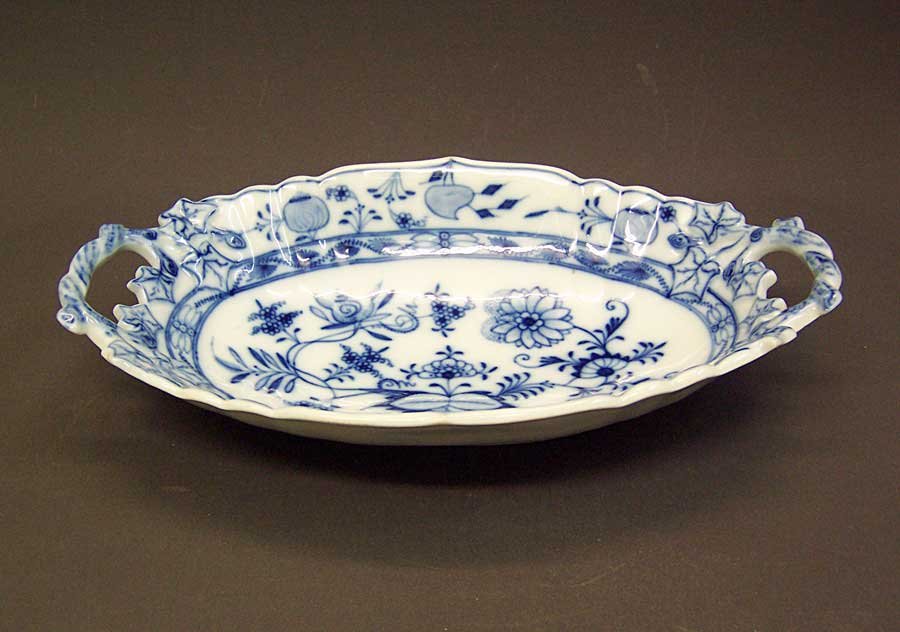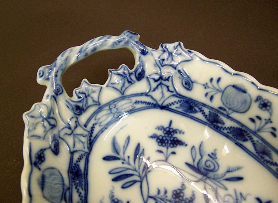 Schale mit Asthenkeln und Laub, Zwiebelmusterdekor. Ovale Schale mit Griffen in Form ineinander gedrehter Äste. Plastische (Wein?) Blätter.