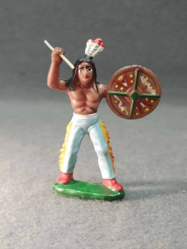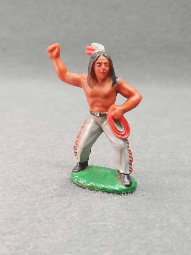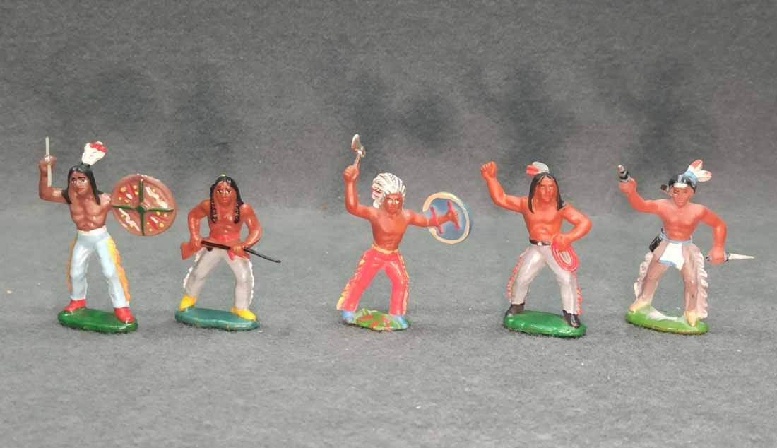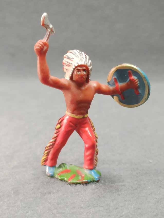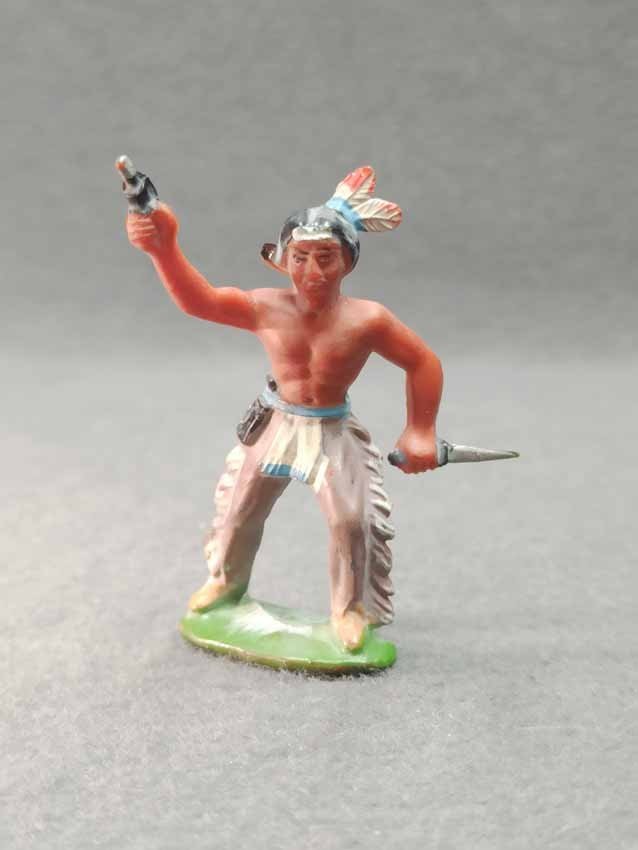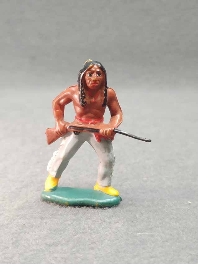 Indianer aus Kunststoff, original DDR. Es ist nicht gebrochen o.ä. (!einmal ohne Federschmuck). Zum weiteren Zustand bitte die Fotos ansehen. H. ca 7 - 8 cm
