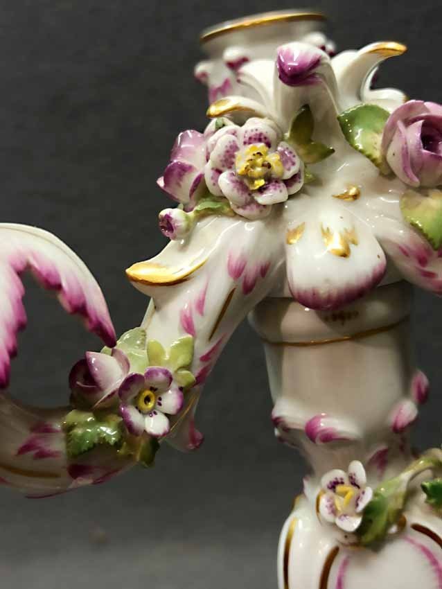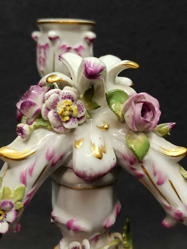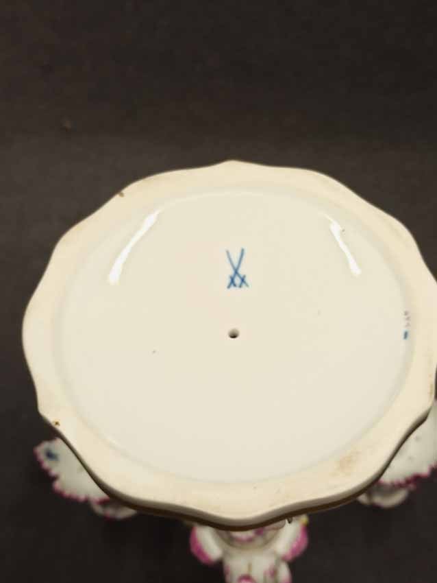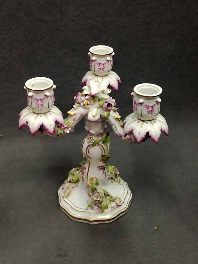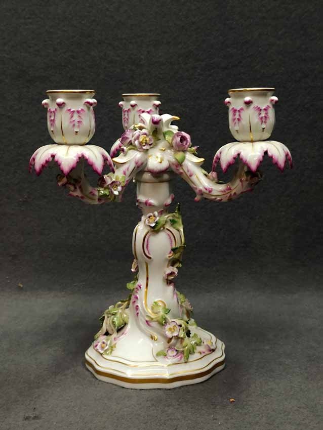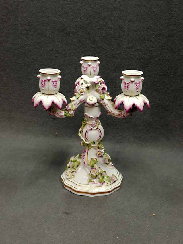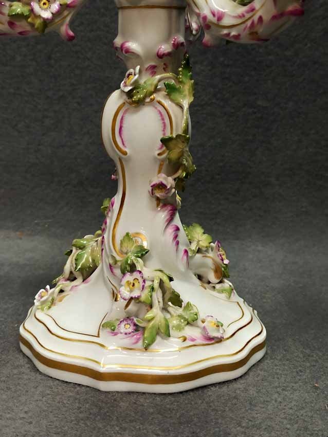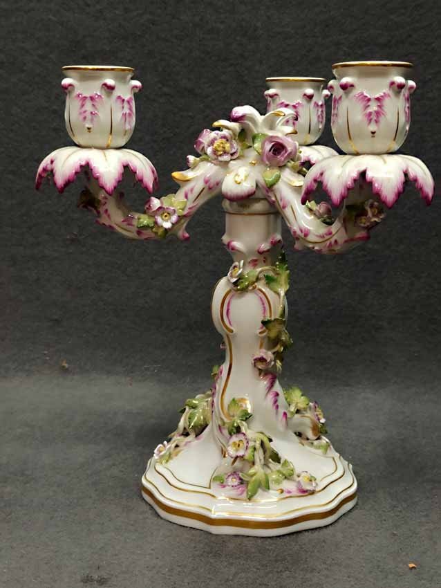 Manufaktur Meissen; Kerzenleuchter 3-flammig mit Blütenbesatz. H. 24 cm. Guter Zustand; 3 kleine, geringe Bestoßungen an Blütenblättern (Foto). Keine Beschädigungen oder Brüche. Schwertermarke der Manufaktur Meissen 1x gestrichen neben den Schwertern. Tüllen ebenfalls gemarkt.