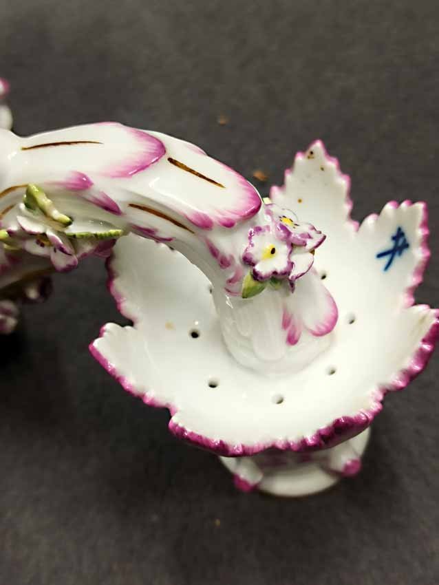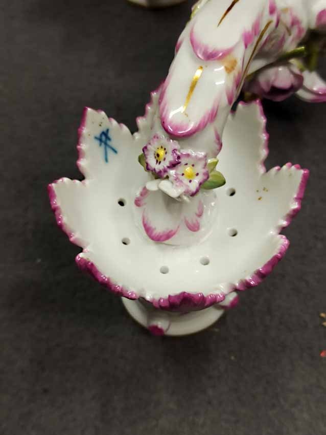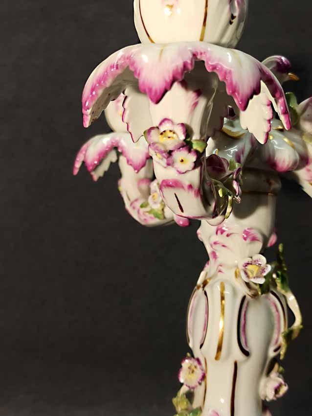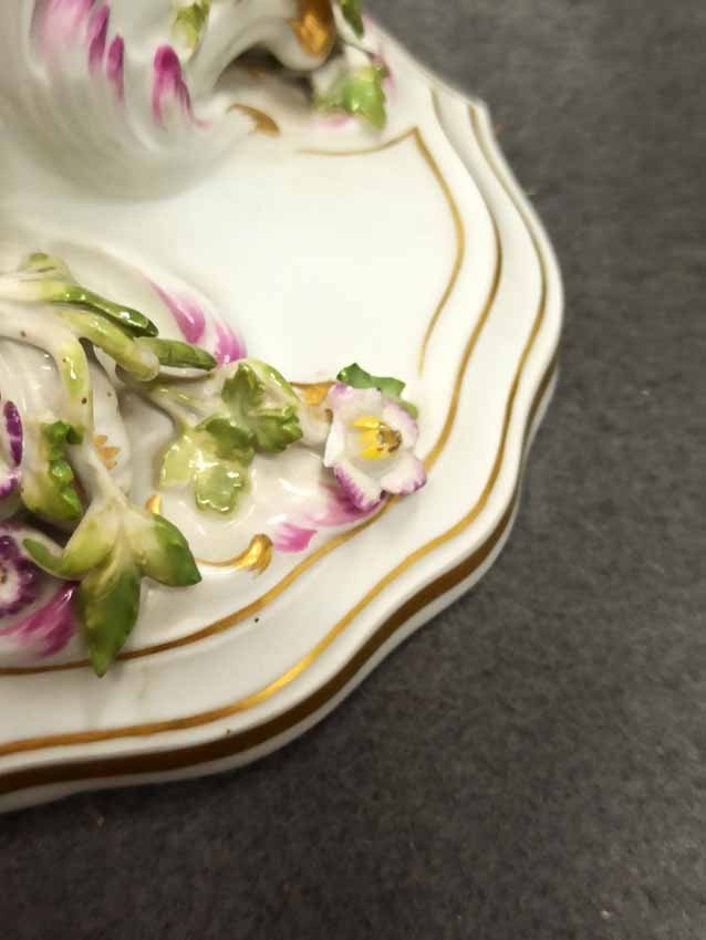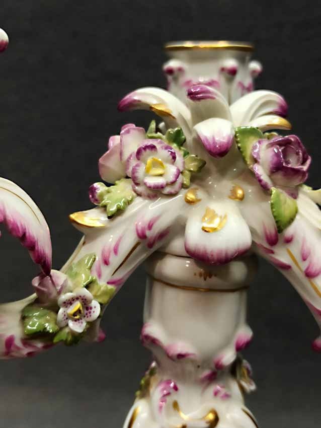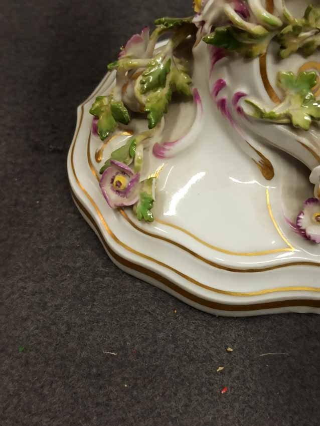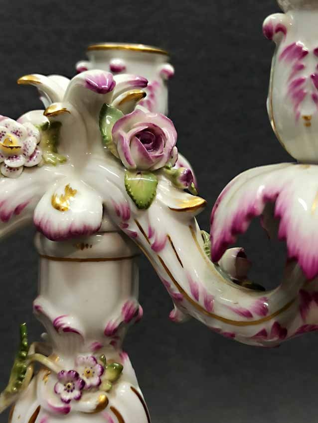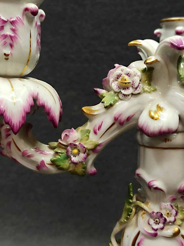 Manufaktur Meissen; Kerzenleuchter 3-flammig mit Blütenbesatz. H. 24 cm. Guter Zustand; 3 kleine, geringe Bestoßungen an Blütenblättern (Foto). Keine Beschädigungen oder Brüche. Schwertermarke der Manufaktur Meissen 1x gestrichen neben den Schwertern. Tüllen ebenfalls gemarkt.