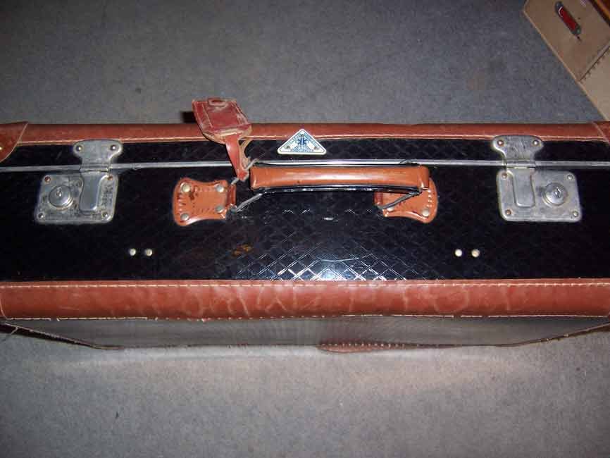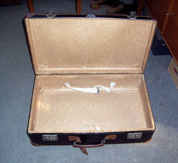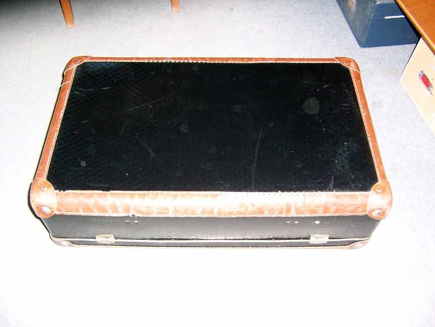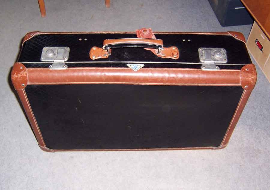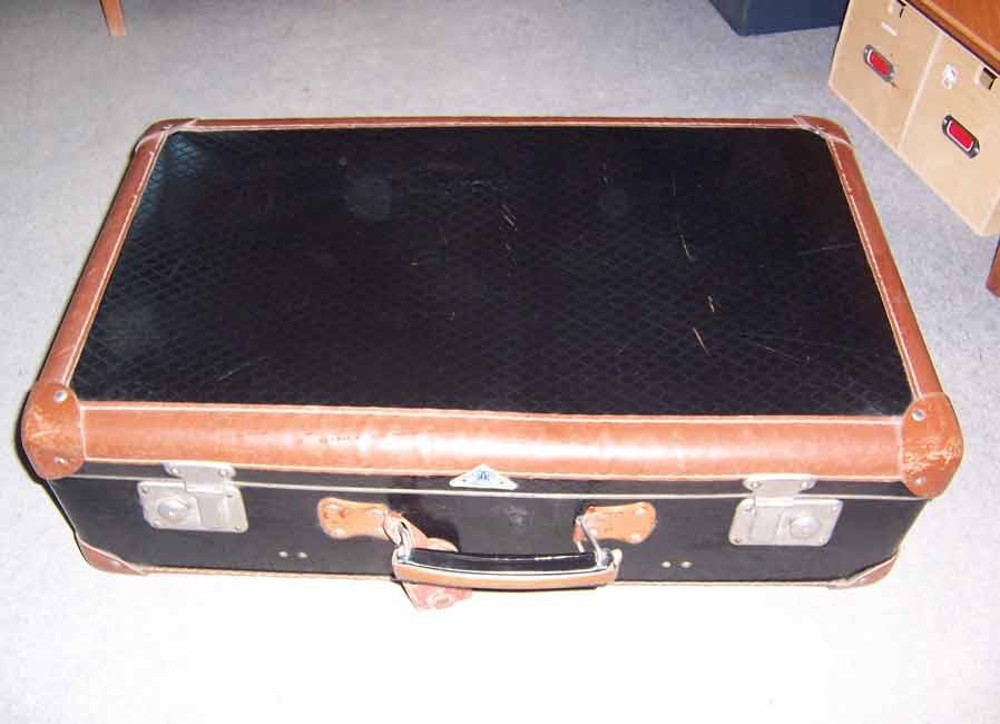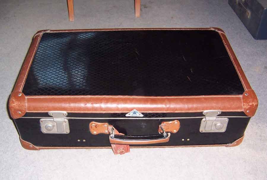 Koffer, schwarz mit eingeprägtem Rautenmuster. Guter Zustand,benutzbar oder als Deko. Rückseitig eine der Lederkanten stellenweise gelöst. Mit Firmenplakette.