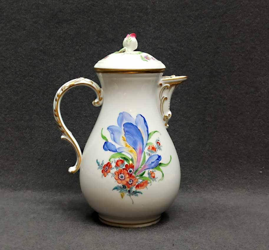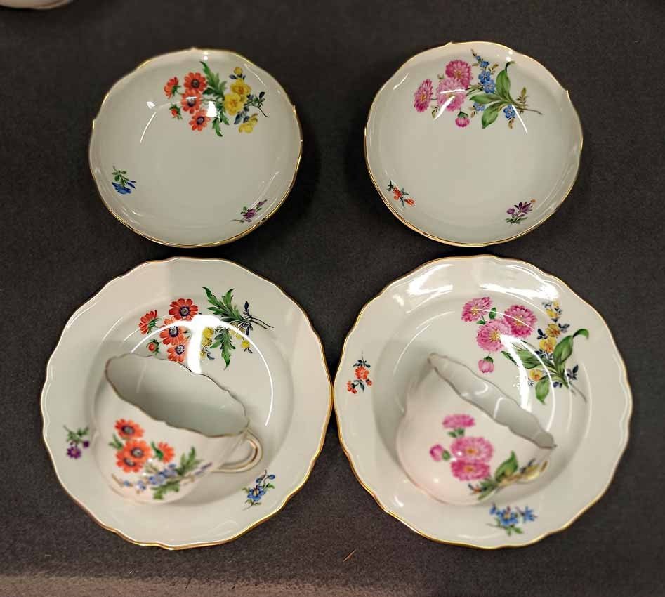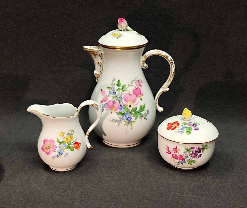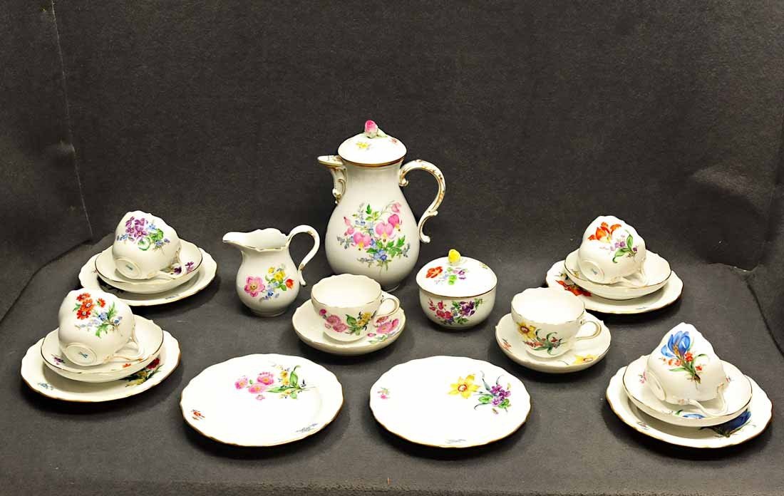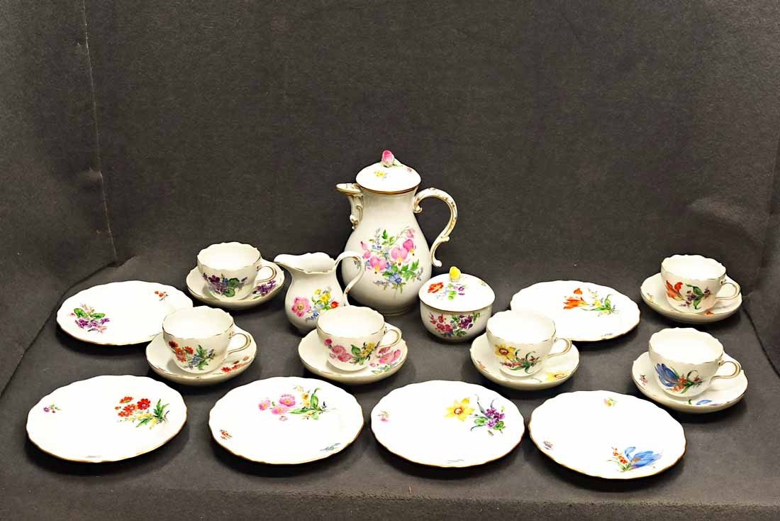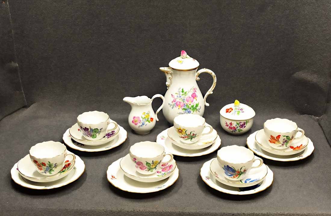Verkauft! Meissen, Kaffeeservice f. 6 Personen, 21 Teile. Blumendekor mit Goldrand. Alle Teile mit schön gemalten, verschiedenen Blumenbuketts. Je Gedeck eine einheitliche Blume. Sehr guter Zustand ohne Beschädigungen, alle Deckelrosen i.O. Sehr schöne Hausmalerei. Aus dem Besitz einer Porzellanmalerin von Meissen, sogenannte Deputatware, Marke 4x gestrichen, für Angestellte der Manufaktur Meissen.