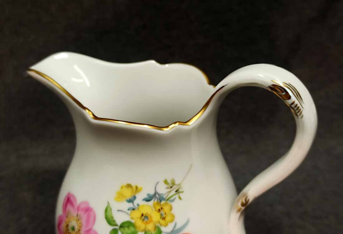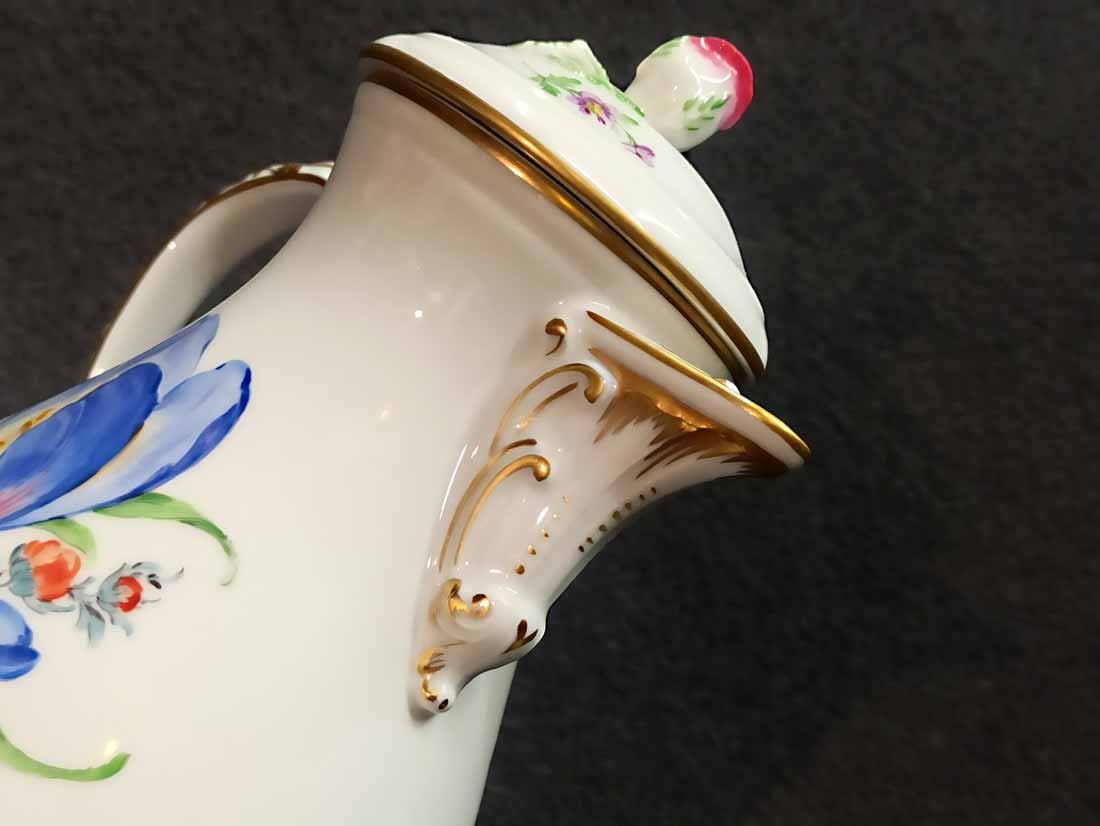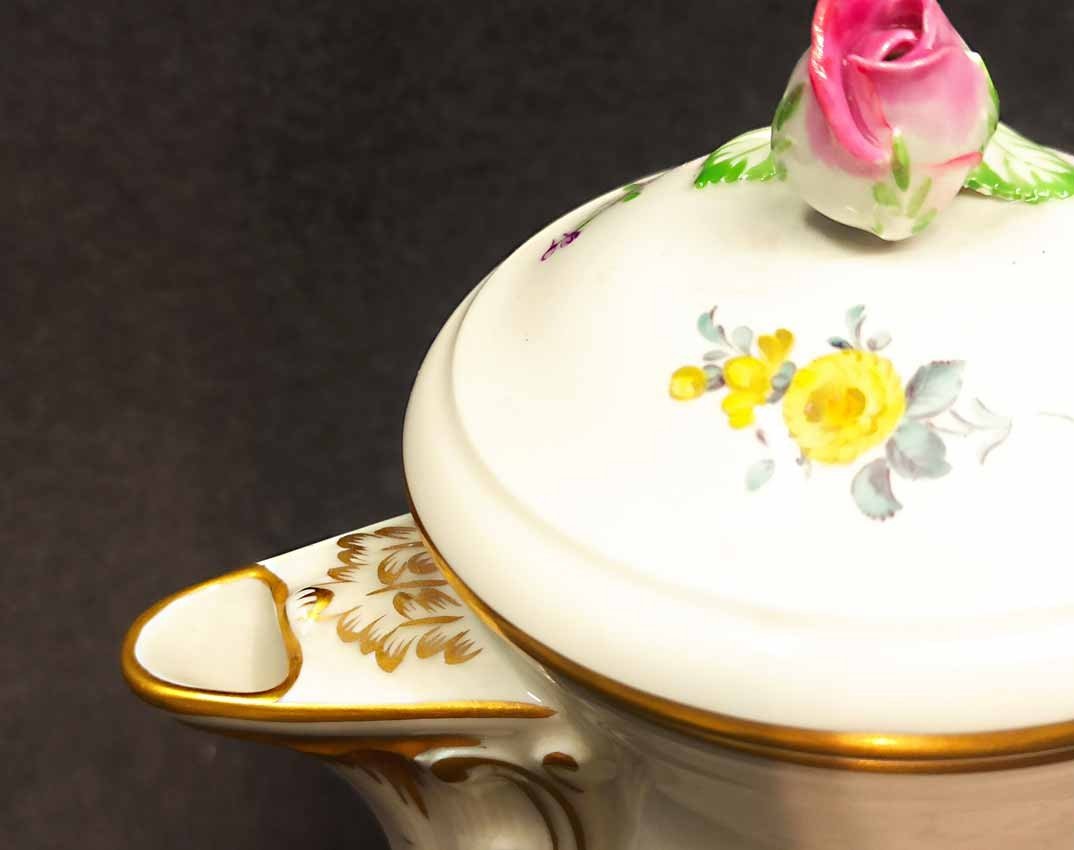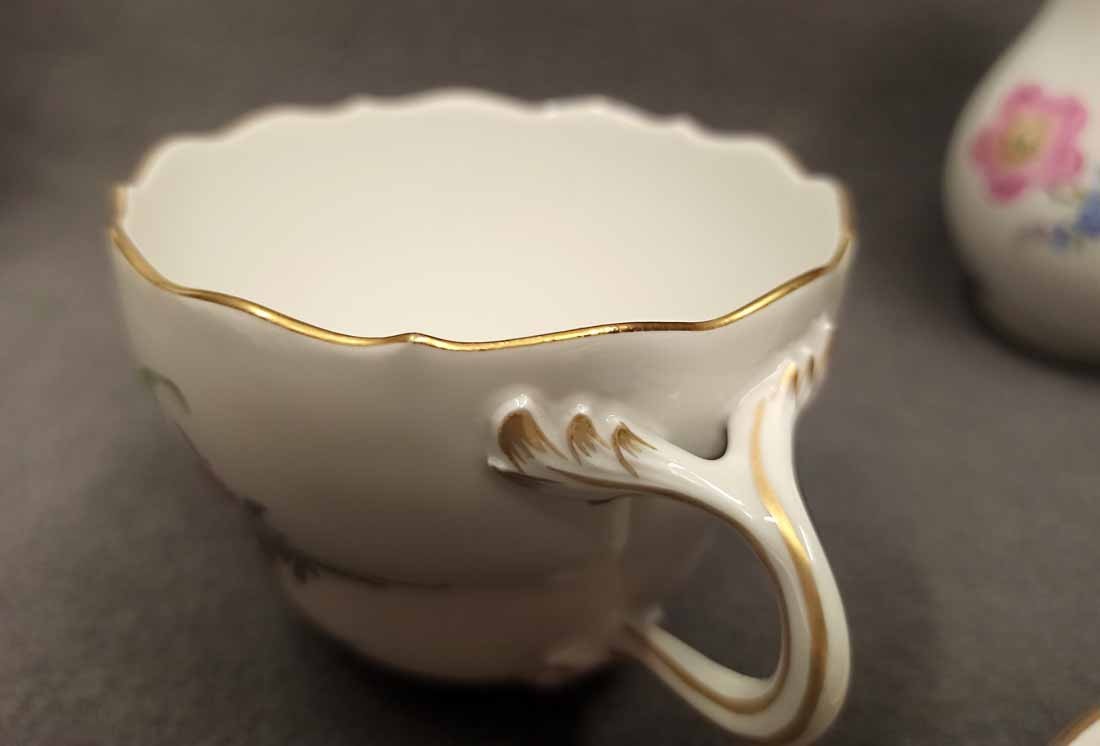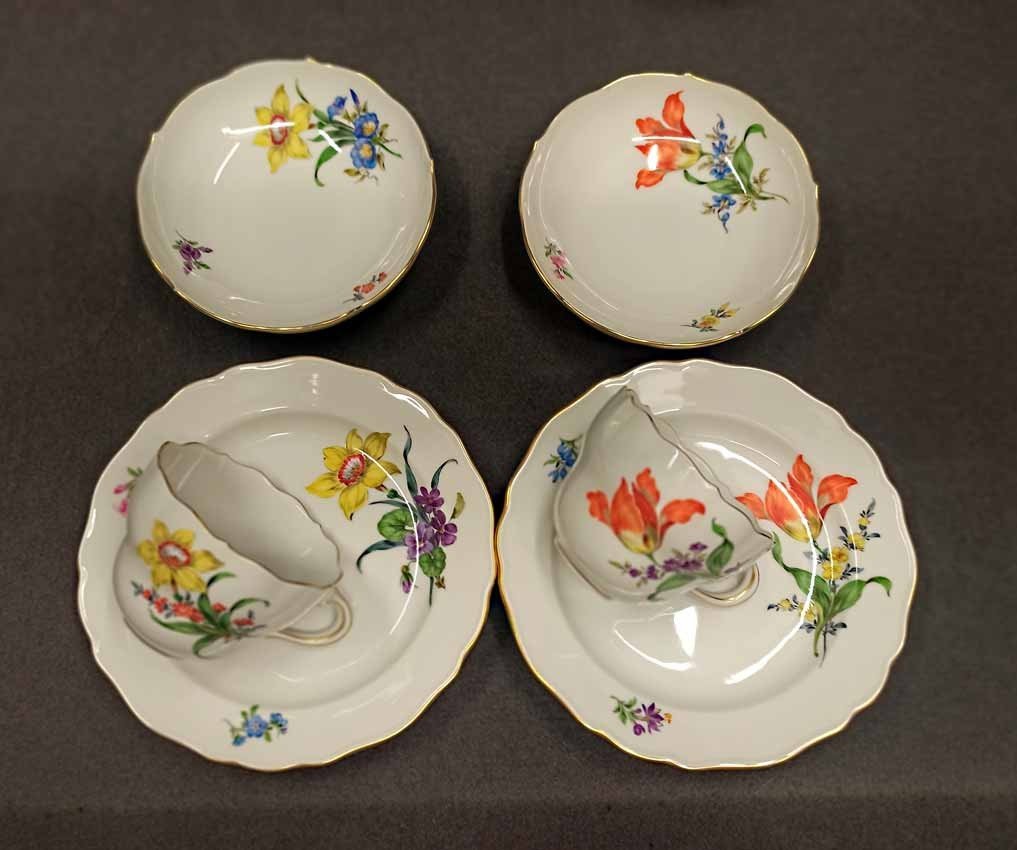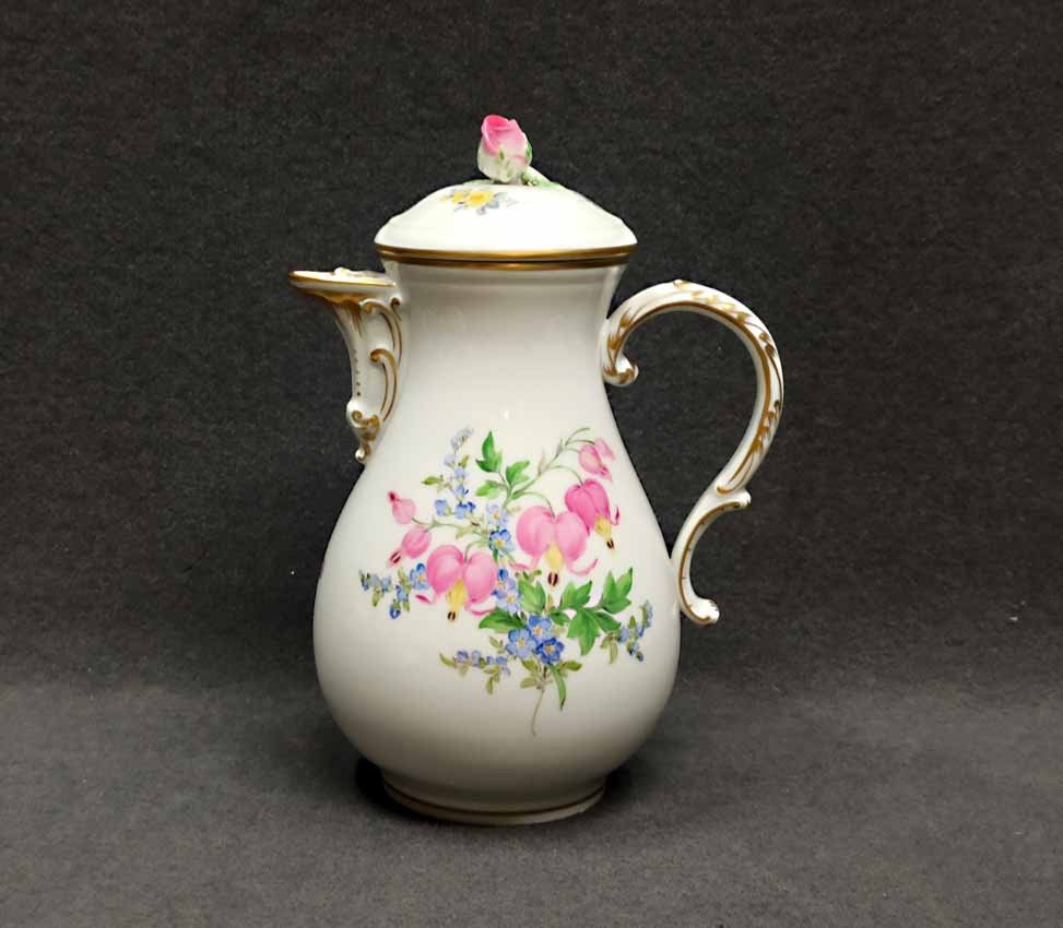 Verkauft! Meissen, Kaffeeservice f. 6 Personen, 21 Teile. Blumendekor mit Goldrand. Alle Teile mit schön gemalten, verschiedenen Blumenbuketts. Je Gedeck eine einheitliche Blume. Sehr guter Zustand ohne Beschädigungen, alle Deckelrosen i.O. Sehr schöne Hausmalerei. Aus dem Besitz einer Porzellanmalerin von Meissen, sogenannte Deputatware, Marke 4x gestrichen, für Angestellte der Manufaktur Meissen.