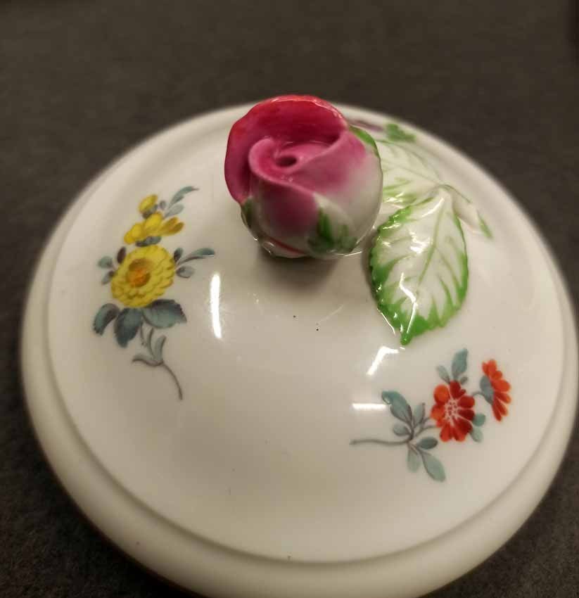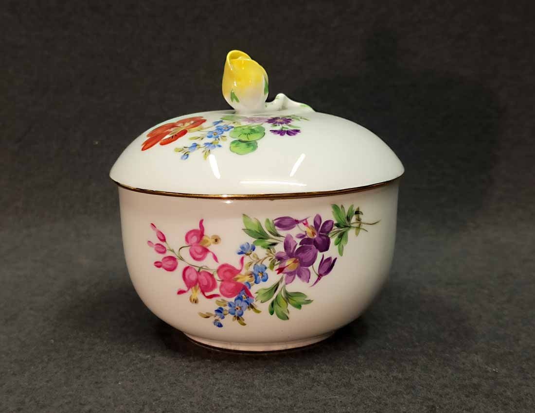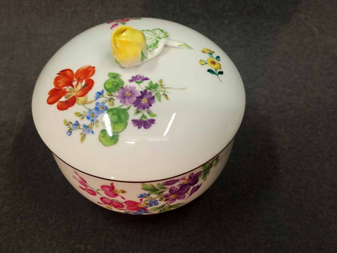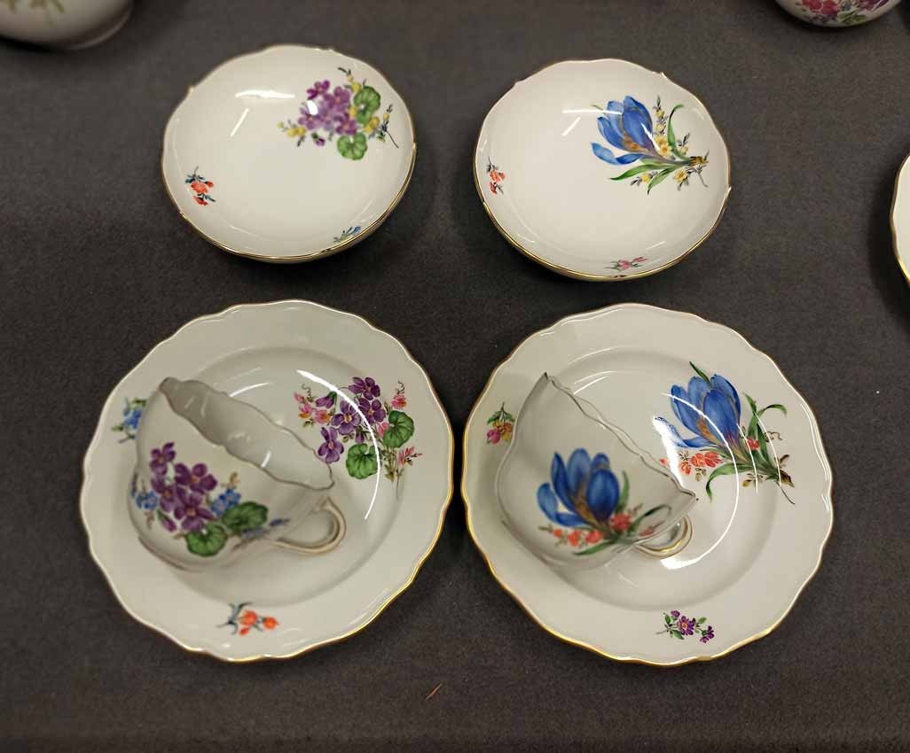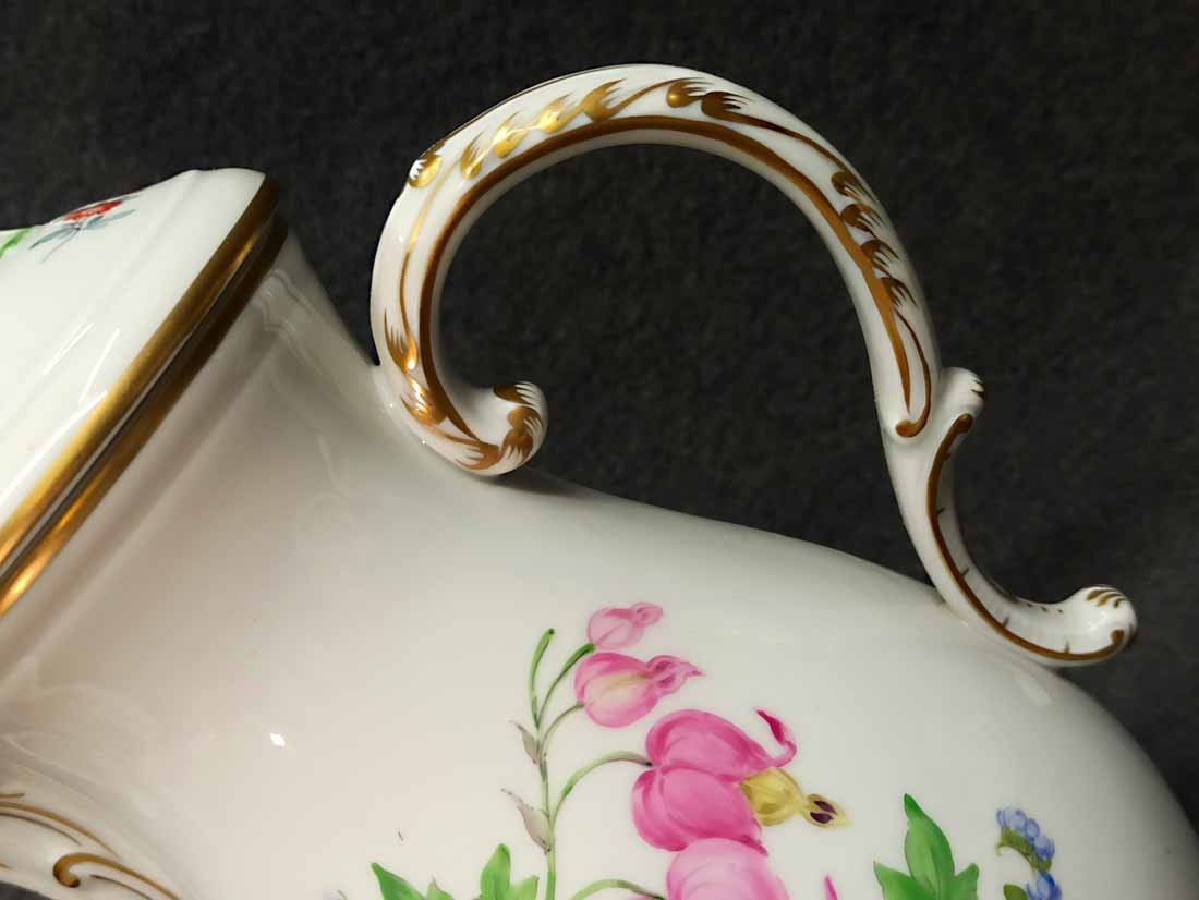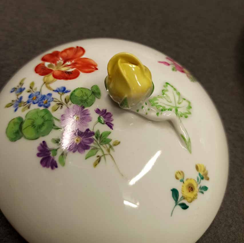 Verkauft! Meissen, Kaffeeservice f. 6 Personen, 21 Teile. Blumendekor mit Goldrand. Alle Teile mit schön gemalten, verschiedenen Blumenbuketts. Je Gedeck eine einheitliche Blume. Sehr guter Zustand ohne Beschädigungen, alle Deckelrosen i.O. Sehr schöne Hausmalerei. Aus dem Besitz einer Porzellanmalerin von Meissen, sogenannte Deputatware, Marke 4x gestrichen, für Angestellte der Manufaktur Meissen.