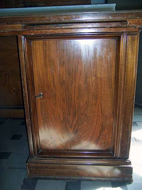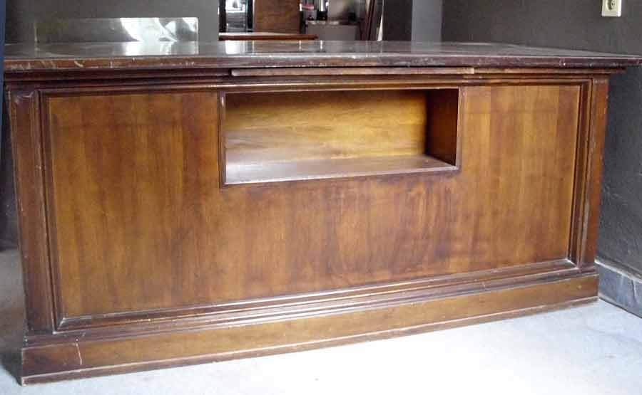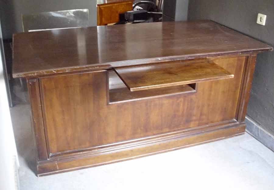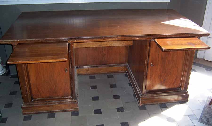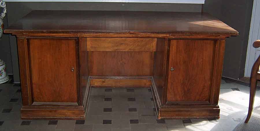Großer Schreibtisch um 1920. Strenge, gerade Optik, gegliedert durch Abstufungen im Sockel- und Topbereich, seitl. Lisenen. Rückseite ebenfalls furniert, mit Regalfach und ausziehbarer Arbeitsplatte. Frei stellbar im Raum und rückseitig nutzbar. Links mit 4 Schubkästen, Rechts mit Einlegebrett. Seitl. zusätzlich zwei Arbeitsplatten zum ausziehen. Gut in Ordnung mit Gebrauchsspuren, gleich nutzbar.
