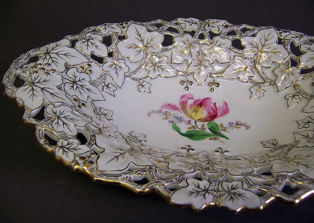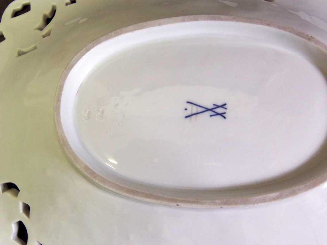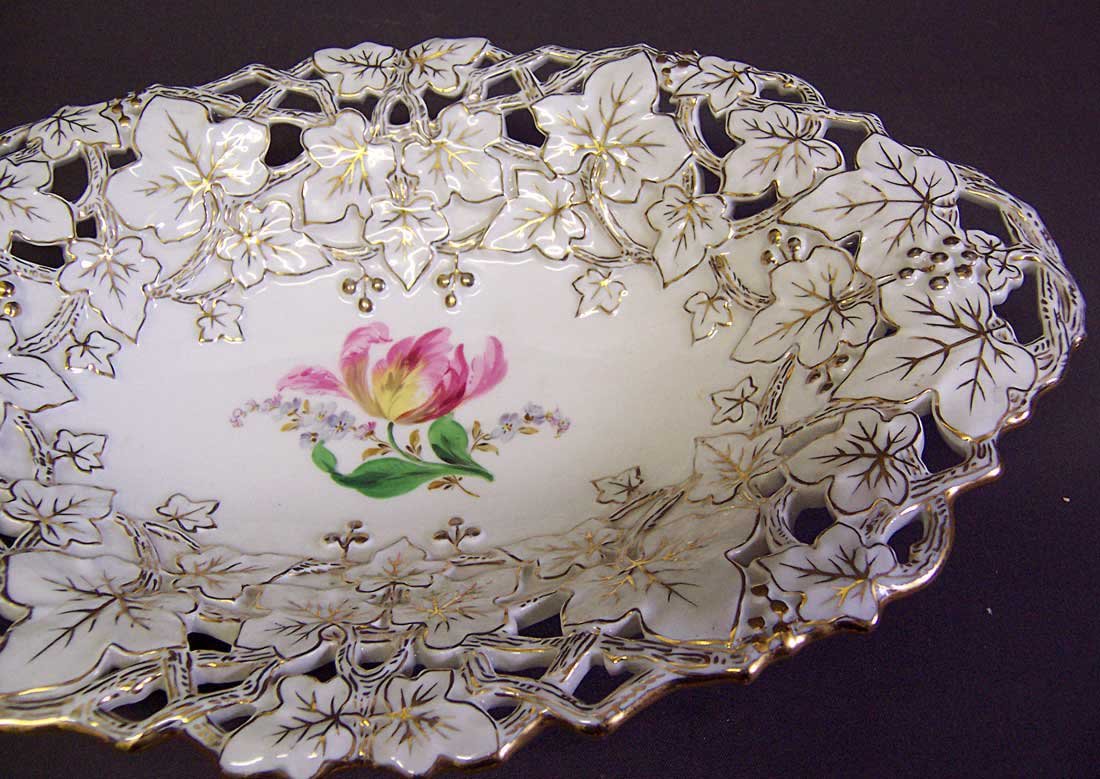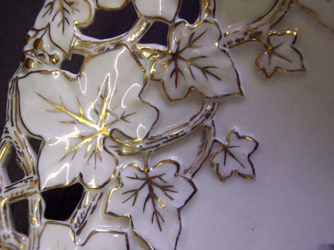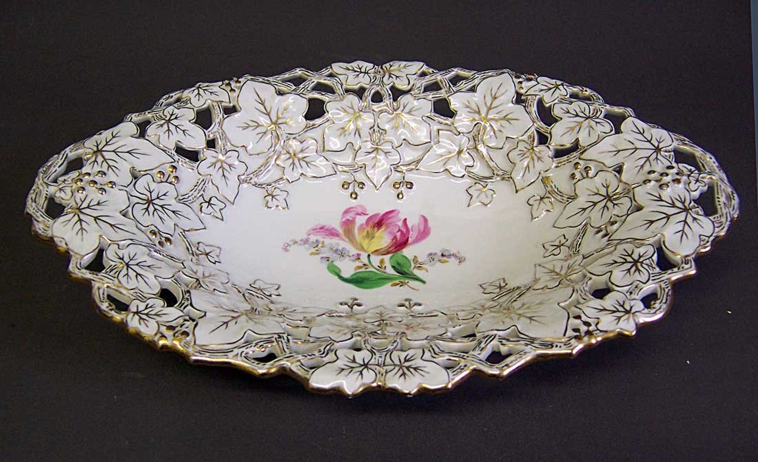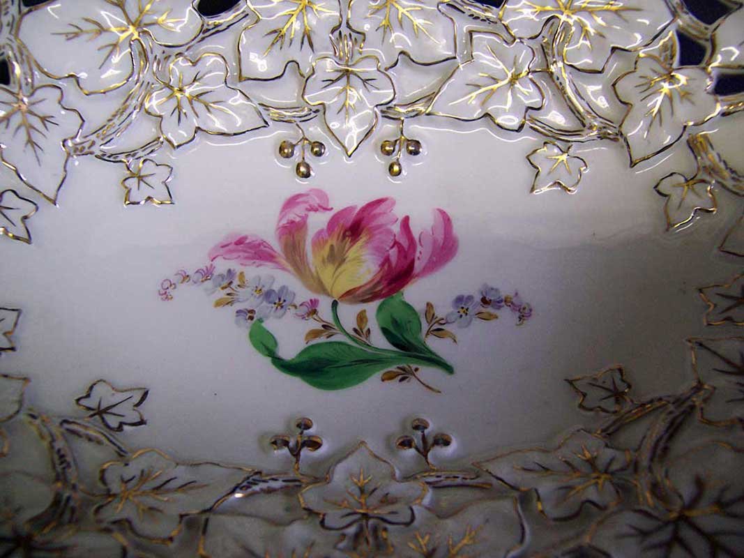 Prunkschale, Meissen Porzellan. Weisse Schale, durchbrochener Rand mit floralem Weinlaubrelief, vergoldet. Mittig Blumenmalerei.