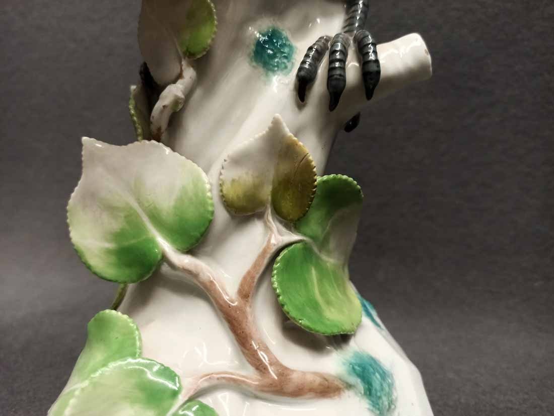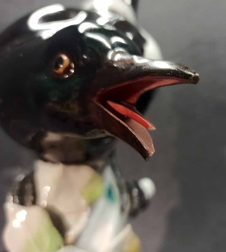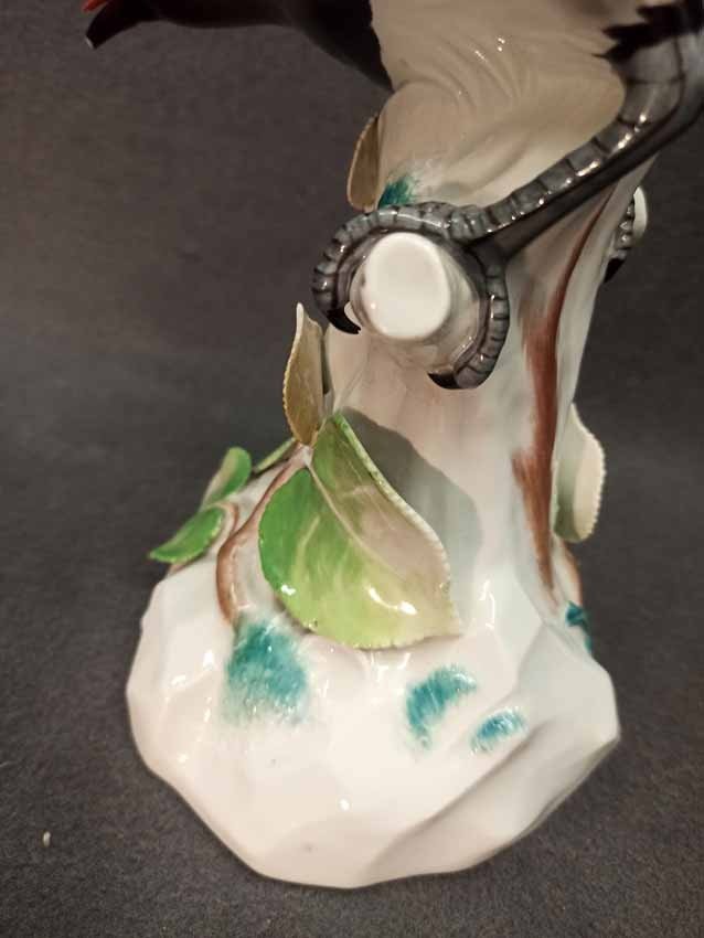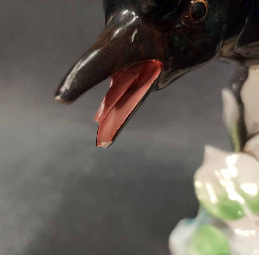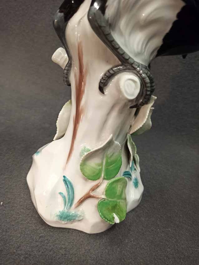 Reserviert! Meissen, große Figur Elster. Knaufzeit um 1889-1900. 1.Wahl, Schwertermarke der Manufaktur Meissen ohne Schleifstriche, Knaufschwerter. H. 52,5 cm. Figur mit Drei kleineren Defekten. Ein Blatt bestoßen mit größerem Chip. Ein Blatt alt restauriert, diese Restaurierung a.g. des Alters farblich abweichend. Schnabelspitzen und Zunge bestoßen. Flügelspitzen und Schwanz sind unbeschädigt und unrestauriert. H. 52,5 cm.