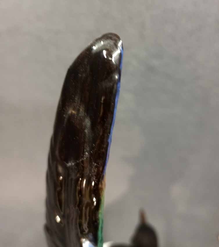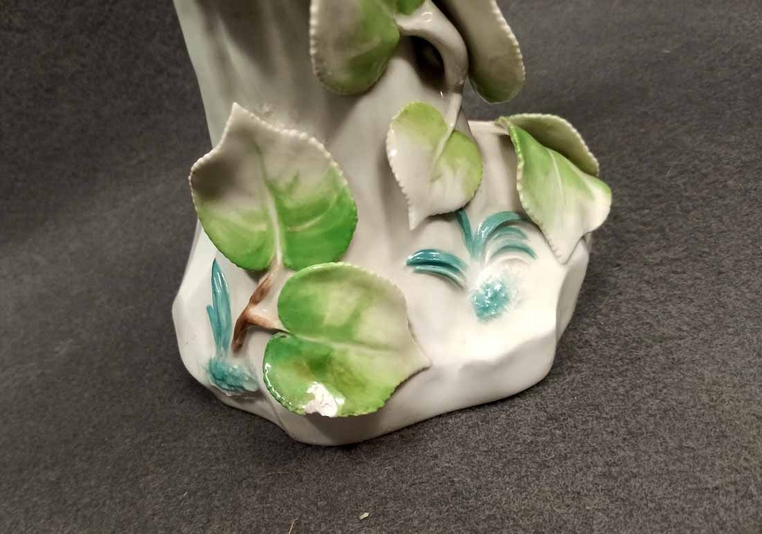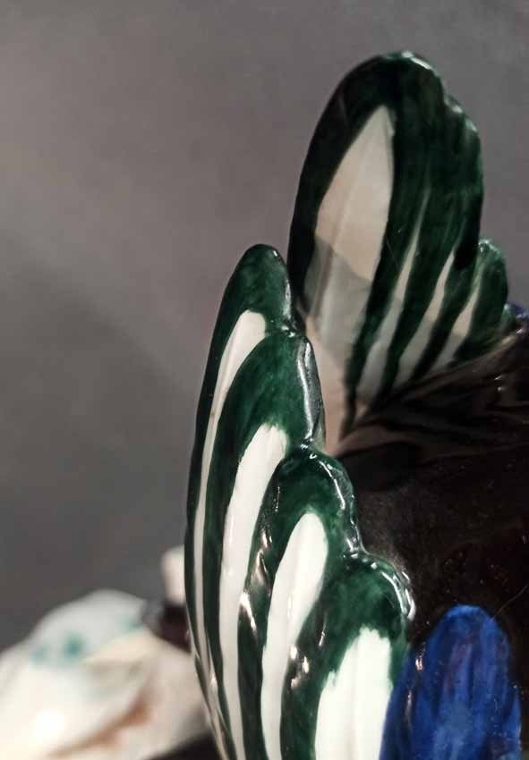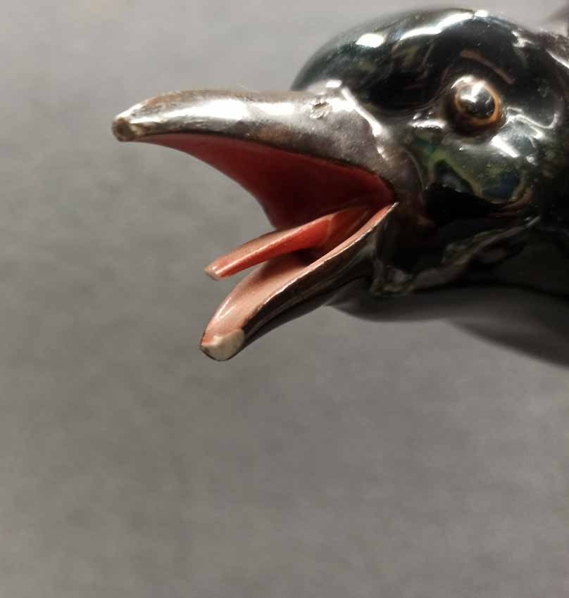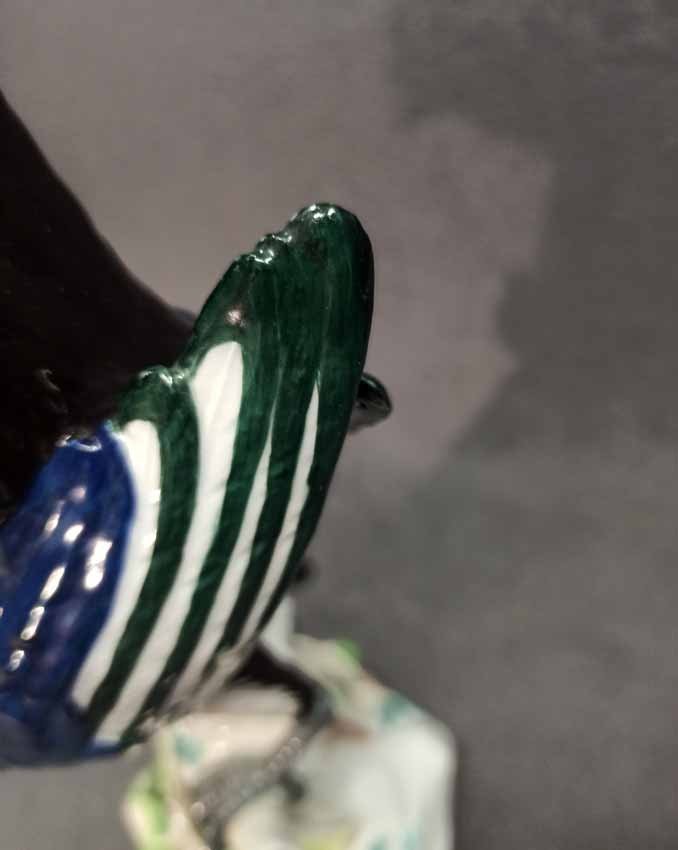 Reserviert! Meissen, große Figur Elster. Knaufzeit um 1889-1900. 1.Wahl, Schwertermarke der Manufaktur Meissen ohne Schleifstriche, Knaufschwerter. H. 52,5 cm. Figur mit Drei kleineren Defekten. Ein Blatt bestoßen mit größerem Chip. Ein Blatt alt restauriert, diese Restaurierung a.g. des Alters farblich abweichend. Schnabelspitzen und Zunge bestoßen. Flügelspitzen und Schwanz sind unbeschädigt und unrestauriert. H. 52,5 cm.
