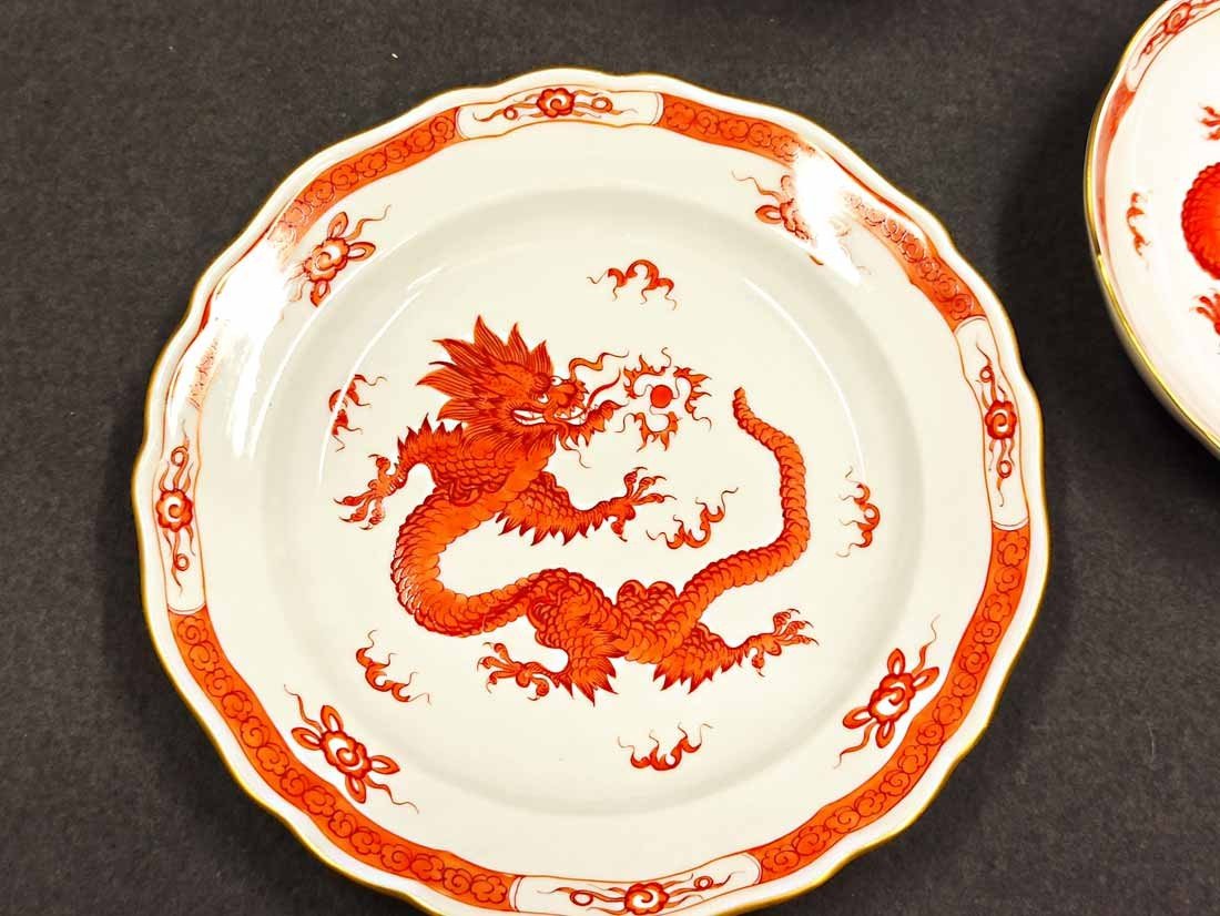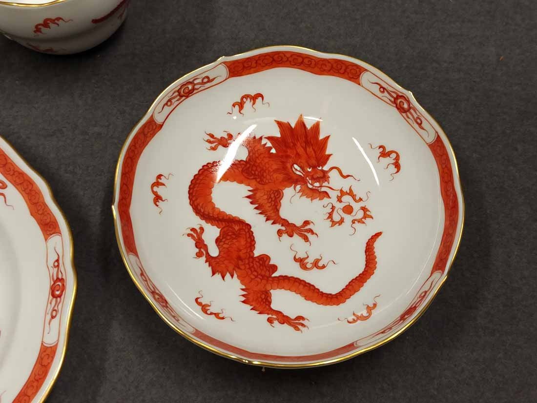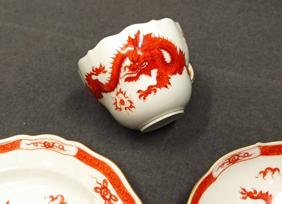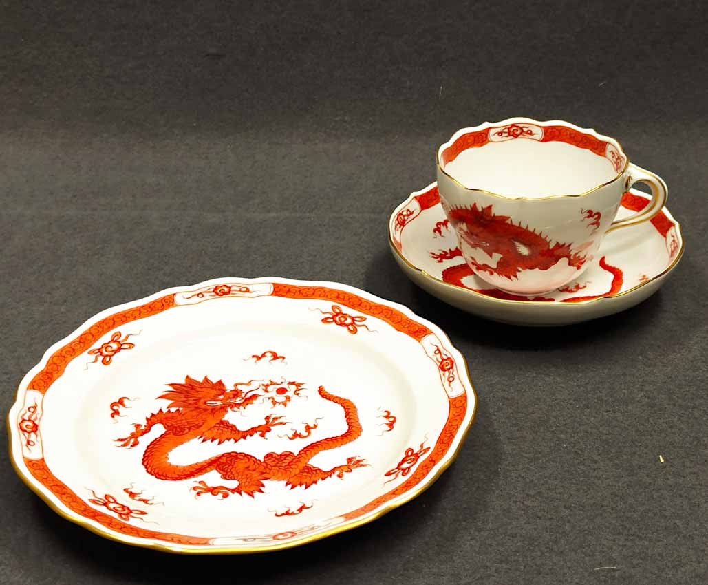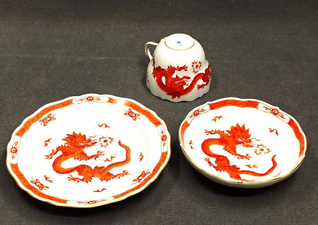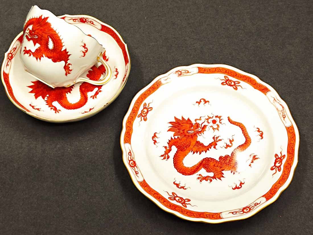 Meissen, Roter Drache. Gedeck, 3 tlg. Tasse, Untertasse und Kuchenteller. Sehr guter Zustand ohne Beschädigungen. A.d. Fotos weichen die Farben der 3 Teile untereinander ab, sie sind identisch. Schwertermarke 4x gestrichen, sogen. Deputat f. Mitarbeiter der Manufaktur. Tasse H. 6,5 cm, D. 9 cm; Kuchenteller D. 18,5 cm.