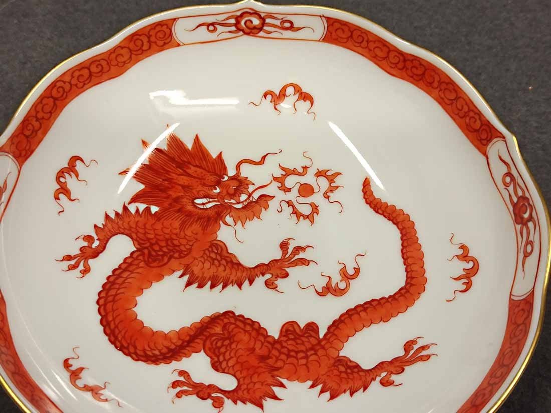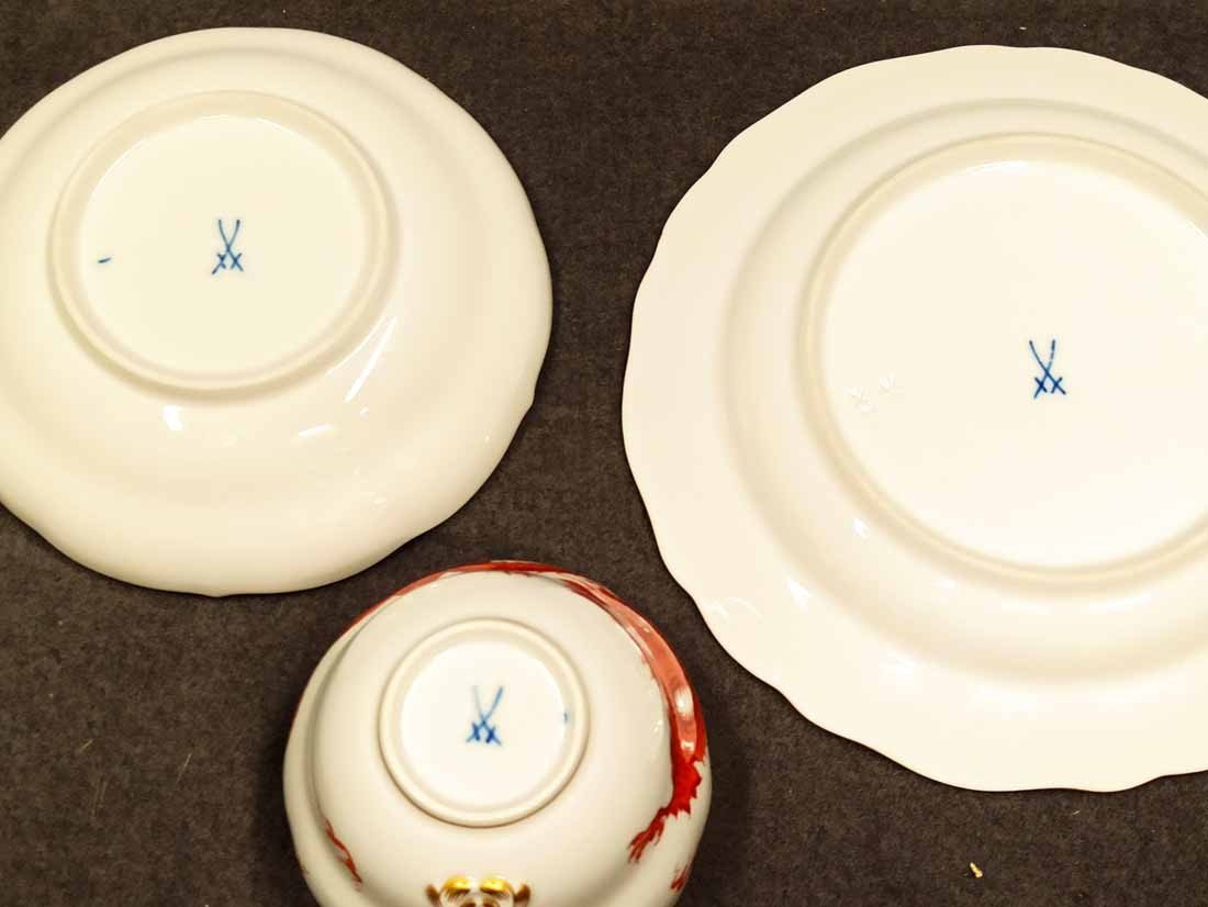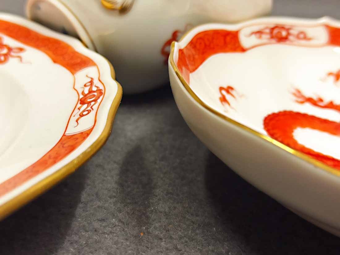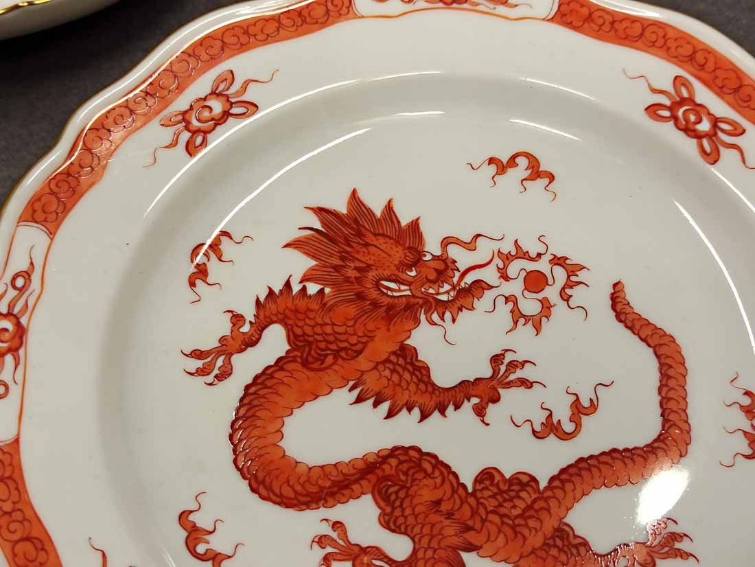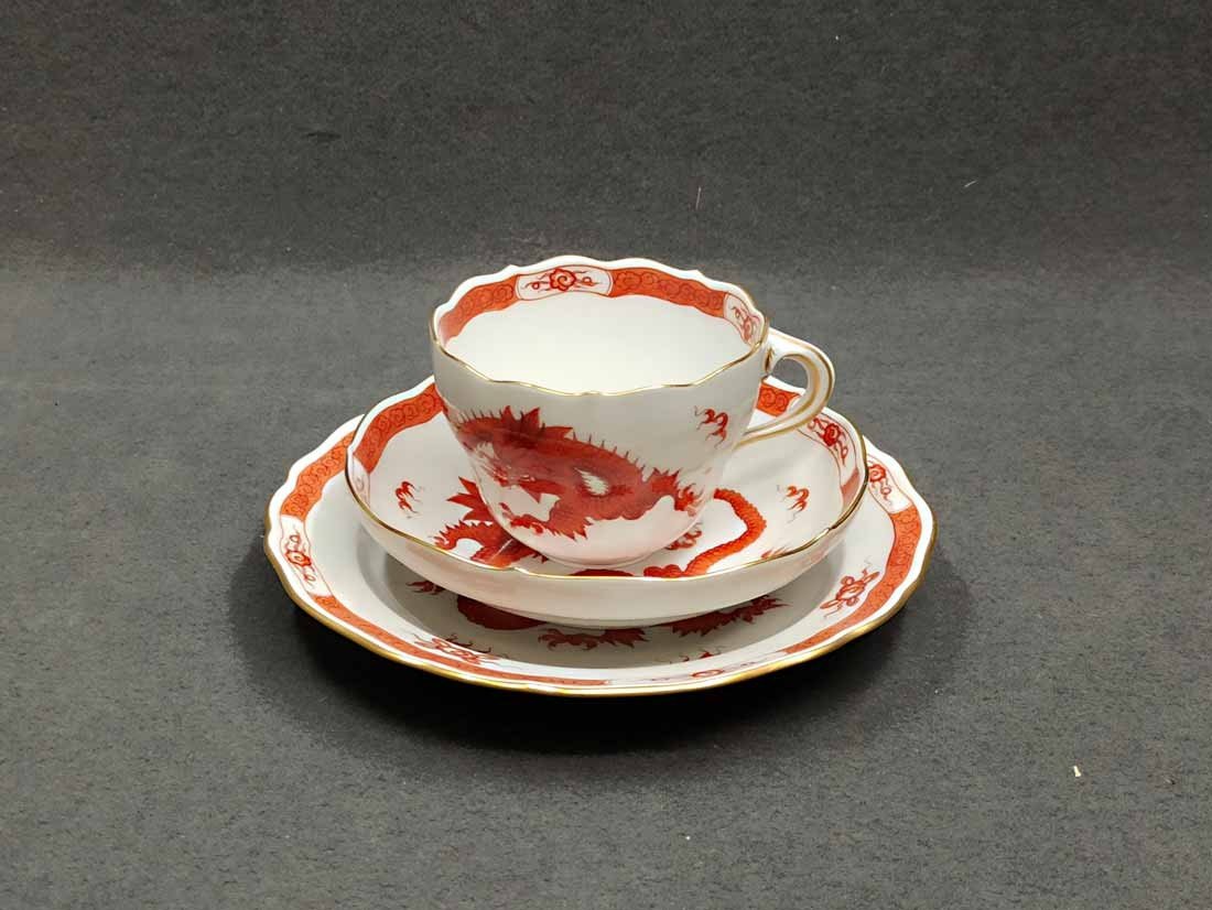 Meissen, Roter Drache. Gedeck, 3 tlg. Tasse, Untertasse und Kuchenteller. Sehr guter Zustand ohne Beschädigungen. A.d. Fotos weichen die Farben der 3 Teile untereinander ab, sie sind identisch. Schwertermarke 4x gestrichen, sogen. Deputat f. Mitarbeiter der Manufaktur. Tasse H. 6,5 cm, D. 9 cm; Kuchenteller D. 18,5 cm.