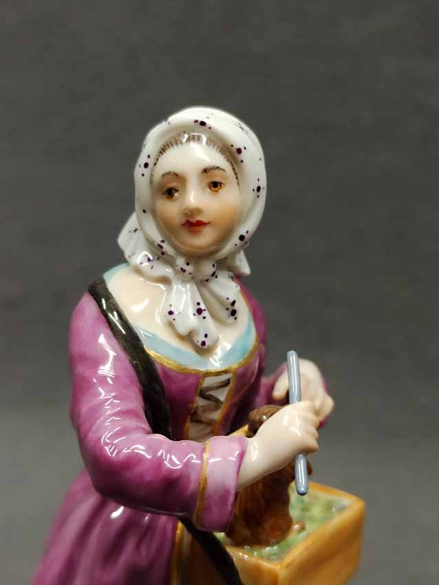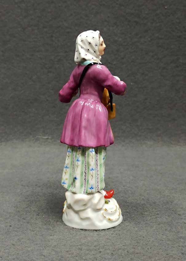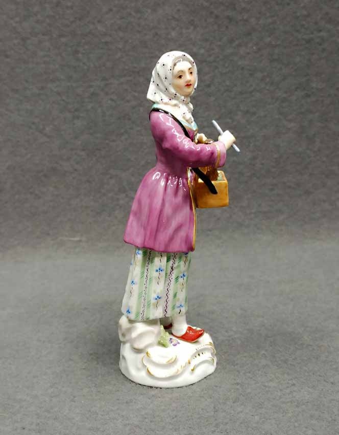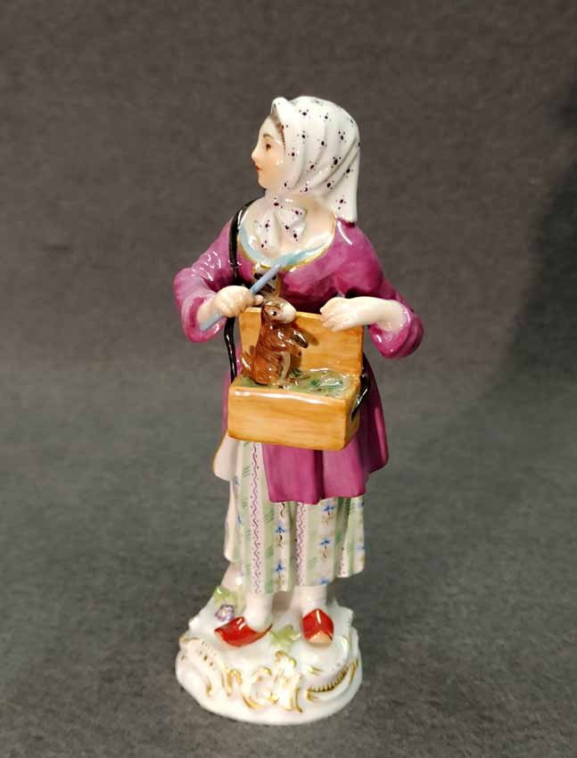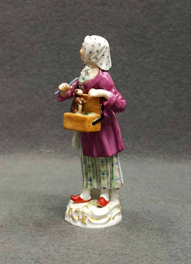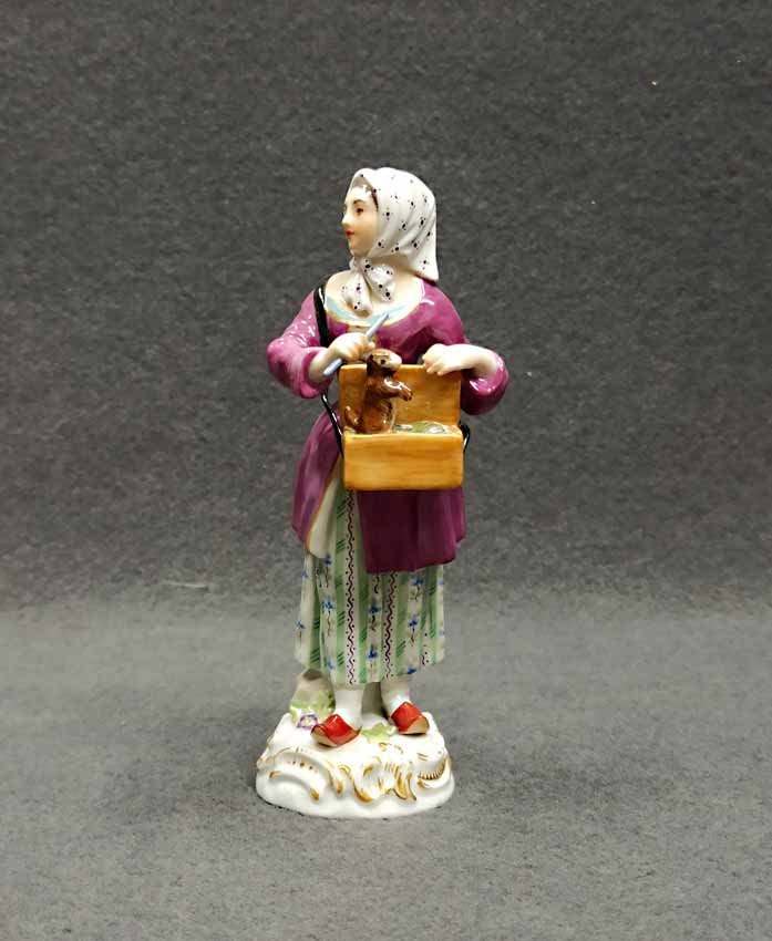 Meissen, "Frau mit Murmeltier",  aus der Serie der Pariser Ausrufer bzw. Chris de Paris. Entwurf: Johann Joachim Kaendler im 18.Jh. hier Ausformung vom Ende des letzten Jh. H. 14 cm, Mod.Nr 60243. Sehr guter Zustand ohne Beschädigungen, keine Restaurierungen. Schwertermarke der Manufaktur Meissen ohne Schleifstriche, 1. Wahl.