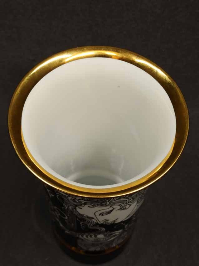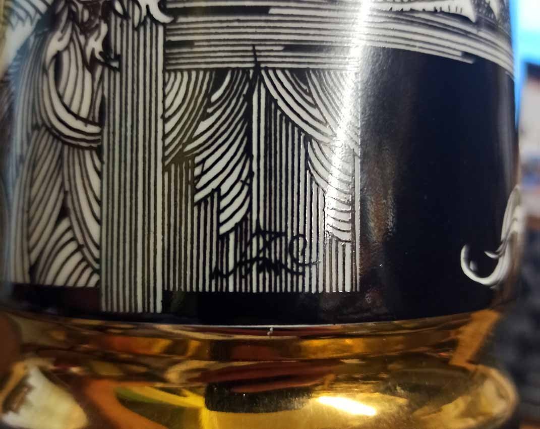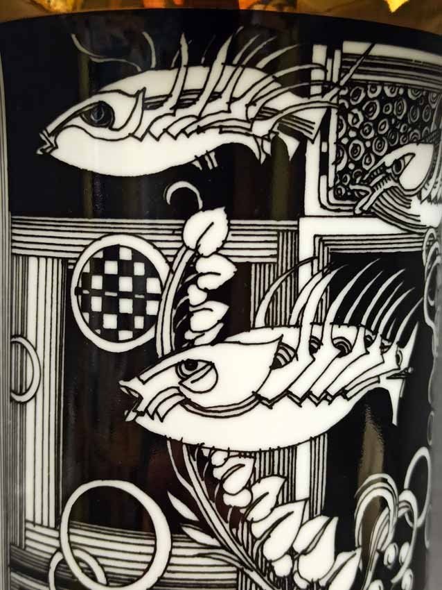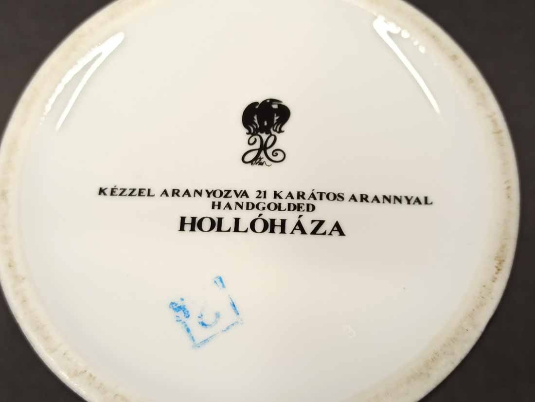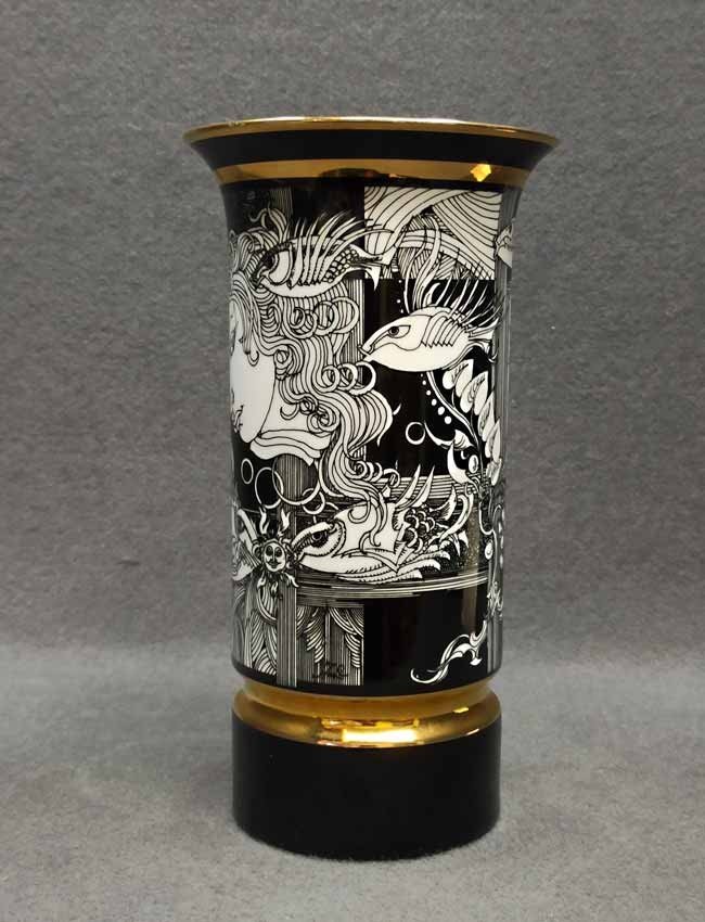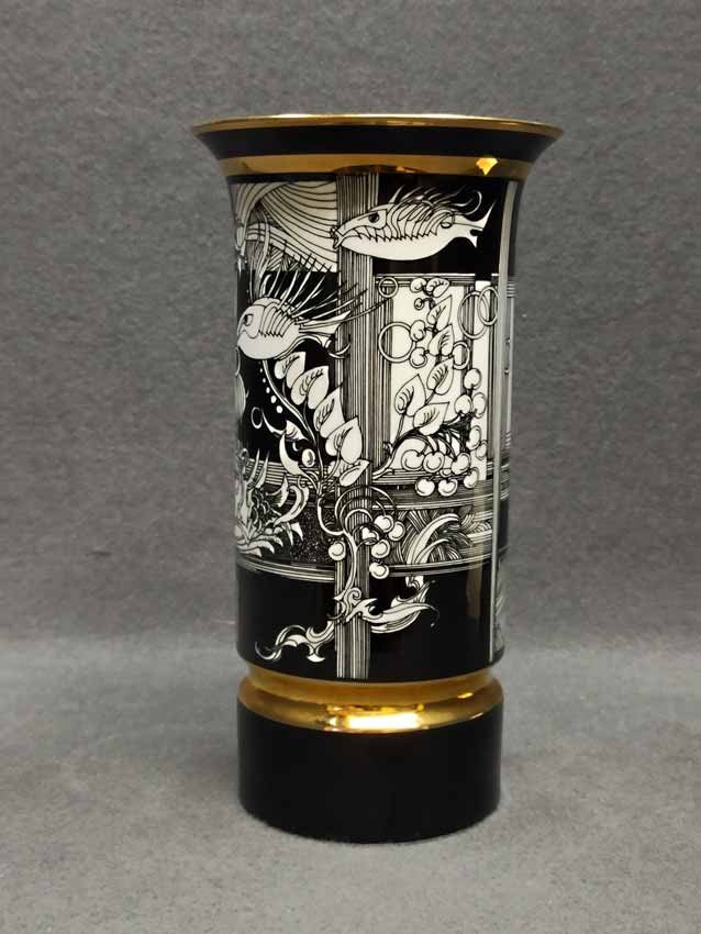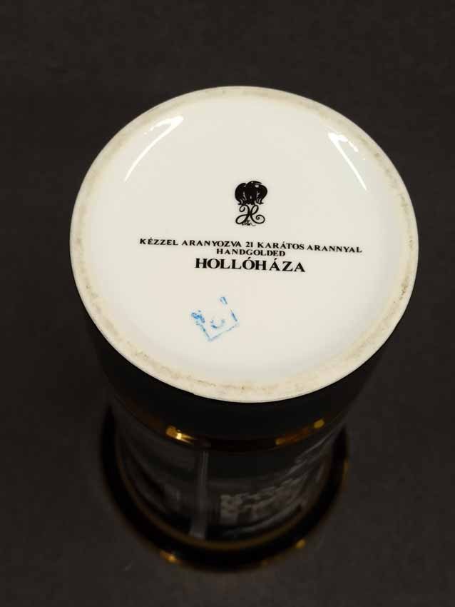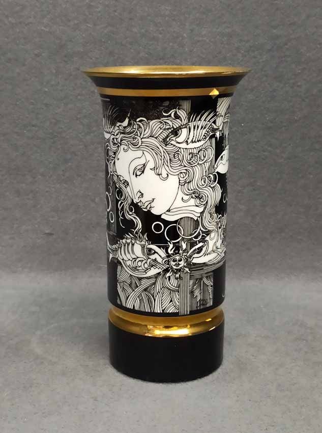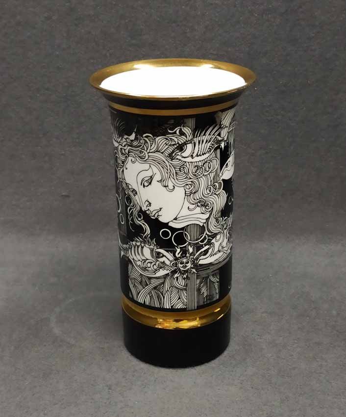 Reserviert! Vase von Hollohaza. Künstler Entwurf Endre Szasz. Im Motiv signiert (siehe Foto). Surrealistisches Motiv mit Frau, Fischen und Pflanzen. Sehr guter Zustand ohne Beschädigungen, keine Gebrauchsspuren. H. 26 cm, D. 14 cm. Gemarkt "Hollohaza" und weiteres, siehe Foto.