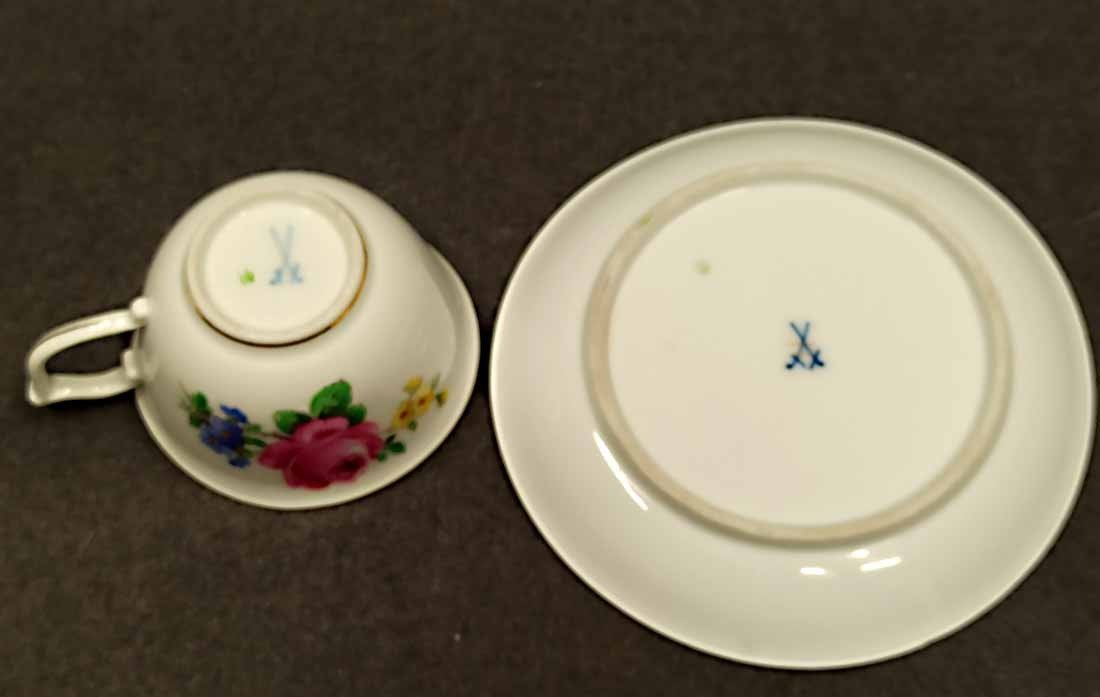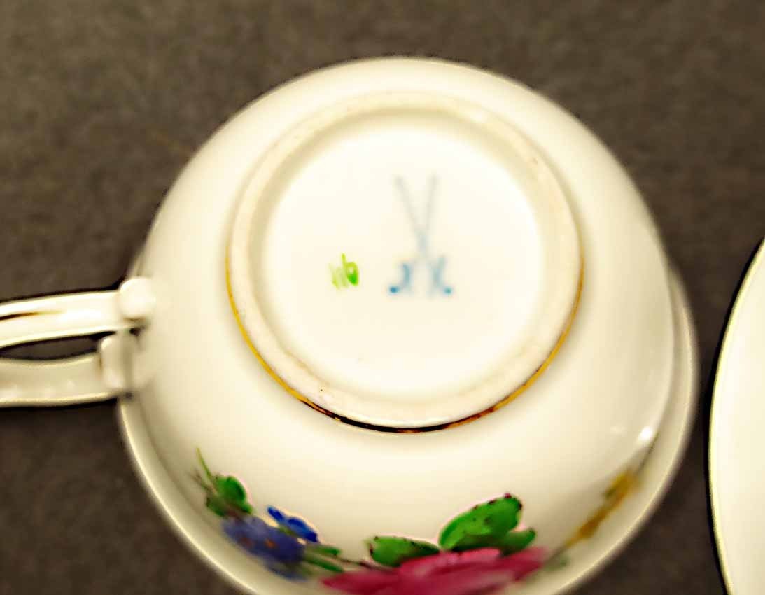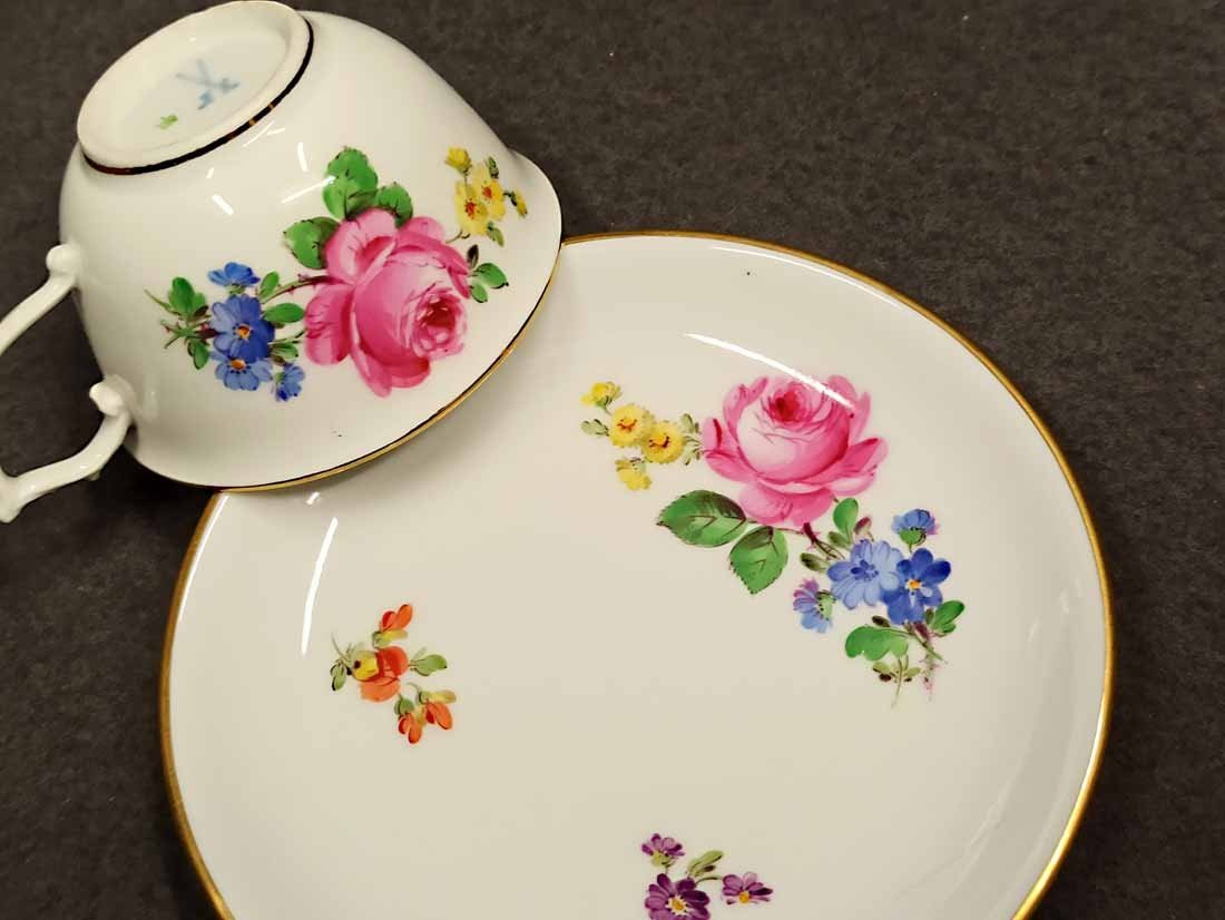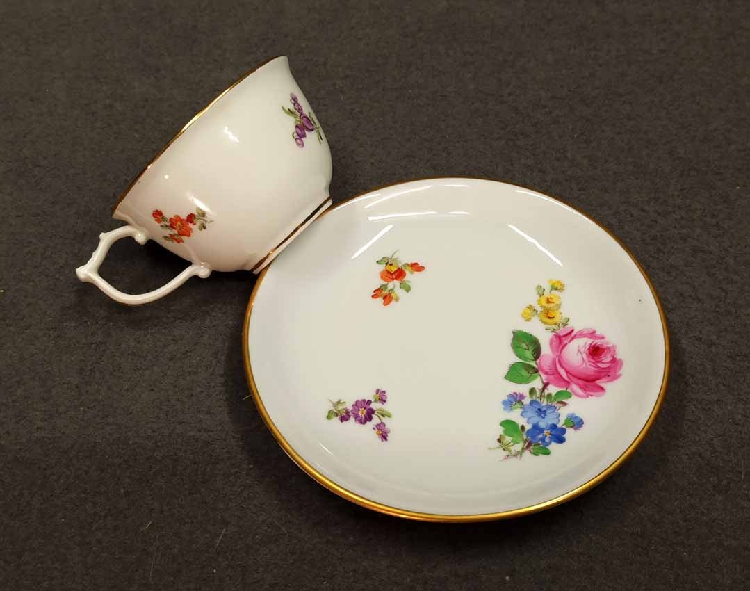 Reserviert! Meissen, kleine Tasse um 1880, Dekor Rosenmalerei mit Streublumen und Goldrändern. Schwertermarke der Manufaktur Meissen, Knaufschwerter um 1880 2x gestrichen. Sehr guter Zustand ohne Beschädigungen. H. 4,5 cm, D. 7,5 cm, D. Unterteller 12,7 cm.