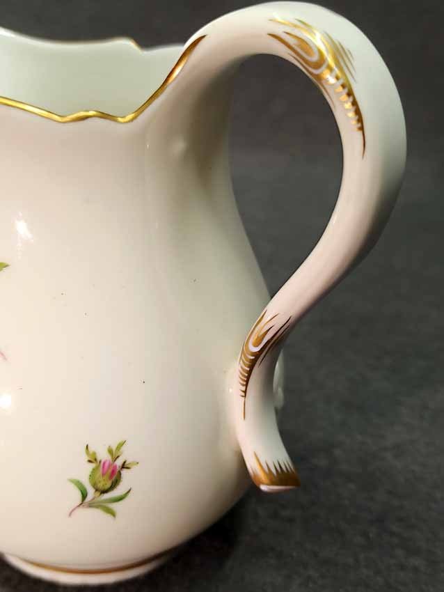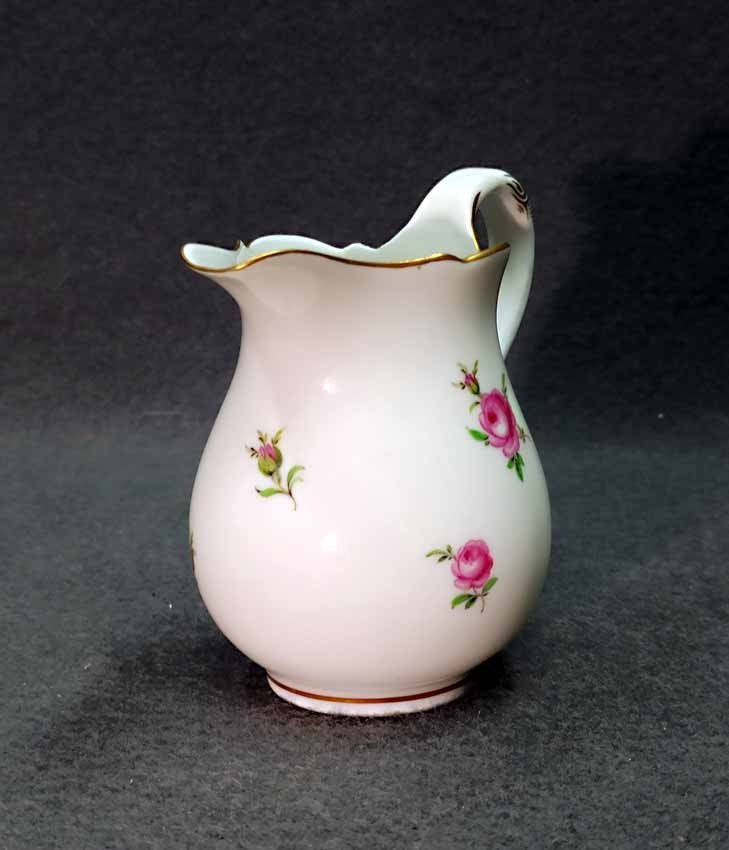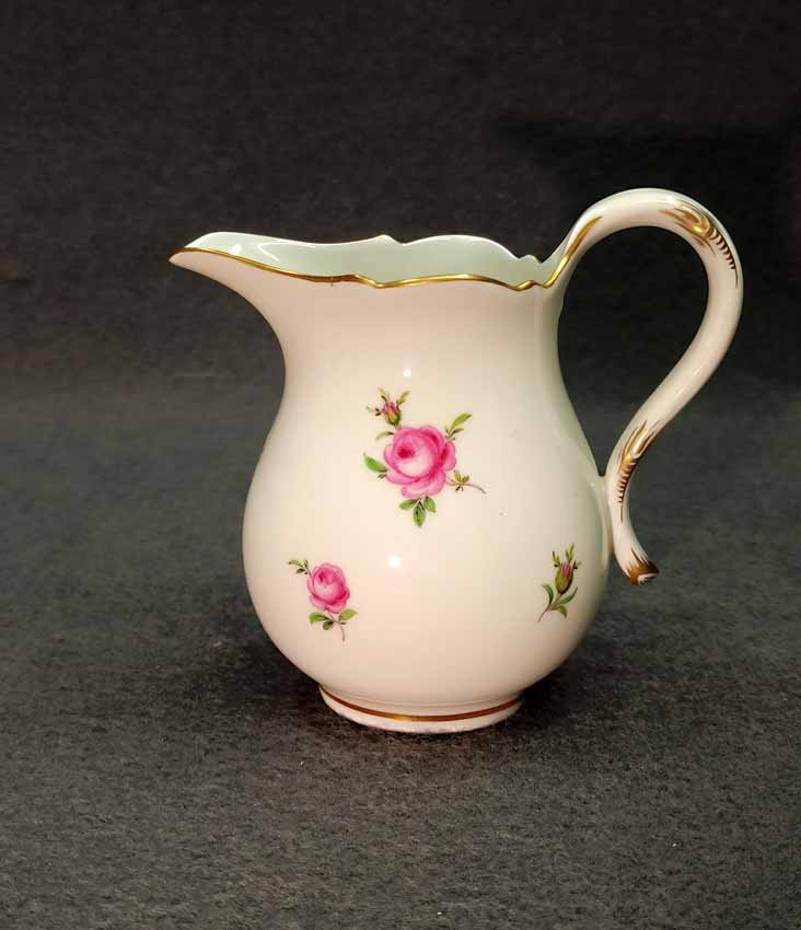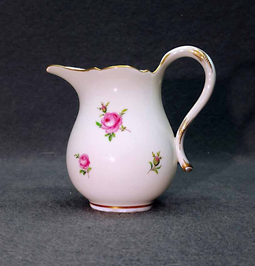 Meissen, Sahne- od. Milchkännchen mit Rosendekor gestreut und Goldstaffage. Sehr guter Zustand ohne Beschädigungen. Schwertermarke der Manufaktur Meissen 4x gestrichen, sogen. Deputat für Mitarbeiter der Manufaktur. H. 11,5 cm.