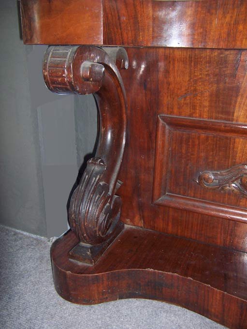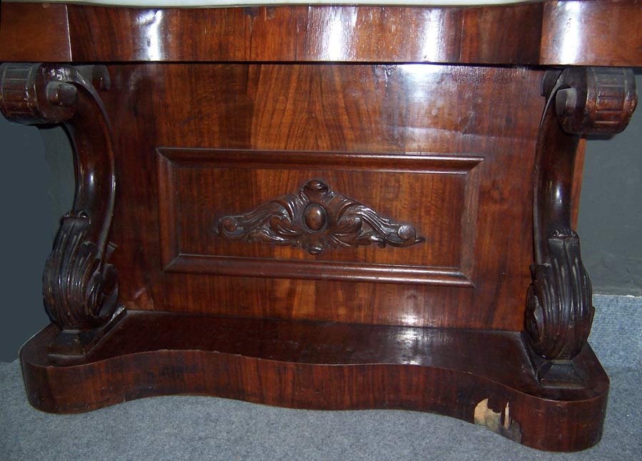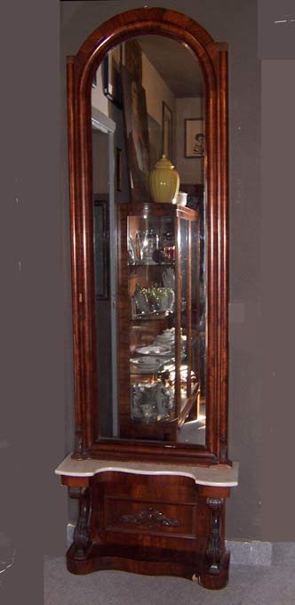 Pfeilerspiegel mit Konsole, Nußbaum furniert. Spätbiedermeier um 1860. Schmaler, hoher Spiegel, gewellter Rand. Zeittypische Verzierungen. Konsole mit geschwungener Marmorplatte, Mittelverzierung und geschnitzten Seitenstützen.