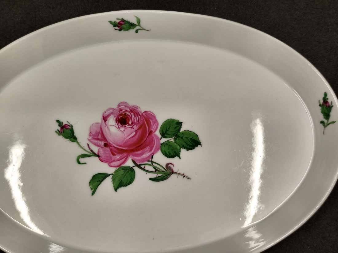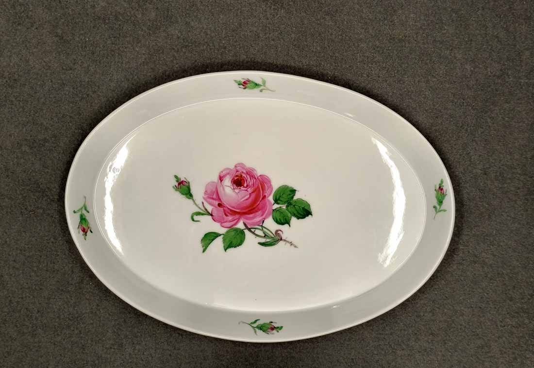 Meissen, Schale oder Tablett, Dekor Rote Rose. Ovale Schale mit Rand, L. x B. 30 x 22 cm, H. 2,5 cm. Sehr guter Zustand ohne Beschädigungen. Herstellungsbedingt der Rand etwas formungenau. Schwertermarke der manufaktur Meissen zwei x gestrichen.